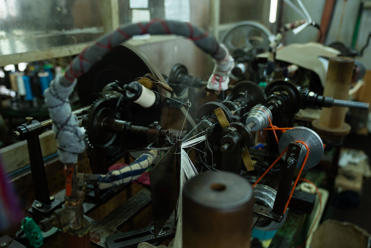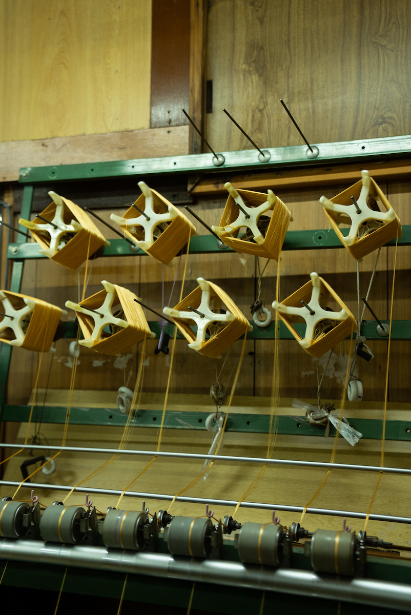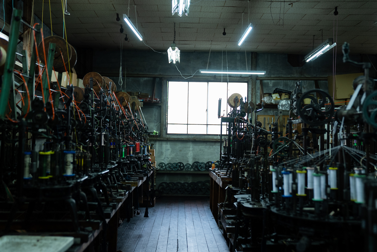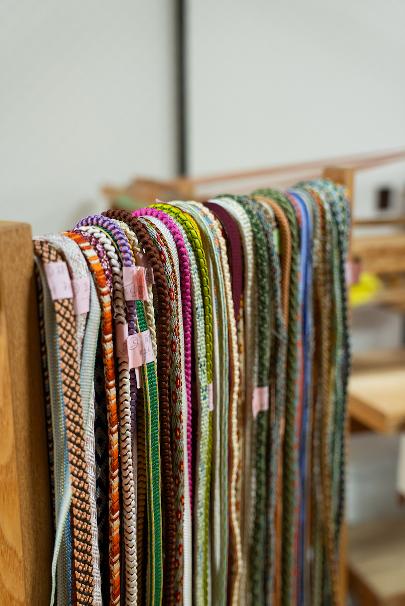 その後、ワークショップのため向かったのが「昇苑くみひも」だ。ここでは、映画「君の名は。」で広く知られるようになった“くみひも”を製造から卸、販売まで手掛け、機械で組む“機械組”と、伝統技法を継承する“手組”の二本柱でものづくりを行っている。まず案内されたのは、工場内で稼働する“機械組”の工程。約70年前から動き続けているという製紐機(せいちゅうき)が、寸分の狂いもない一定のリズムで紐を組み上げていく様子は圧巻で、量産における合理性と、長年にわたり受け継がれてきた技術の蓄積を同時に感じさせた。一方“手組”の工程では、熟練の職人たちが繊細な手捌きで紐を組むことで、“機械組”と比べて太さやデザイン表現の自由度が高く、それぞれのメリットがあるという。