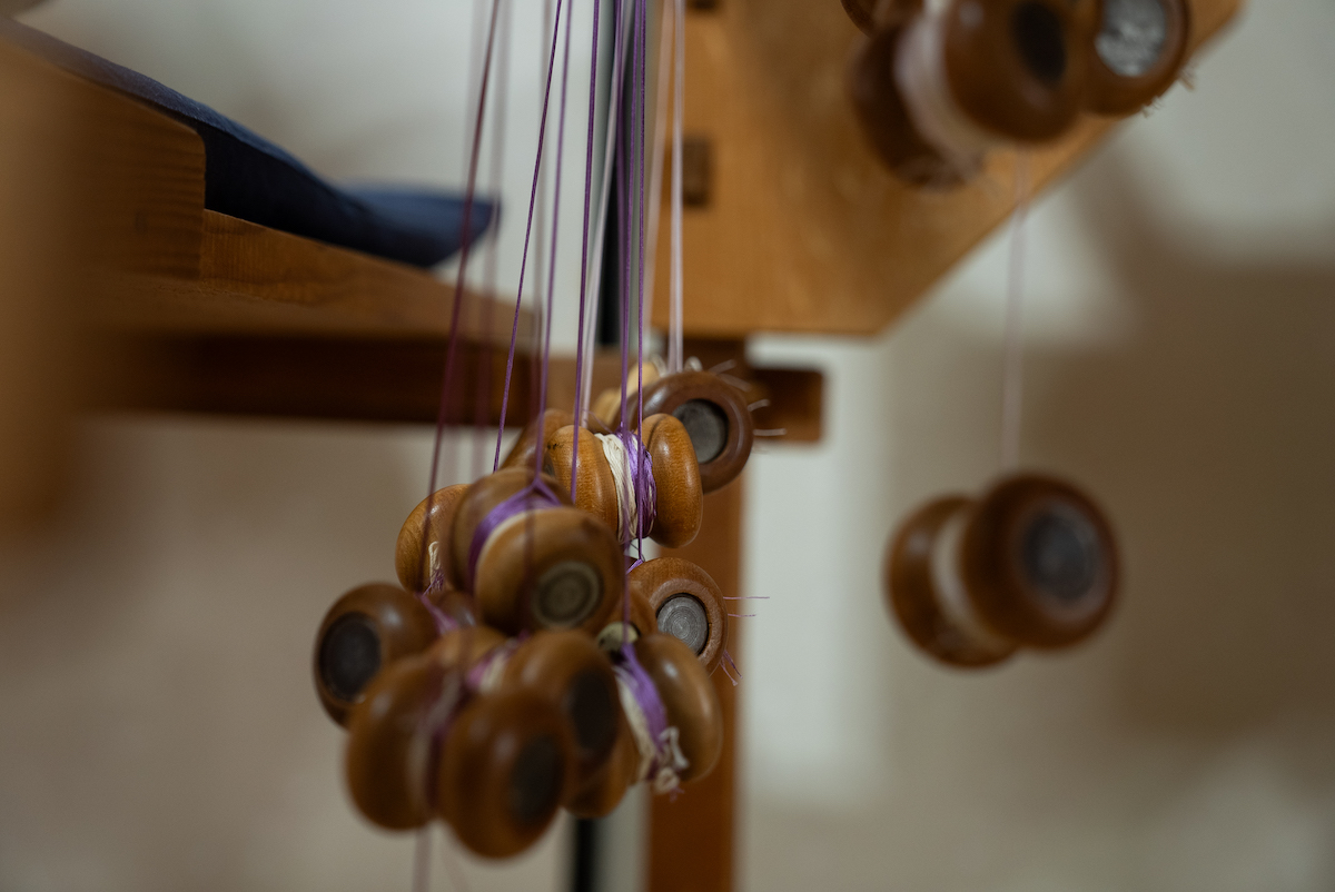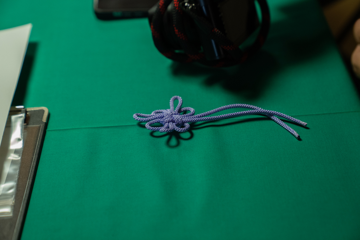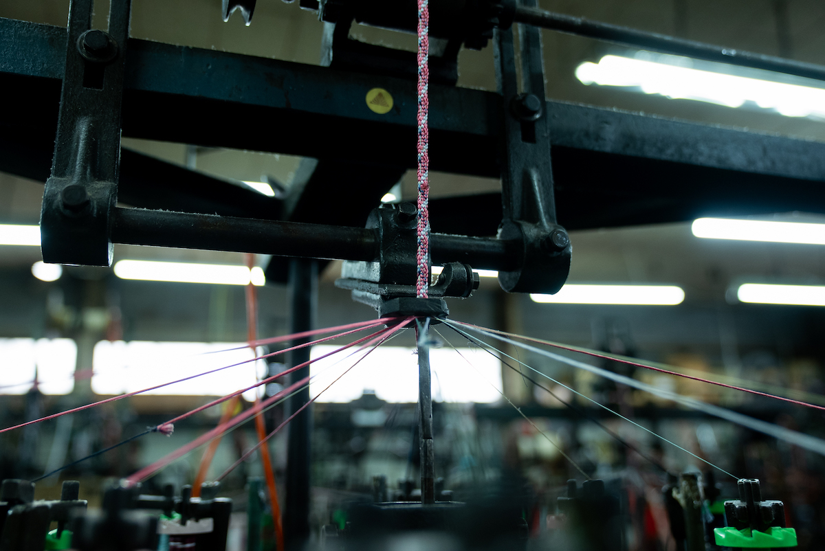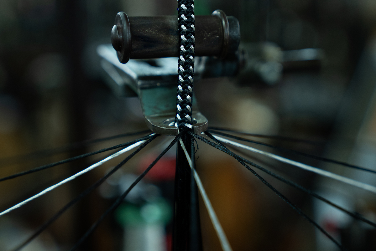 その後、ワークショップのため向かったのが「昇苑くみひも」だ。ここでは、映画「君の名は。」で広く知られるようになった“くみひも”を製造から卸、販売まで手掛け、機械で組む“機械組”と、伝統技法を継承する“手組”の二本柱でものづくりを行っている。まず案内されたのは、工場内で稼働する“機械組”の工程。約70年前から動き続けているという製紐機(せいちゅうき)が、寸分の狂いもない一定のリズムで紐を組み上げていく様子は圧巻で、量産における合理性と、長年にわたり受け継がれてきた技術の蓄積を同時に感じさせた。一方“手組”の工程では、熟練の職人たちが繊細な手捌きで紐を組むことで、“機械組”と比べて太さやデザイン表現の自由度が高く、それぞれのメリットがあるという。
