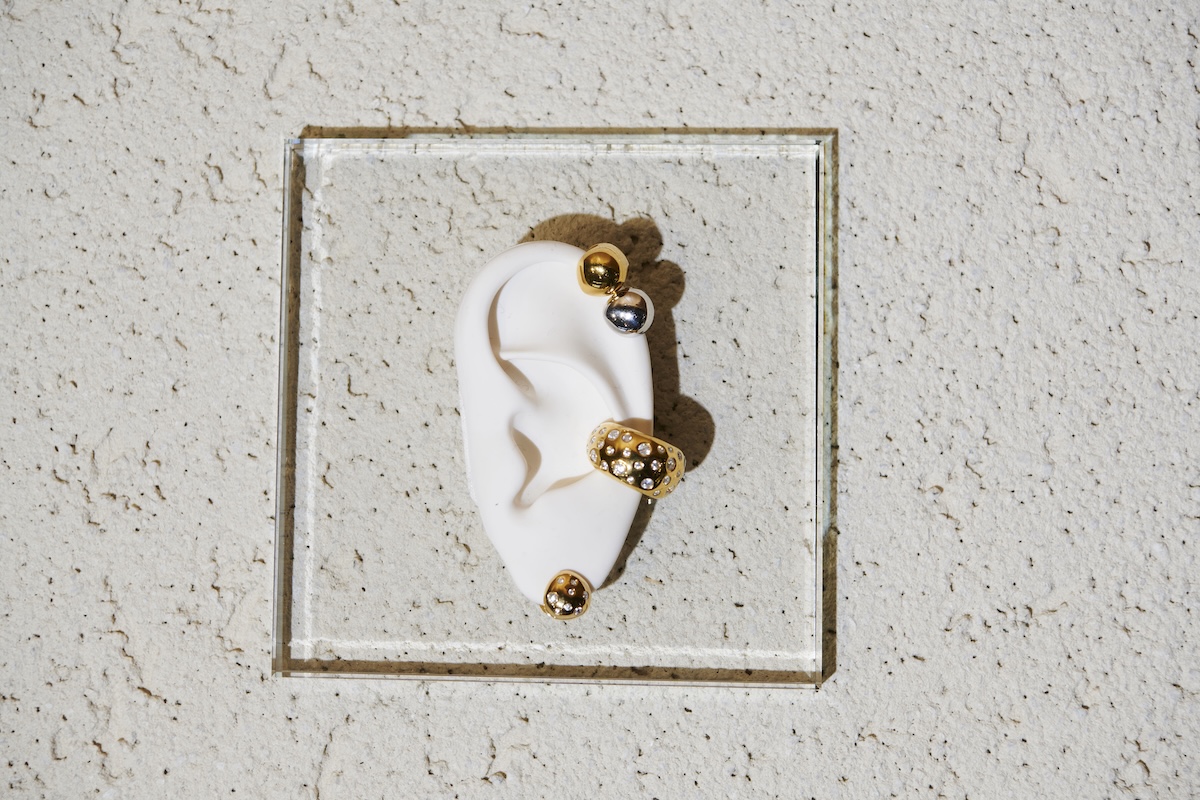 17年には、本格的に“ピアッシング”コレクションを発表し、店内にスタジオを導入したことで、さらにビジネスが加速した。“ピアッシング”とは、ピアスの穴を開けること。「マリア ブラック」のスタジオでは、解剖学的な専門知識を持ったプロが、それぞれの人の顔、耳などのバランスを見ながら施術を行い、14金のピアスを提案する。「“耳の専門家”へと舵を切ることで、ジュエリーを“共有体験”にすることができた。ピアスを反抗の象徴ではなく、洗練された美容儀式として再定義するのが目的だ」。日本では、医療機関での施術が中心で、位置やバランスは考慮されないことがほとんど。そのため、スタイリングの自由度や複数着用した際の美しさが制限されるケースが多い。ブラックは、「審美眼の高い日本人にブランドを通して、ラグジュアリーな耳のキュレーション体験を届けたい」とほほえむ。