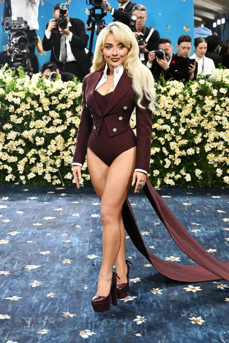 5月に開催された「メットガラ」では、パンツレスルックで登場し大きな話題を呼んだ。バーガンディカラーのピンストライプのテールコート、ピンストライプのボディースーツは、「ルイ・ヴィトン(LOUIS VUITTON)」によるカスタム衣装。同色のプラットフォームシューズと「ショパール」のゴールドのジュエリーを合わせてコーデを完成させた。