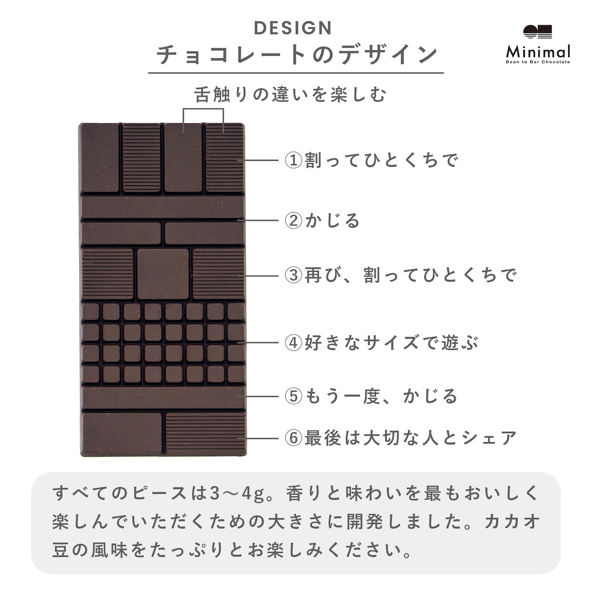 「ミニマル」は現在、富ヶ谷と代々木上原に2店舗を構えており、“パティスリー”では初のパティスリースイーツを提供する。世界のカカオ産地を訪れ、良質なカカオ豆から職人が手仕事でチョコレートの製造をしている。「ミニマル」のチョコレートの原材料は、カカオと砂糖のみで、そのほかの副原料は一切使用していない。