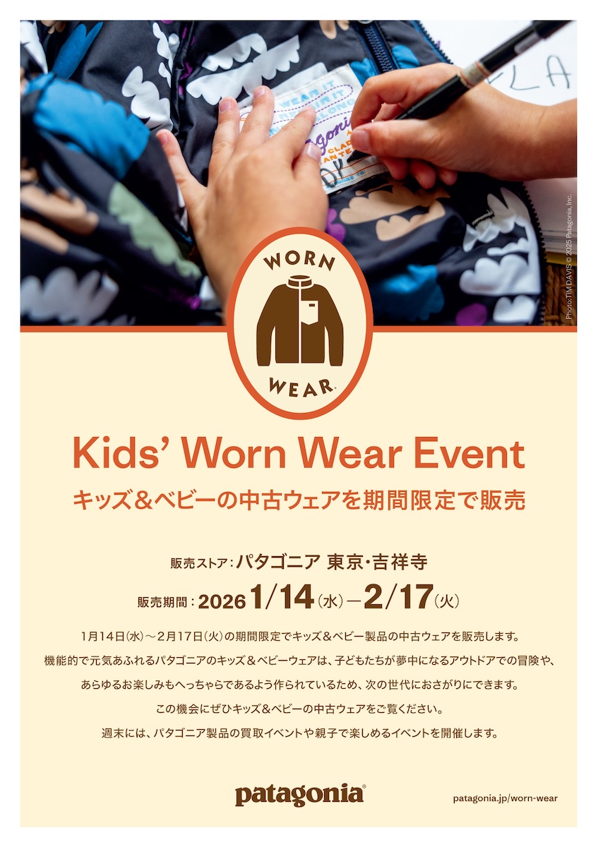 「パタゴニア(PATAGONIA)」は1月14日〜2月17日の期間、二子玉川店と吉祥寺店でベビーおよびキッズ向け中古ウエアの販売を実施する。耐久性と機能性を備え、「おさがりにできる作り」を掲げる同社製品を次世代へと引き継ぐ取り組みだ。