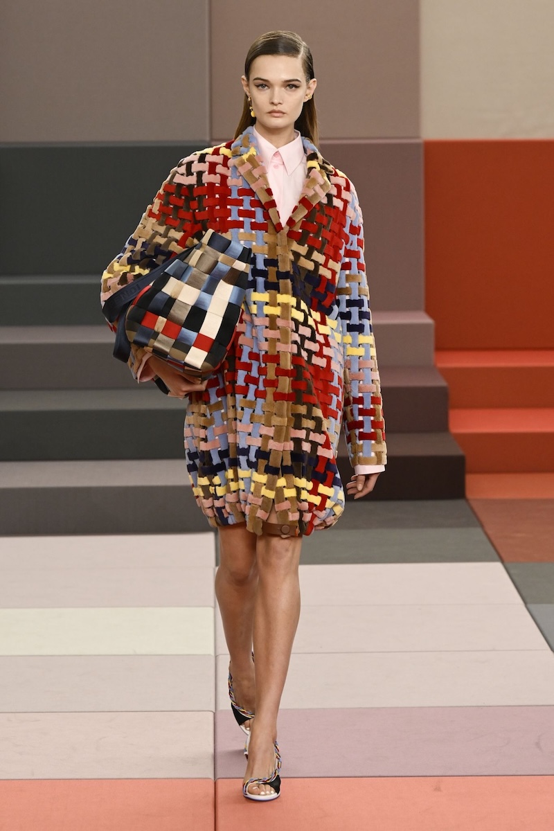 「フェンディ(FENDI)」は、マルチカラーので構成した編み込みジャケットを装いの主役に据えました。カラフルな彩りが春夏ルックを軽やかに弾ませています。同じ配色で編み込んのだバッグを正面寄りに抱え持ちすることで、スタイリングに統一感を演出。。編み込みパーツはが服よりも大きめに設計されておりで、異なるサイズの違いが装いに心地よいリズム感をもたらしまとわせました。