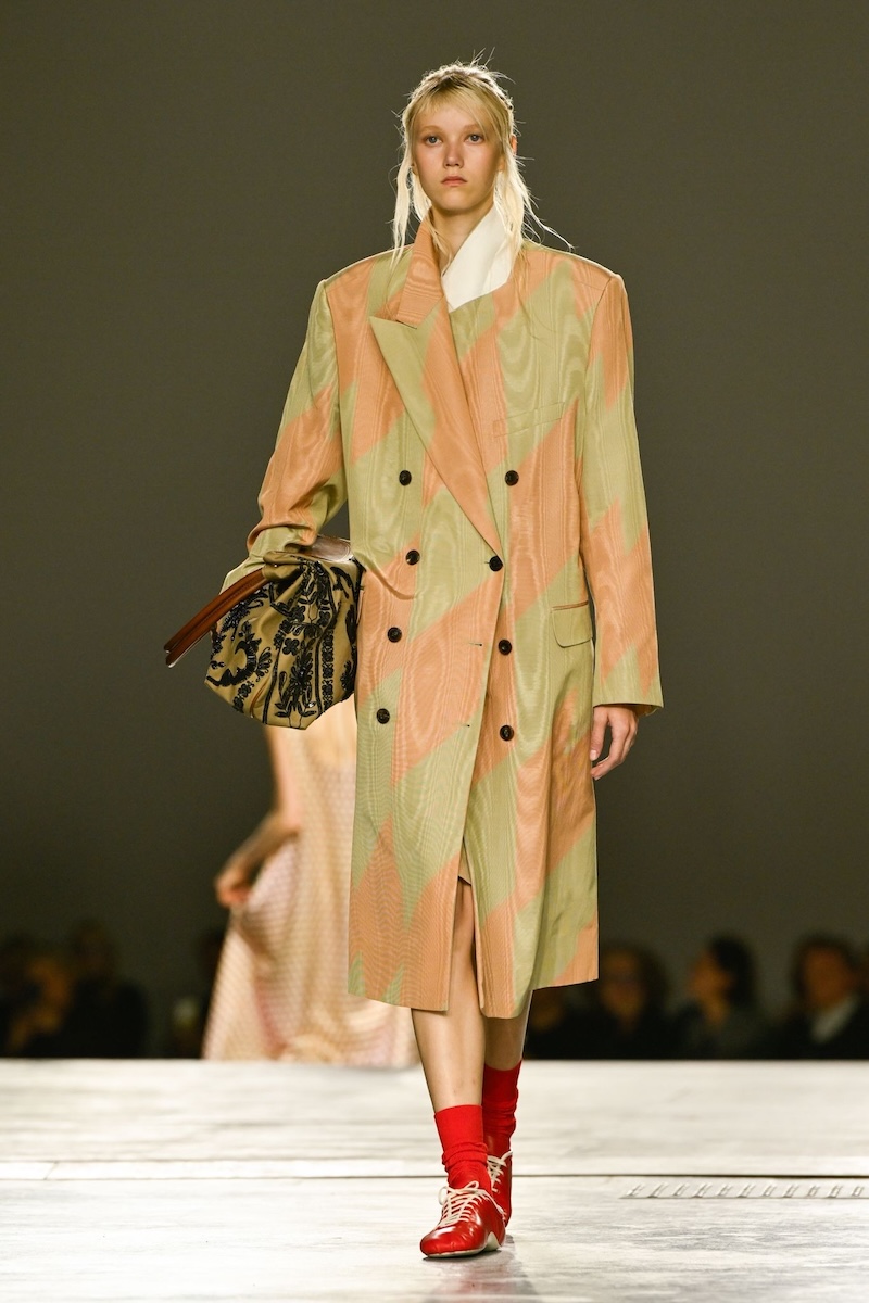 むら染め風うぐいす色と淡いオレンジ色のロングコートを提案したのは、「ドリス ヴァン ノッテン(DRIES VAN NOTEN)」。植物モチーフのビーズの刺しゅう繍をが施しされた、手仕事の技が際立つ印象的なバッグを、コートの脇に抱え持ちしました。持ち手の付け根あたりで軽く一折り。大きなバッグの場合であってでも、持ち手の付け根あたりで軽く一折りこのようにすることで、抱え持ちの雰囲気と相まって、エフォートレスな印象が生まれ備わります。