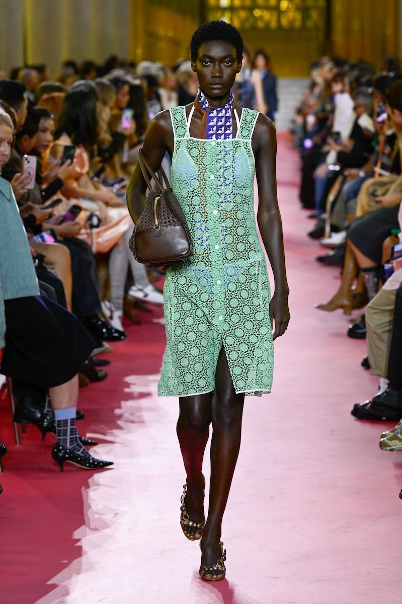 「ミュウミュウ(MIU MIU)」のルックは、レース仕立てのノースリーブ・ワンピースを、涼やかしげなシャーベットトーンで彩りました。大ぶりのボストンは、脇下のの高めポジションにセットし、自然と。視線を引き上げています。持ち手に腕を通して、ボディーに引き寄せ抱え込むことで、、コンパクトな持ち姿に。レースとレザーというに異素材コンビネーションが際立ち、装いのいっそうおしゃれ感をさらに高めていまが増す仕掛けです。