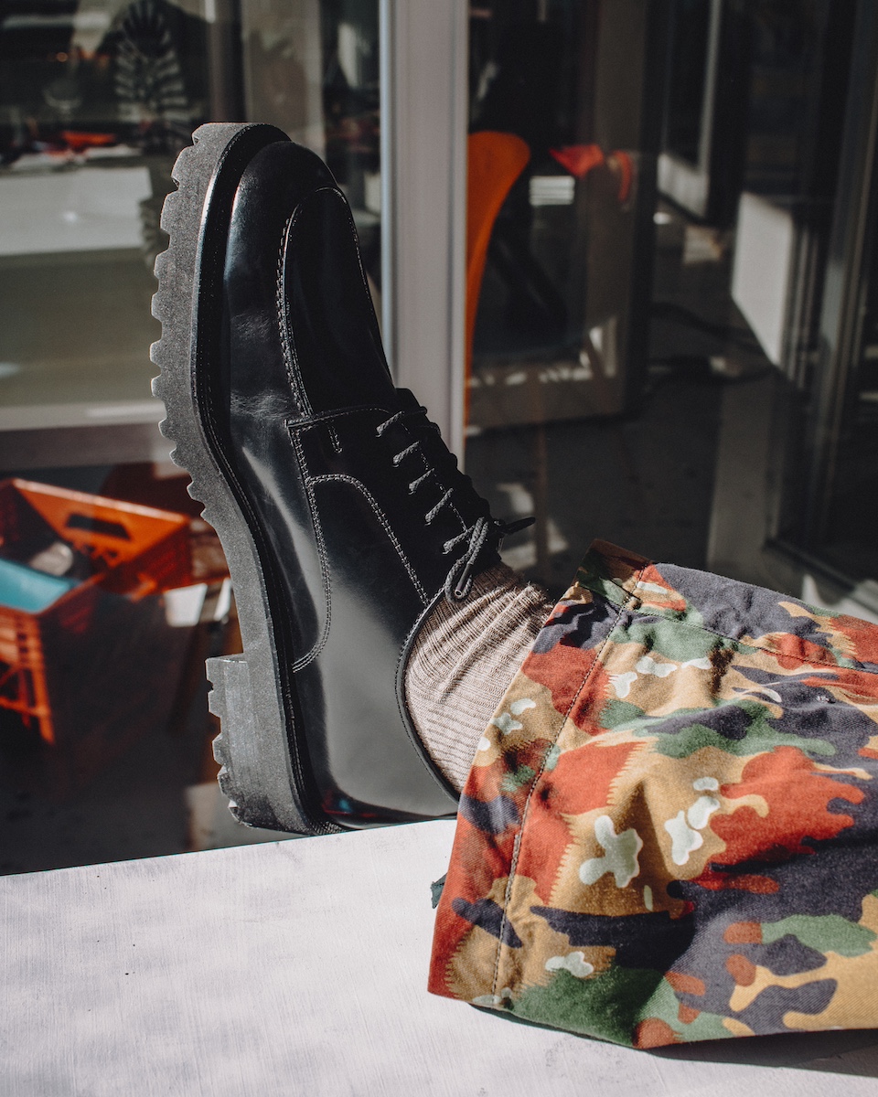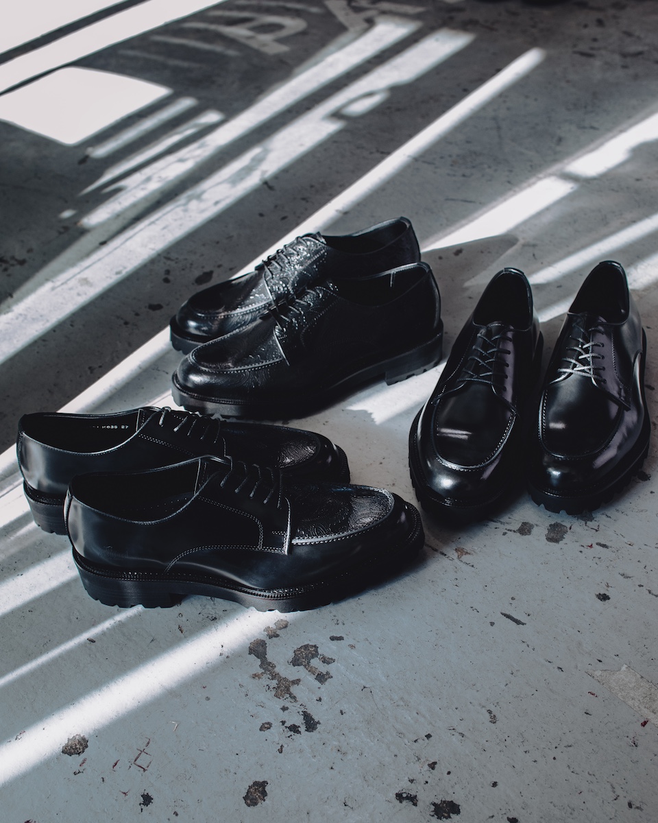 新店舗では、重厚でクラシックな革靴店のイメージを刷新。無機質でインダストリアルな空間デザインを採用し、剥き出しの素材感と現代的な感性が交差する空間に仕上げた。ブランドの世界観を体感できると同時に、「既存の革靴の価値観を壊し、新しい未来を創り出す」というブランドのアティチュードを体現する場となる。