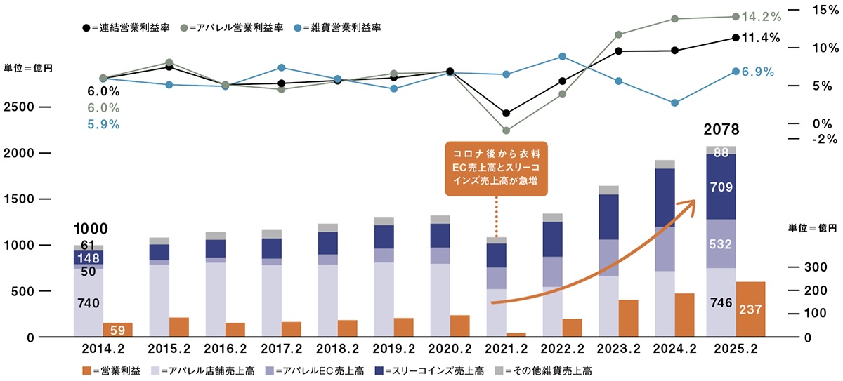 今回は40以上のブランドを運営しながら着実に成長するパルグループを決算書から読み解きます。2025年2月期の連結売上高は前期比7.9%増の2078億円で、営業利益は27.1%増の236億円と好調です。