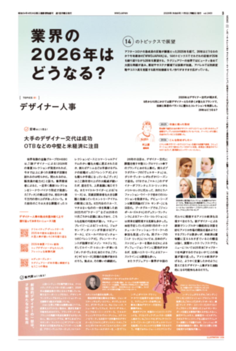 今回は「デザイナー人事」「ラグジュアリー」「M&A」「百貨店」「素材&商社」「サステナビリティ」「大手アパレル」「ウィメンズ」「メンズ」「ジュエリー」「海外ビューティ」「国内ビューティ」「ビューティ小売り」それに「ヘアサロン」という14のトピックスで26年を大展望しました。それぞれのトピックについて「WWDJAPAN」の記者が忖度なしに今年を大胆予測したほか、各ページでは専門家にも意見を仰ぎ、同じトピックを違う角度からも分析しています。それぞれのカテゴリーでは今何が起こっていて、私たちは今年1年のニュースとどう向き合えばいいのか?そんな14の道標にぜひ注目してください。