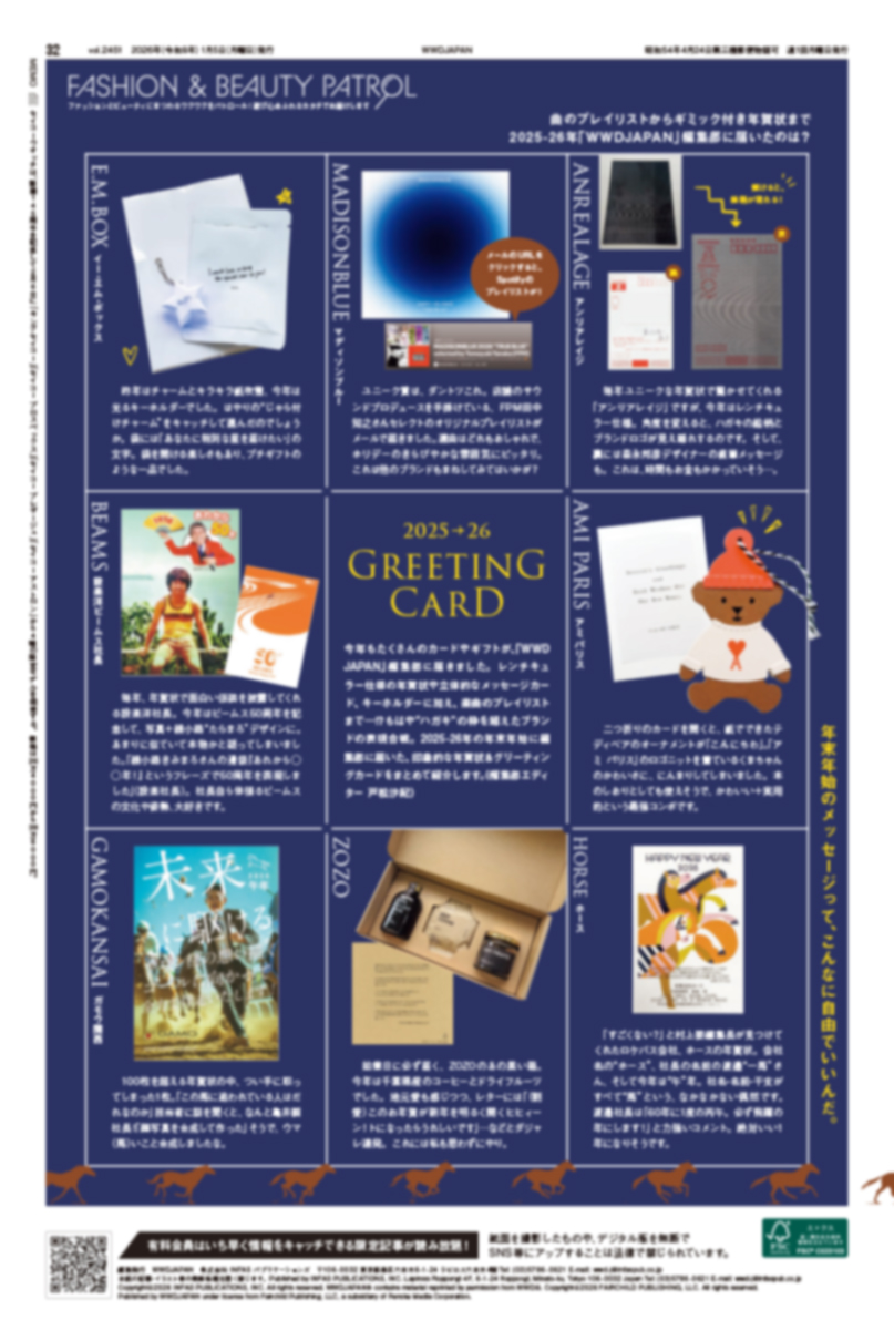 そのほかのページでは、業績不振のブランドを救うM&Aプレイヤーをまとめたり、「ユニクロ(UNIQLO)」や「無印良品」とは違う形で存在感を確立した下着ブランドまとめ、財務諸表などから読み解く「スリーコインズ(3 COINS)」を手掛けるパルグループの真実などに迫りました。ファッション&ビューティ・パトロールでは、2025年のクリスマスから26年の年賀状まで、この冬の素敵&面白グリーティングカードを紹介しています。