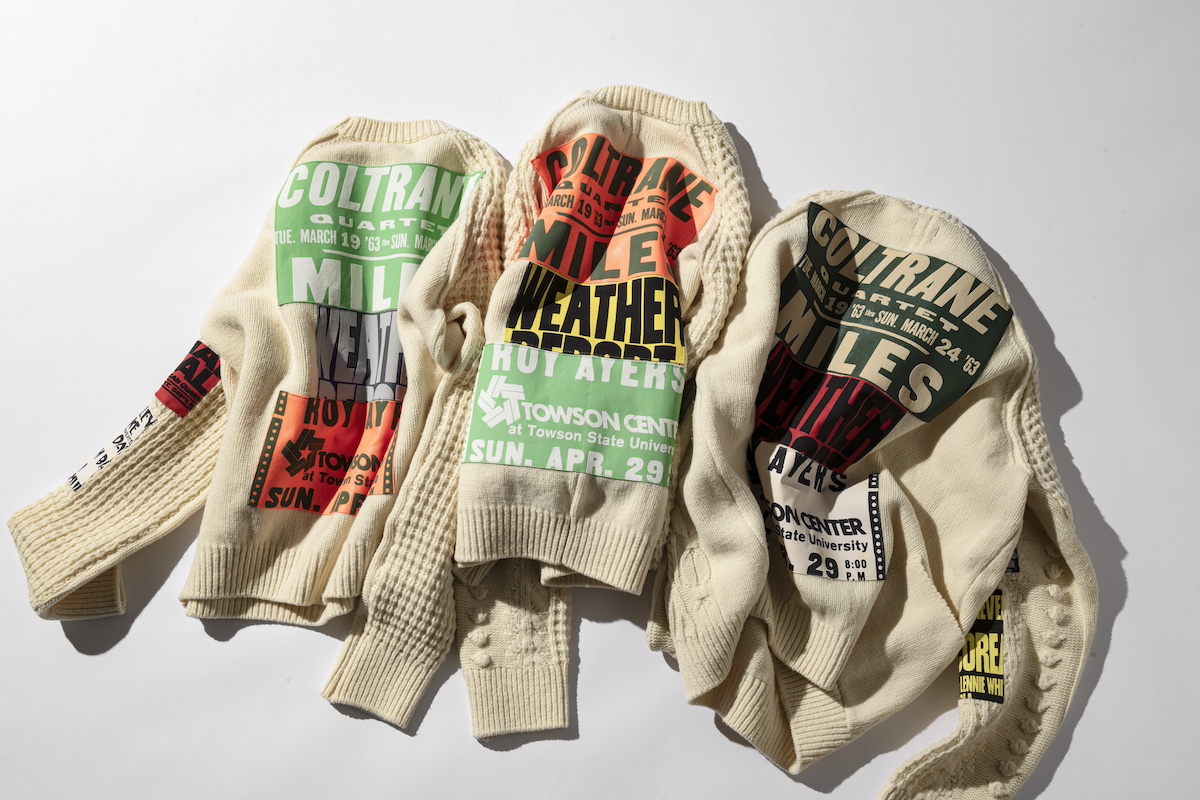ニットは、1960年代を中心に英国で流行したモッズカルチャーに着想を得たラウンドネックセーター。当時の若者がフットボールチームや行きつけのパブのロゴタオルを服に縫い付けてカスタマイズしていた文化をヒントに、両袖と後ろ身頃へジャズレジェンドのコンサートポスターをモチーフにしたパッチをあしらった。パッチは全9種類で、パリの「ディ・ドライベーグ」アトリエでシルクスクリーンプリントを施している。