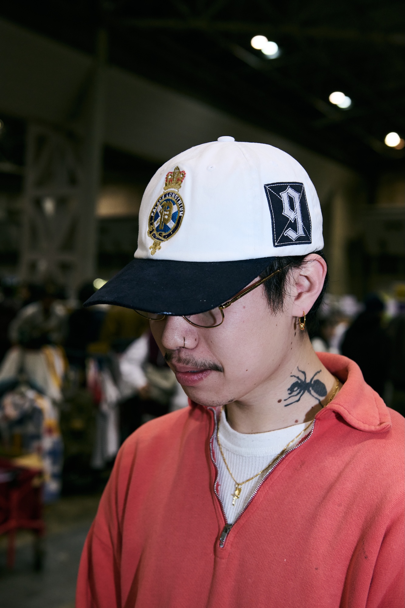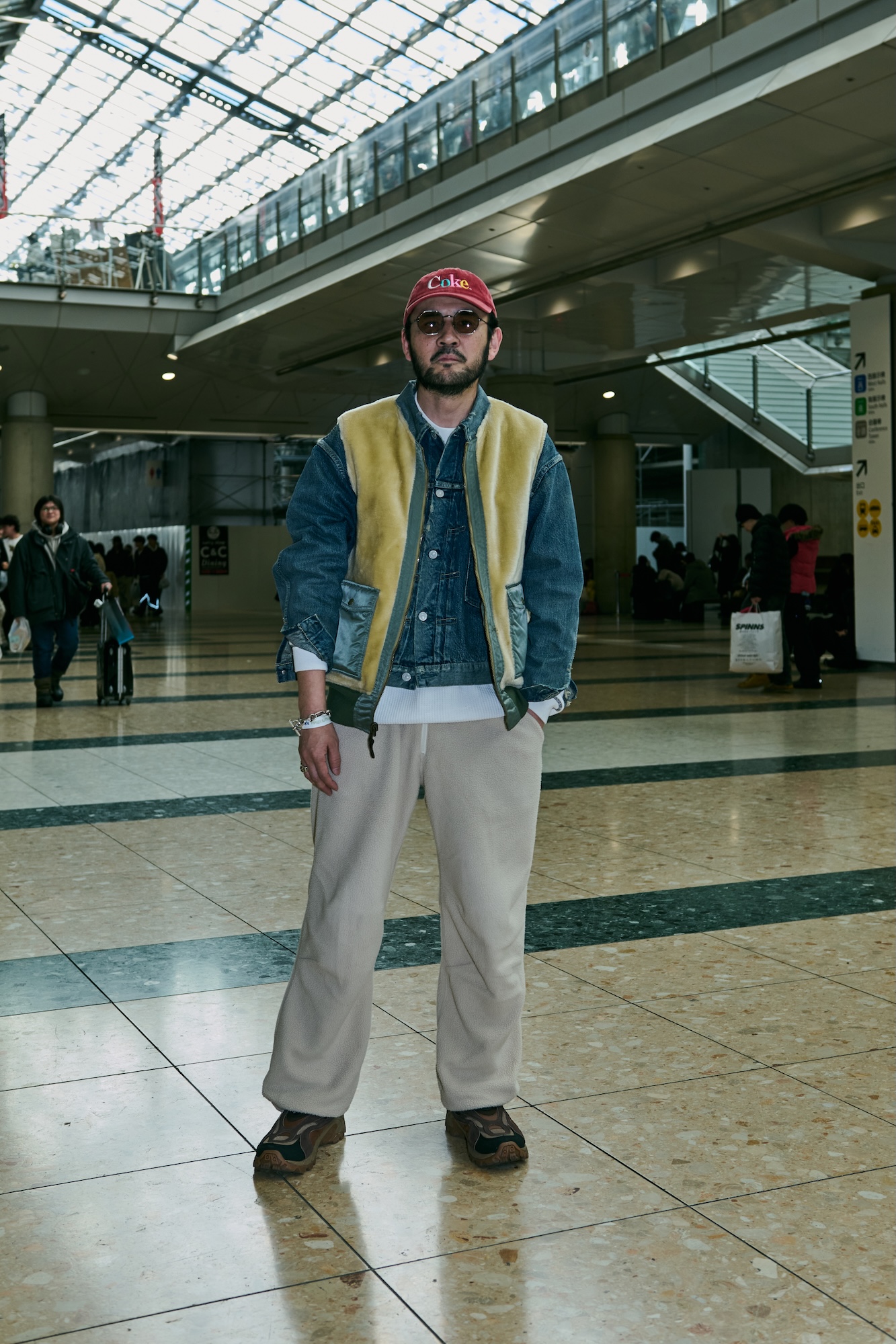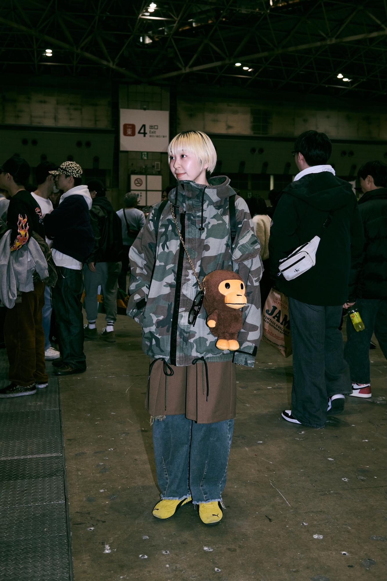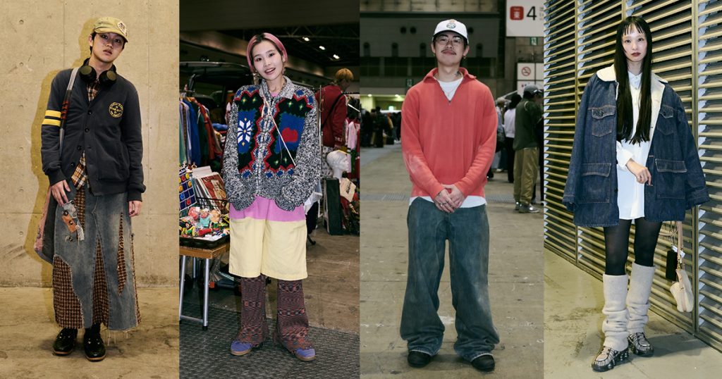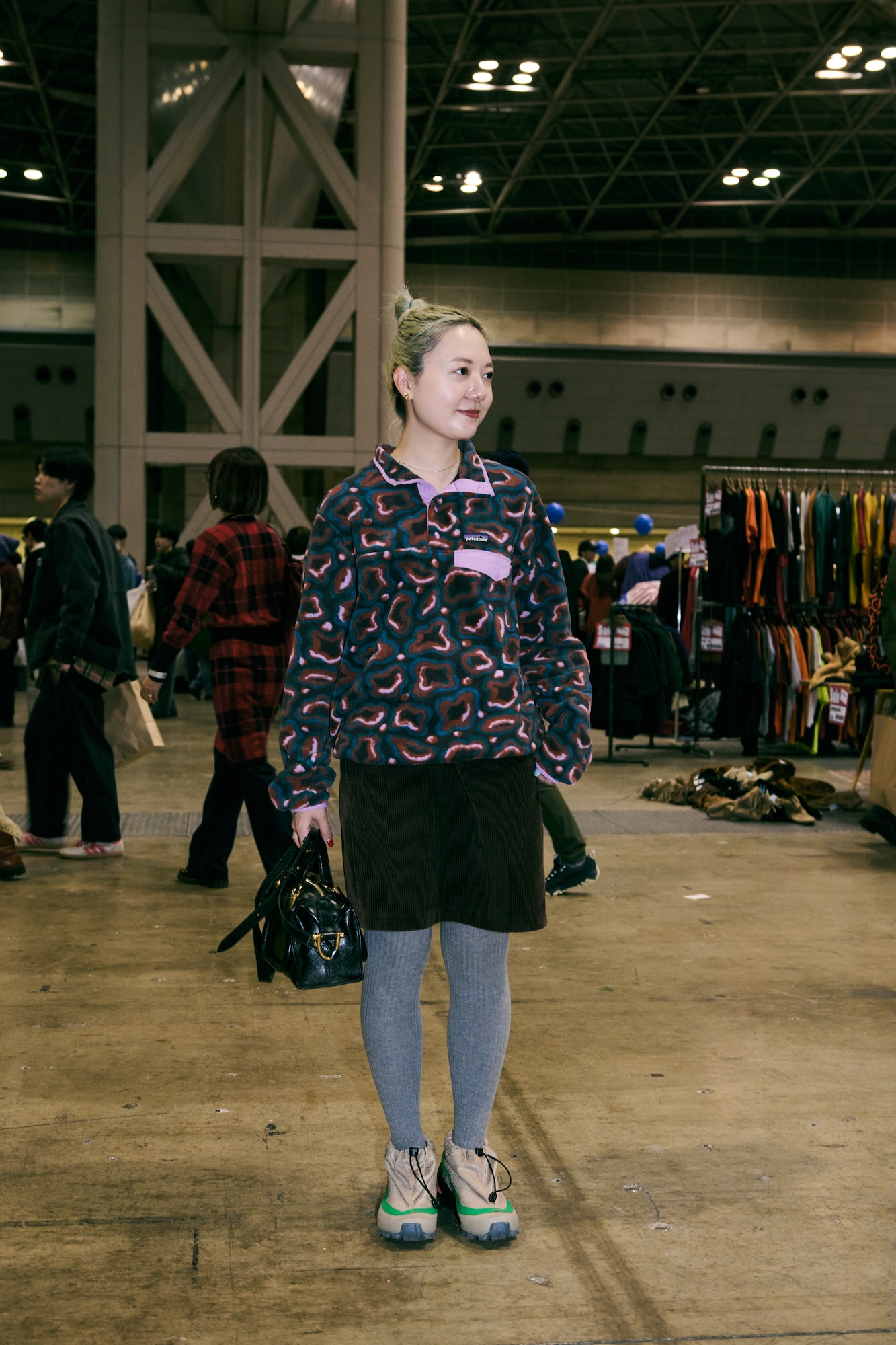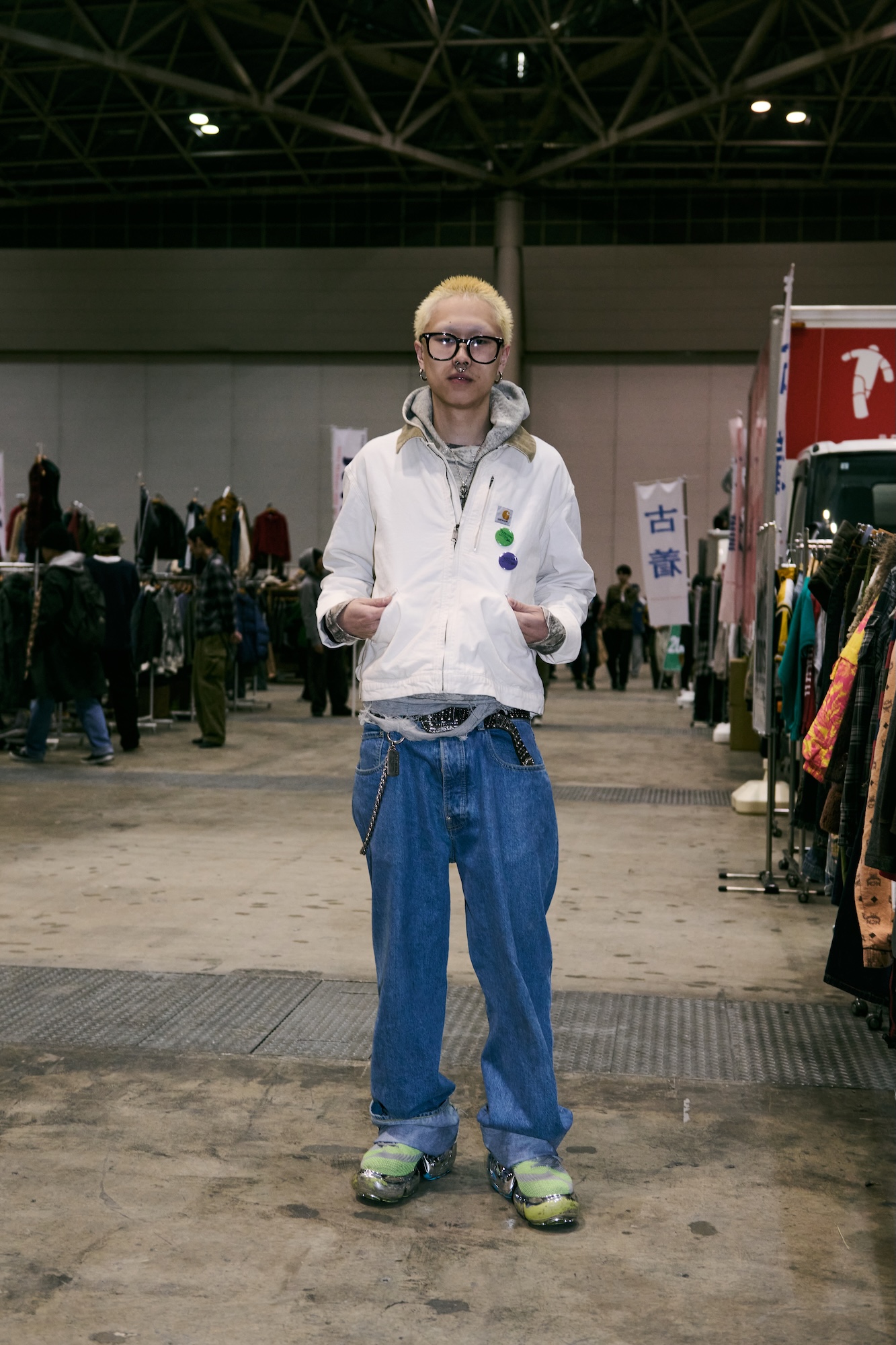 来場者はトップスに古着を取り入れ、足元には昨今注目を集めている「グラウンズ(GROUNDS)」を合わせるなど、古着ミックスのスタイリングを楽しむ人が目立った。色あせたバンドTやジャケットといった定番アイテムに、個性的なフォルムのシューズを合わせることで、ほどよく力の抜けた今っぽい着こなしに仕上げているのが印象的だった。
