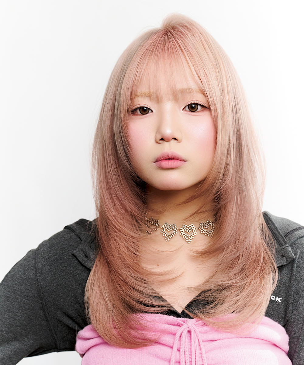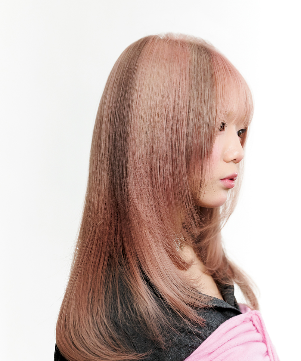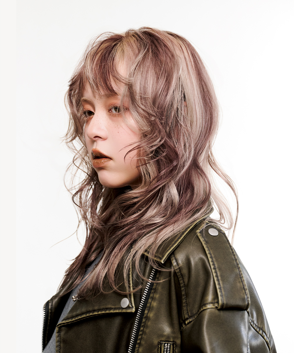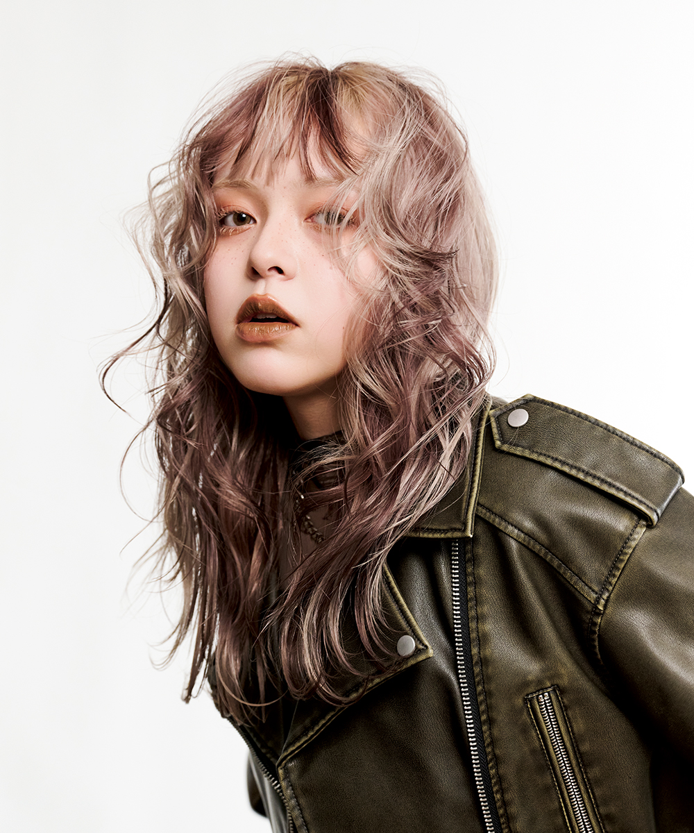 「モデルがキュートな顔立ちなので、かわいさの中にモードを感じるデザインにし、顔のまわりにローライトを入れることで小顔効果を狙った。“サクラベージュ”はハイトーンに薄く入れたい時にすごく向いていて、淡くデリケートな色を出しやすいので、デザインを求める方が多い『ミンクス渋谷店』では、間違いなく人気色になりそう。ブリーチしていない髪に使ってもほんのりと明るく、自然光が当たってピンクを感じる優しい色に仕上がるので、コンサバなスタイルを好む方にもおすすめできる」。