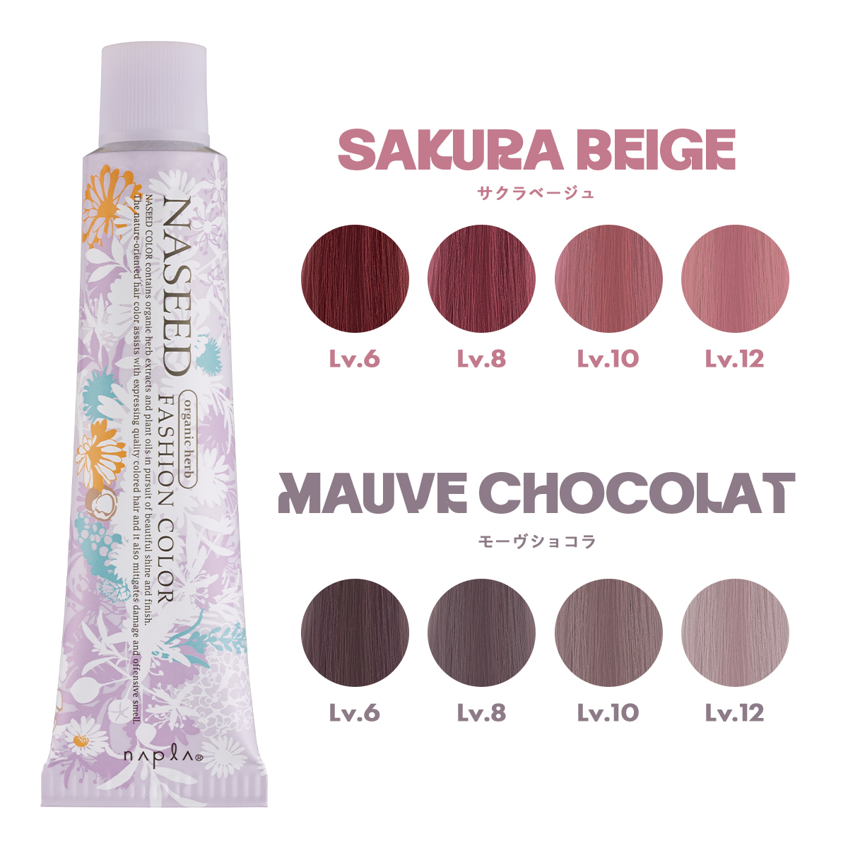 2015年に誕生した「ナシード」は、あらゆるリクエストに応える31色相からなる豊富なカラー展開を誇り、シードオイルとハーブエキスを配合して潤いに満ちた艶のある質感を実現するヘアカラーだ。その汎用性と満足度の高さから、トレンドサロンからファミリーサロンまで全国の美容室で愛用されている。今春の新色“サクラベージュ”は濃密発色の“艶ピンクベージュ”。ピンクの彩度とベージュ感のバランスにこだわり、狙い通りのピンク+ベージュを1本でかなえるカラー。ブリーチ毛に対しては鮮やかさと透け感が楽しめ、ブリーチなしでは濃さのある色合いが表現できる。また、ベージュを含んだ色のため、ファーストグレイ世代にもナチュラルな仕上がりとなる。