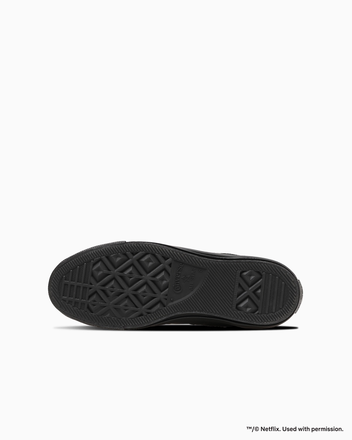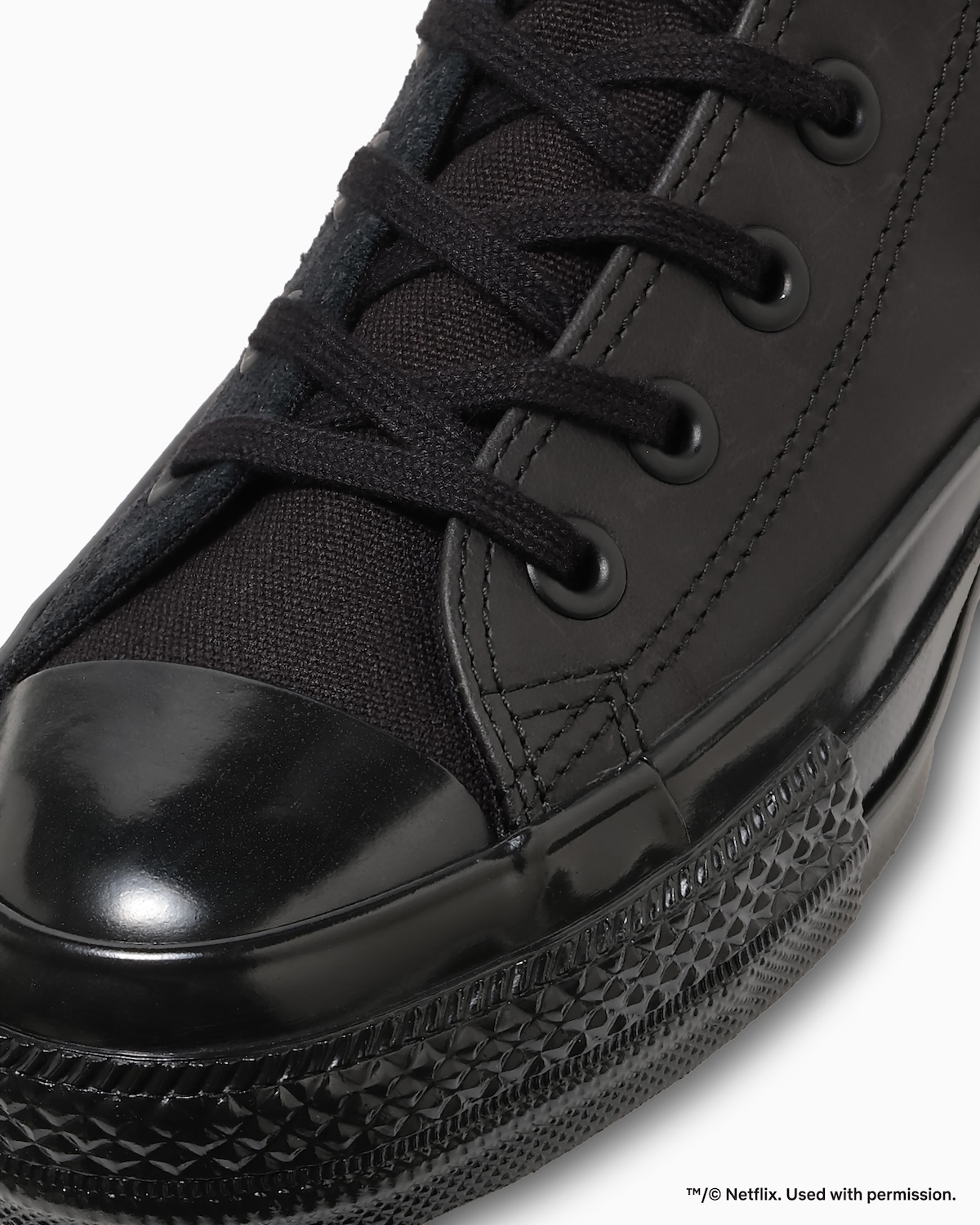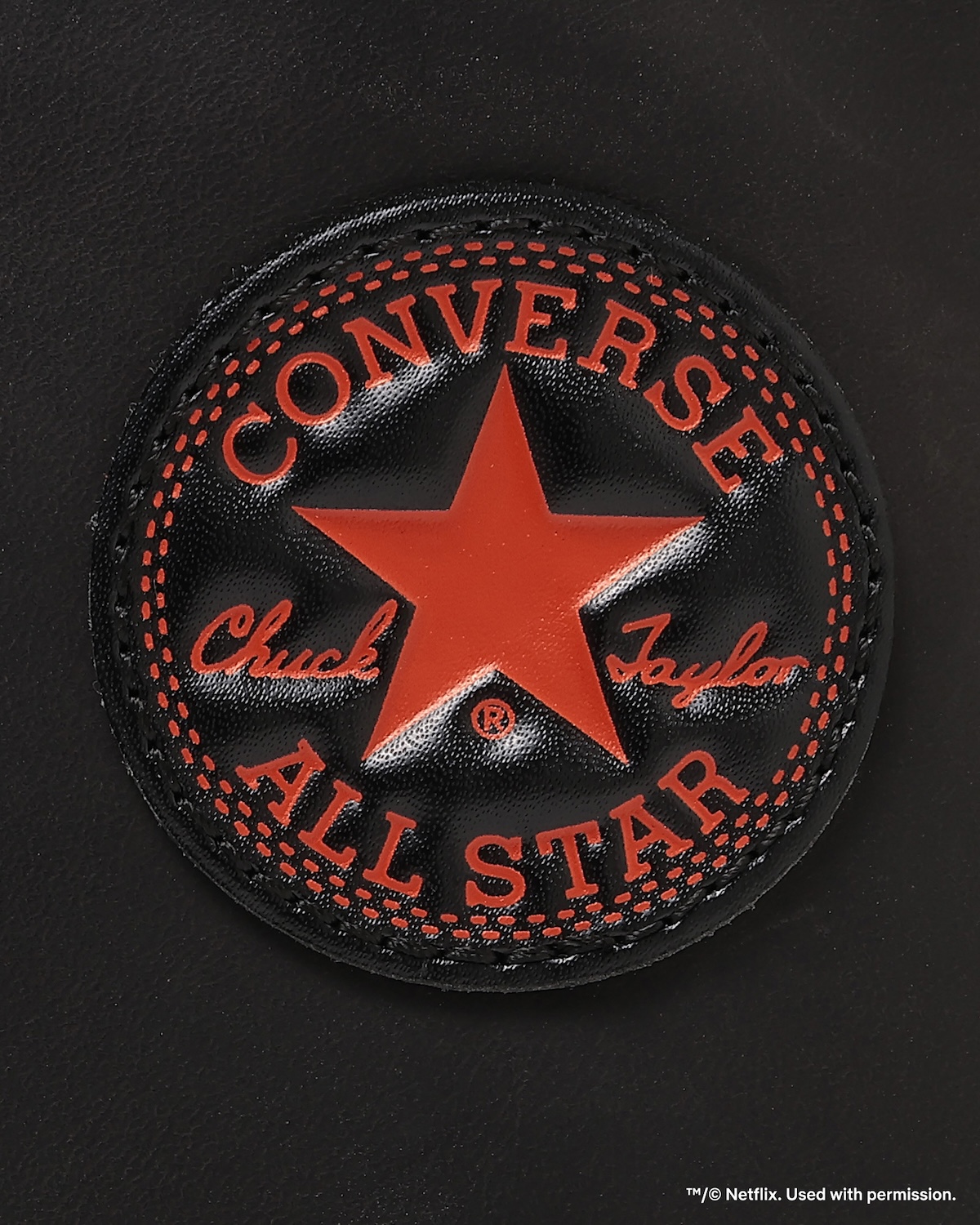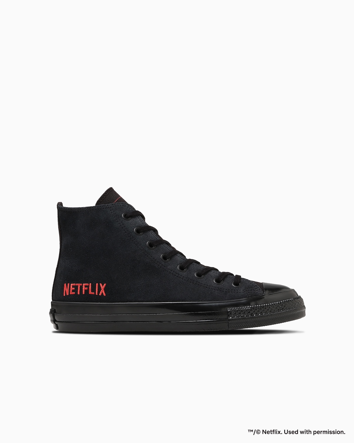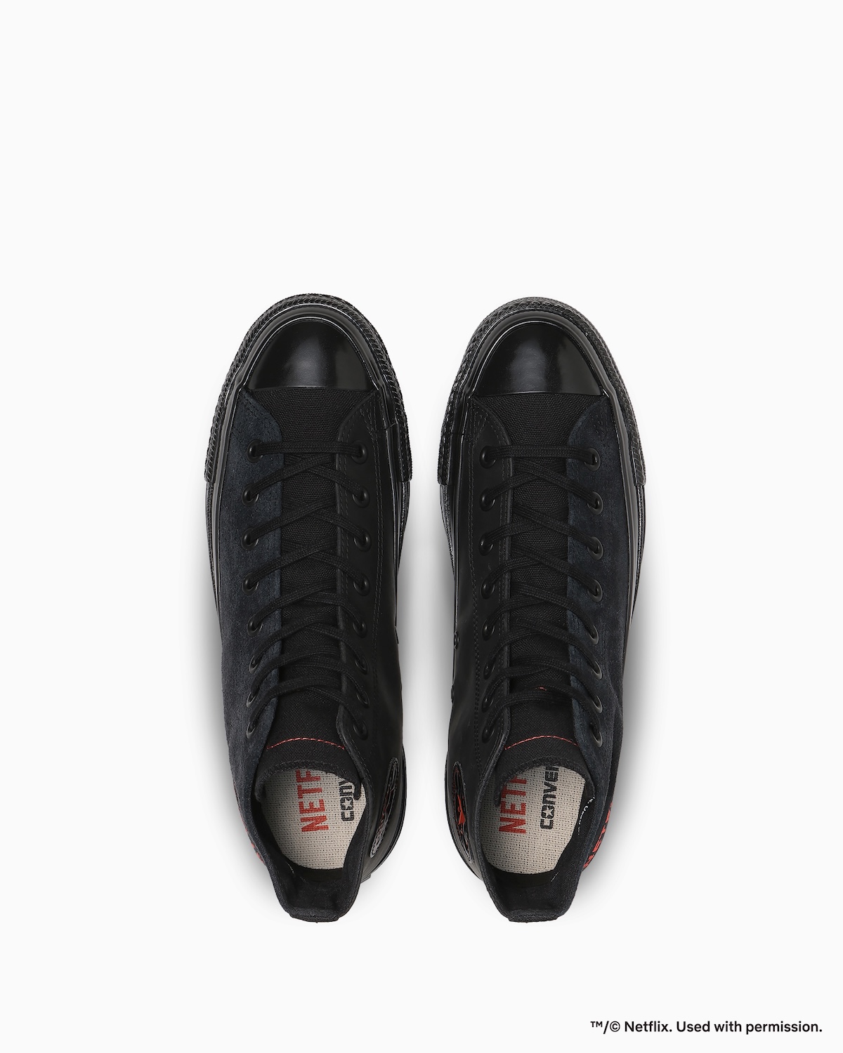 コラボアイテムは、ブラックを基調とした“オールスター エイジド”をベースに、レッドをアクセントにすることでNetflixの世界観を表現。外腰にはNetflixロゴを刺しゅうし、タン裏にはプロフィールアイコンのスマイルマークラベルをあしらった。オールブラックのアッパーは、スエード、キャンバス、スムースレザーの異素材を組み合わせ、ステッチにはレッドを採用。また、コラボレーション仕様のオリジナルボックスに加え、レッドのスペアシューレースも付属する。
