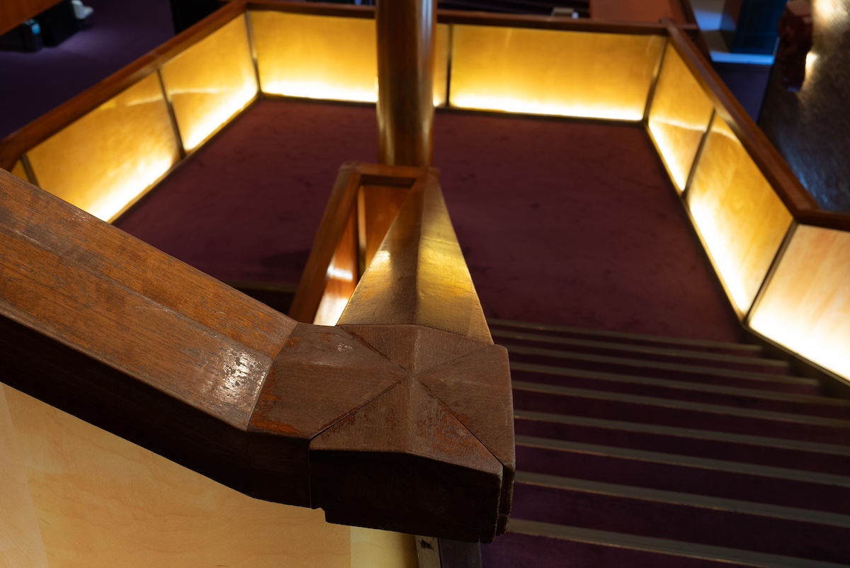 池田:これは帝劇さんのロビーの手摺りを使っています。もともと円柱の形を四角く切って、そこからさらに六角形にカットして。小さい材料を削って作っていくので、手間はかかるのですが、木工の職人たちは、みんなやる気になって。帝劇の歴史をつないでいくプロダクトで素敵に出来上がりました。