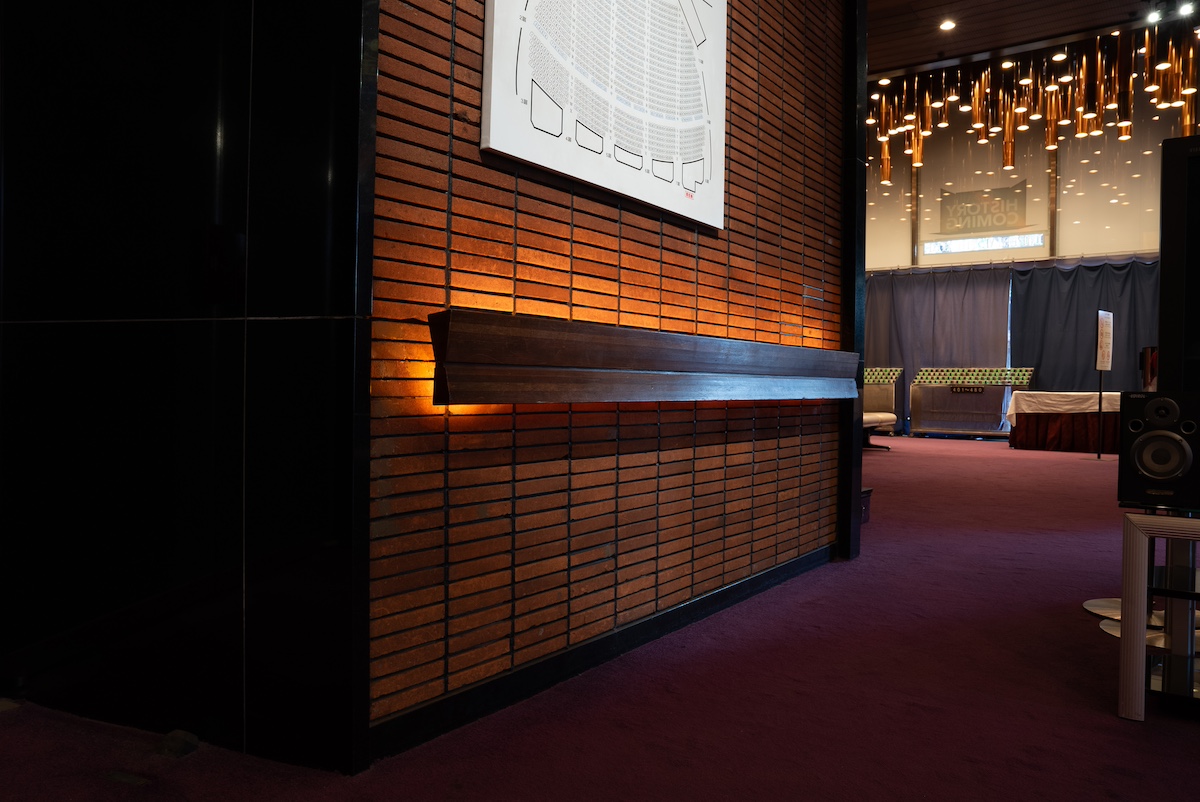 畑野:これは実際に客席のモケット生地を使用して、周りはカリモク家具さんの木を使っていただいています。