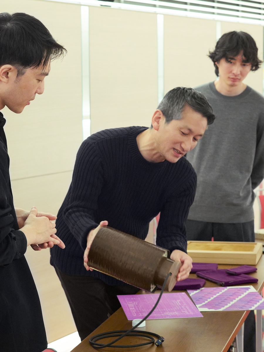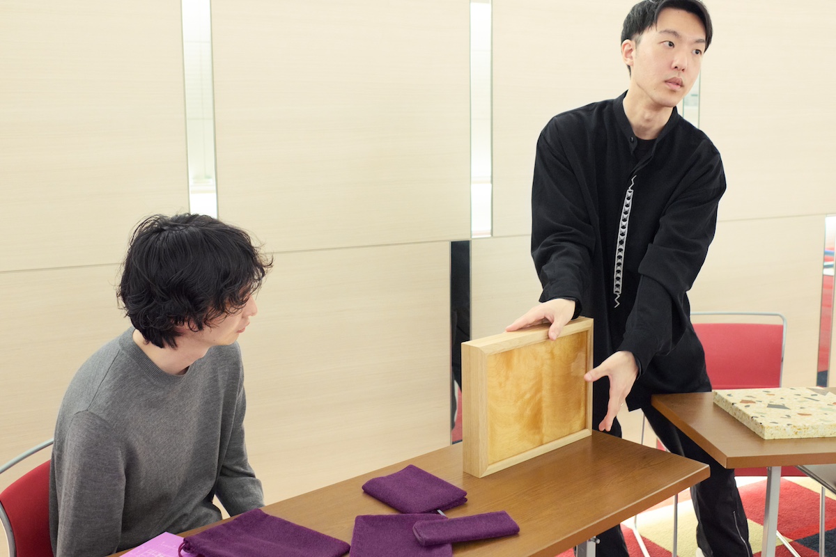 畑野:あと、これは“帝劇コンテイナー”という、小箱なのですが、これも実際に客席で使っていたモケットを使用していて。2日ぐらいかけて、僕が客席から切り取ったものです。それをNUNOUSという新しい布再生技術できれいに加工してもらっています。