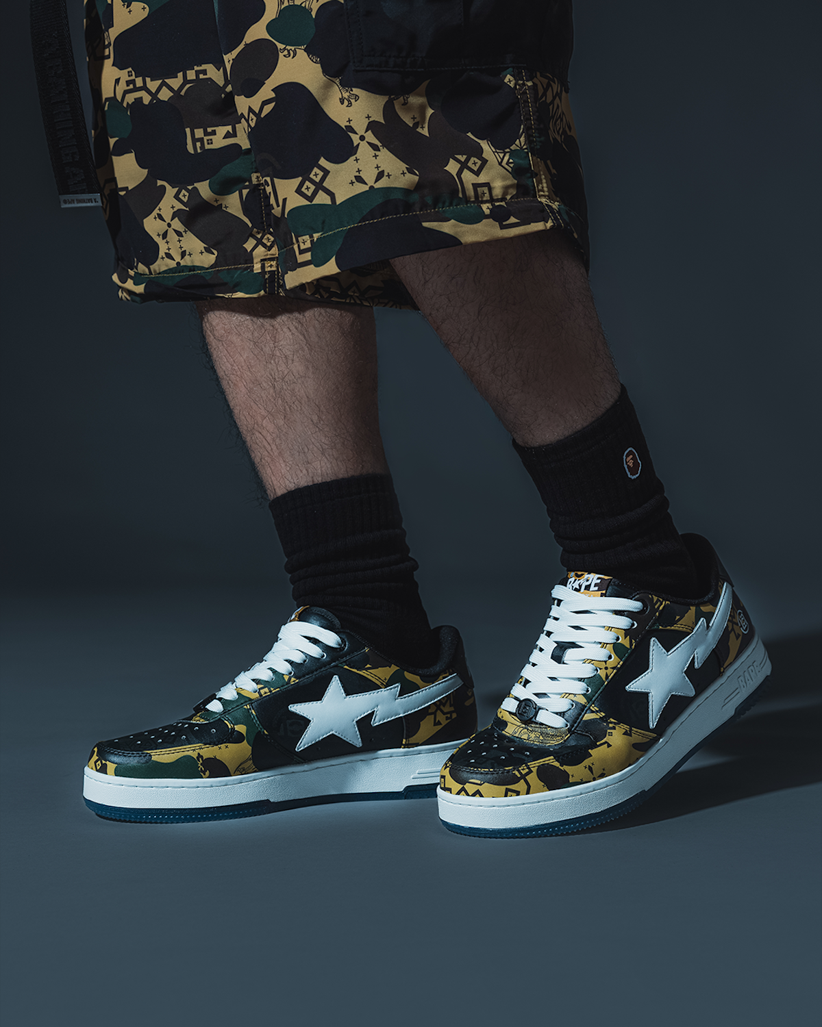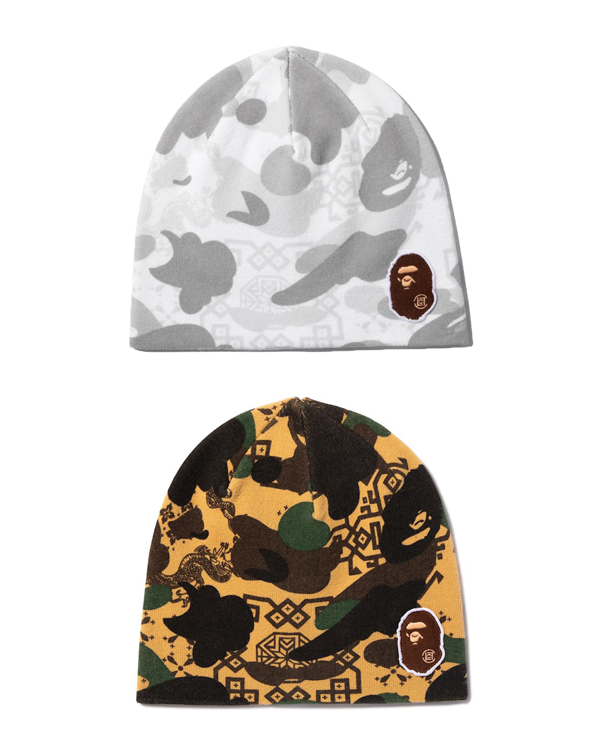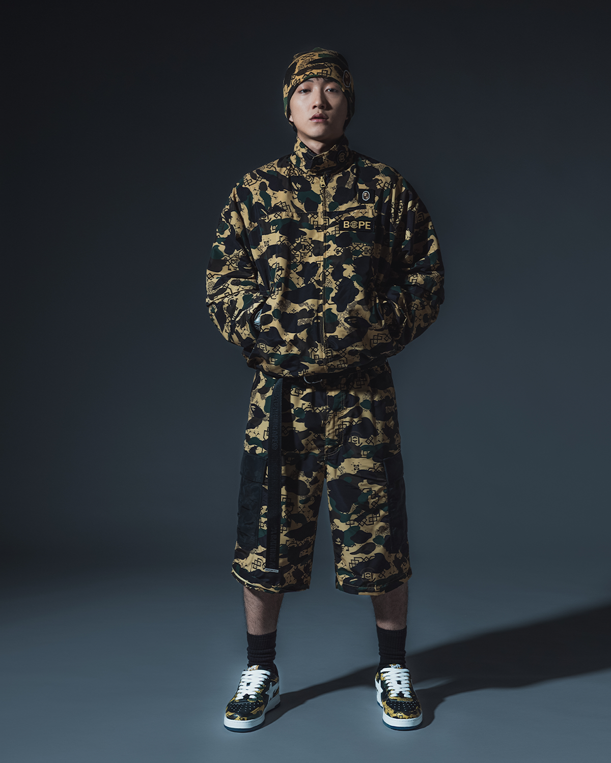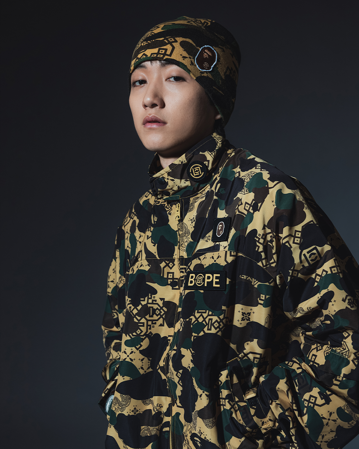 本コレクションは、「クロット」の“シルク ロイヤル”パターンと「ベイプ®」の“ファースト カモ”を融合した特別なビジュアルで展開。伝統的な中国の美学を随所に取り入れ、現代ストリートウエアに落とし込んだ。アイテムは、パターンを大胆に切り替え、フードにドラゴンモチーフの刺しゅうを施した“シャークフーディー”(4万9500円)や、取り外し可能なスリーブにより機能性とファッション性を兼ね備えた“レインジャケット”(5万7200円)のほか、同ジャケットとセットアップで着用できるリラックスフィットの“カーゴパンツ”(3万6300円)、カレッジテイストのグラフィックをベースに、両者のロゴを組み合わせた“Tシャツ”(1万5400円)をラインアップ。さらに、アッパーに特別なカモ柄をあしらったコラボ仕様の“ベイプスタ”(3万6300円)や、フロントにコラボロゴを配した“ビーニー”(1万4300円)なども展開する。