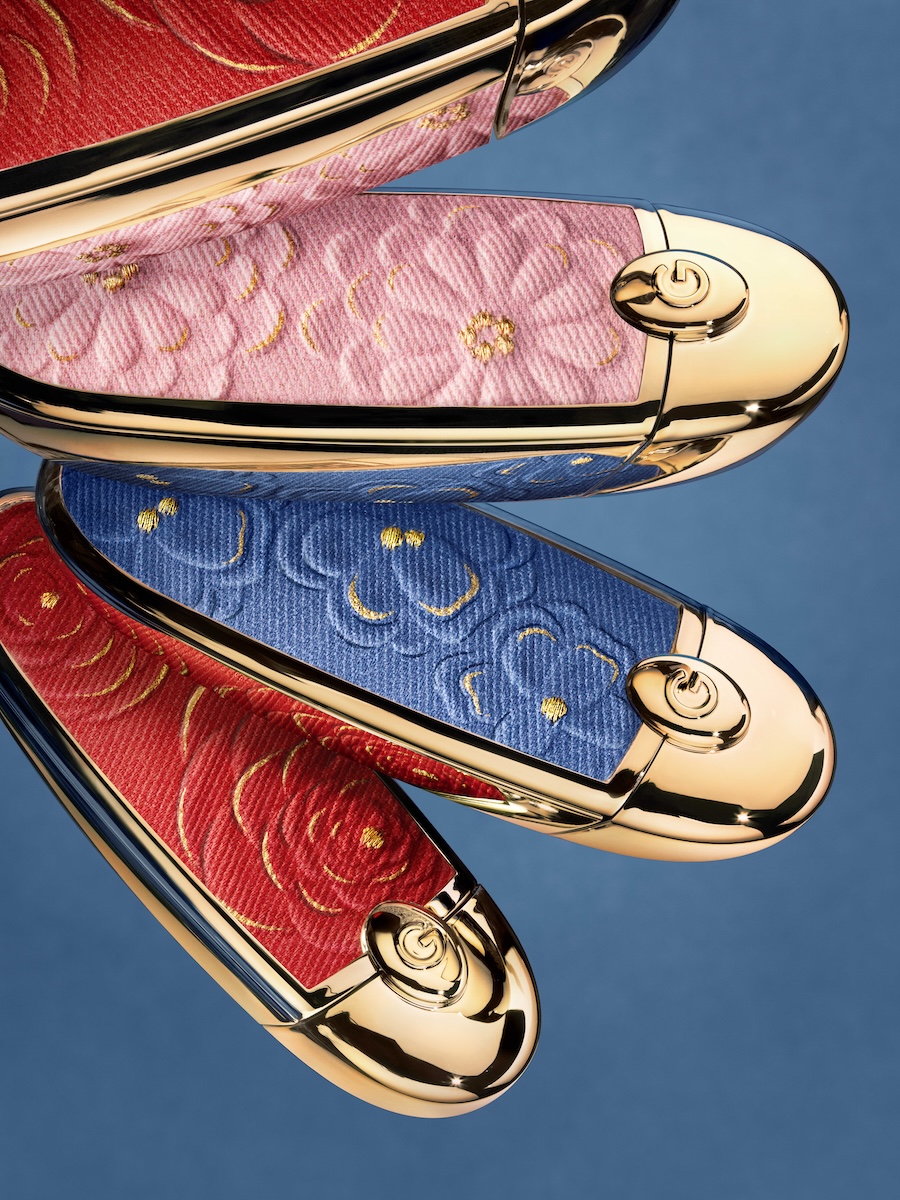 “ルージュ ジェ ケース”(限定3種、各4950円)は、ダブルミラー付きのカスタマイズ可能なリップスティックケースだ。染色、エンボス加工、刺しゅう、ゴールドの箔押しプリントをあしらった。“チェリー ブロッサム”は、春の訪れを告げる花を想起させる柔らかなピンクデニムで装飾した。“デニム フローラ”は、繊細な花のモチーフを散りばめたブルーデニムをまとい、“レッド ローズ”はセンシュアルな薔薇の花びらのデザインを施したレッドデニムをあしらう。