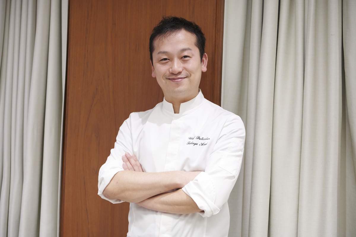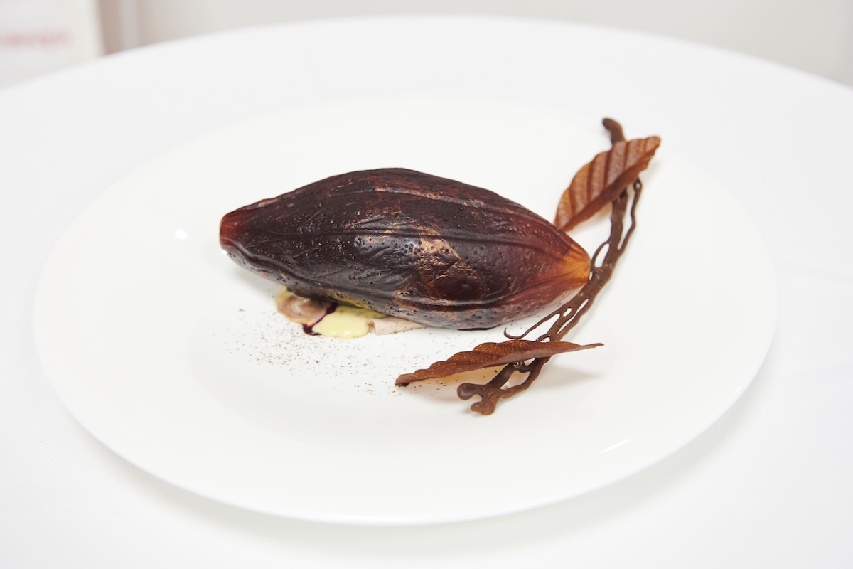 チョコレートの販売のほかに、高島屋のバレンタインを盛り上げるコンテンツとして定着しているのが、「アムール デセール サロン」だ。人気パティシエが目の前のカウンターでデセールやパフェを仕上げ、ドリンクとのペアリングを提供する。今年は7人のパティシエが3日間ずつ、嗜好を凝らしたデセールを提供する。今年はパティスリーに限らずレストランのシェフパティシエも登場。「Dining33」の浅井拓也氏がスペシャルなデセールである「ソンポーソンカカオ」について語った。