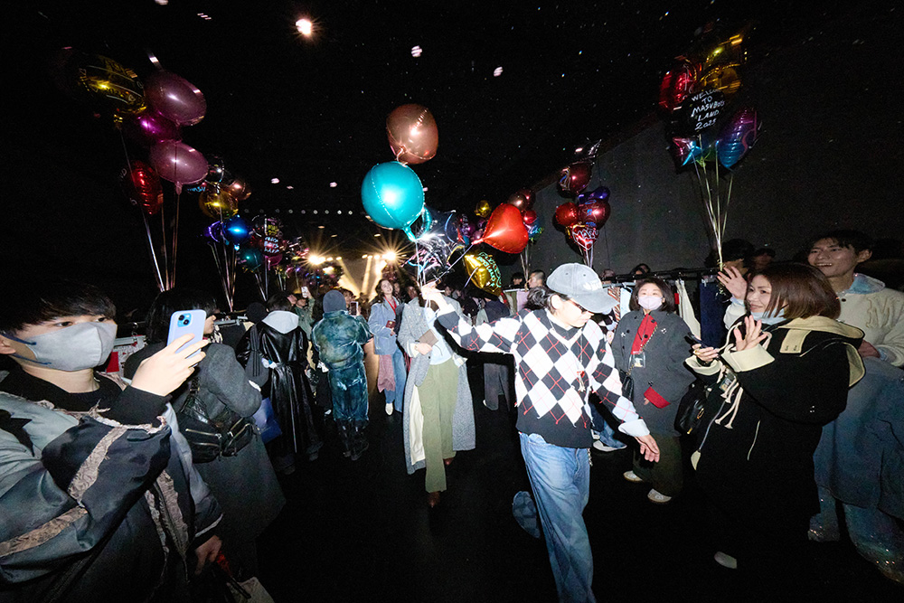 2025年末、新木場。冷え込みの厳しい湾岸エリアに深夜から行列を作り、約1000人が集まった。目的は、デザイナー後藤愼平が手がける「エムエーエスユー(M A S U)」が約3年ぶりに開催したアミューズメントイベント「マス ボーイズ ランド(MASU BOYS LAND)」だ。会場では後藤とのツーショットやサインを求めるファンが長蛇の列をなし、デザイナーはテーマパークの主役のように1人1人に笑顔を向けた。これほど熱量の高いコミュニティーを持つブランドは、現代の日本のファッションシーンにおいてまれな存在だ。