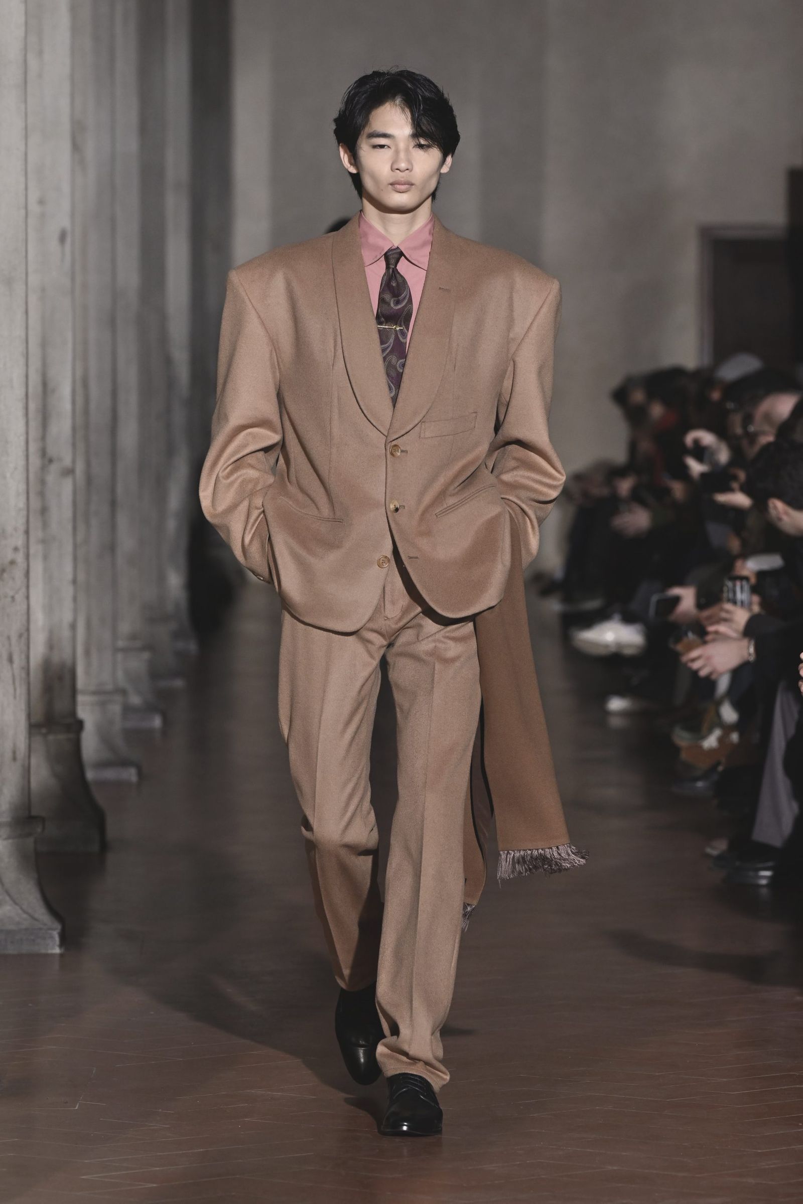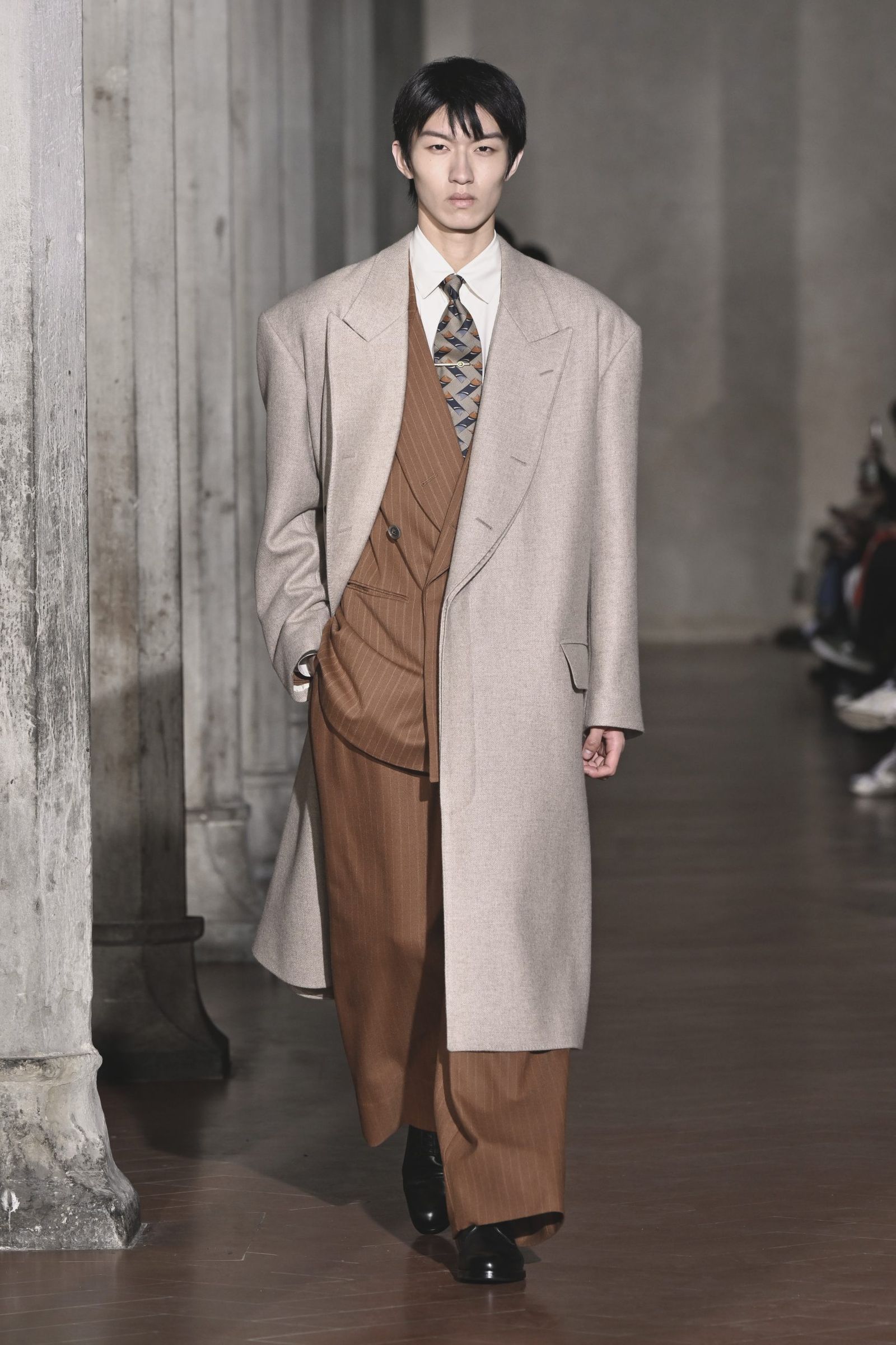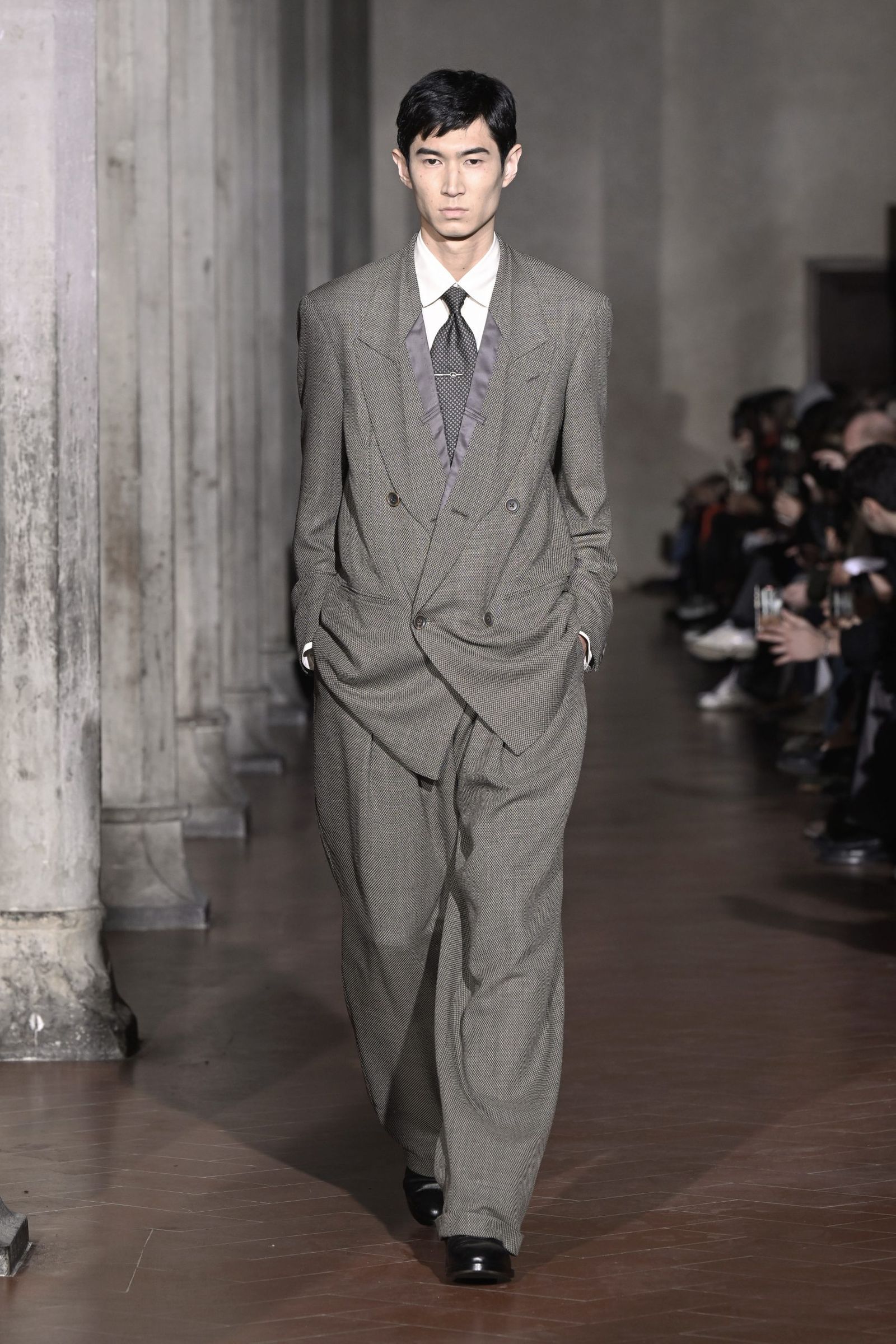 「極東の島国で育った自分が、テーラリングの聖地で何ができるか」。大月はテーラーで学んだわけでも、海外で専門教育を受けたわけでもない。実際には経験していないバブル期の情景や、当時のイタリア製スーツになぜ懐かしさを覚えるのか。今回は“本場”でショーを行うことで、その理由を彼なりに理解し、再解釈し直すという大月自身の進化のための試みでもあった。