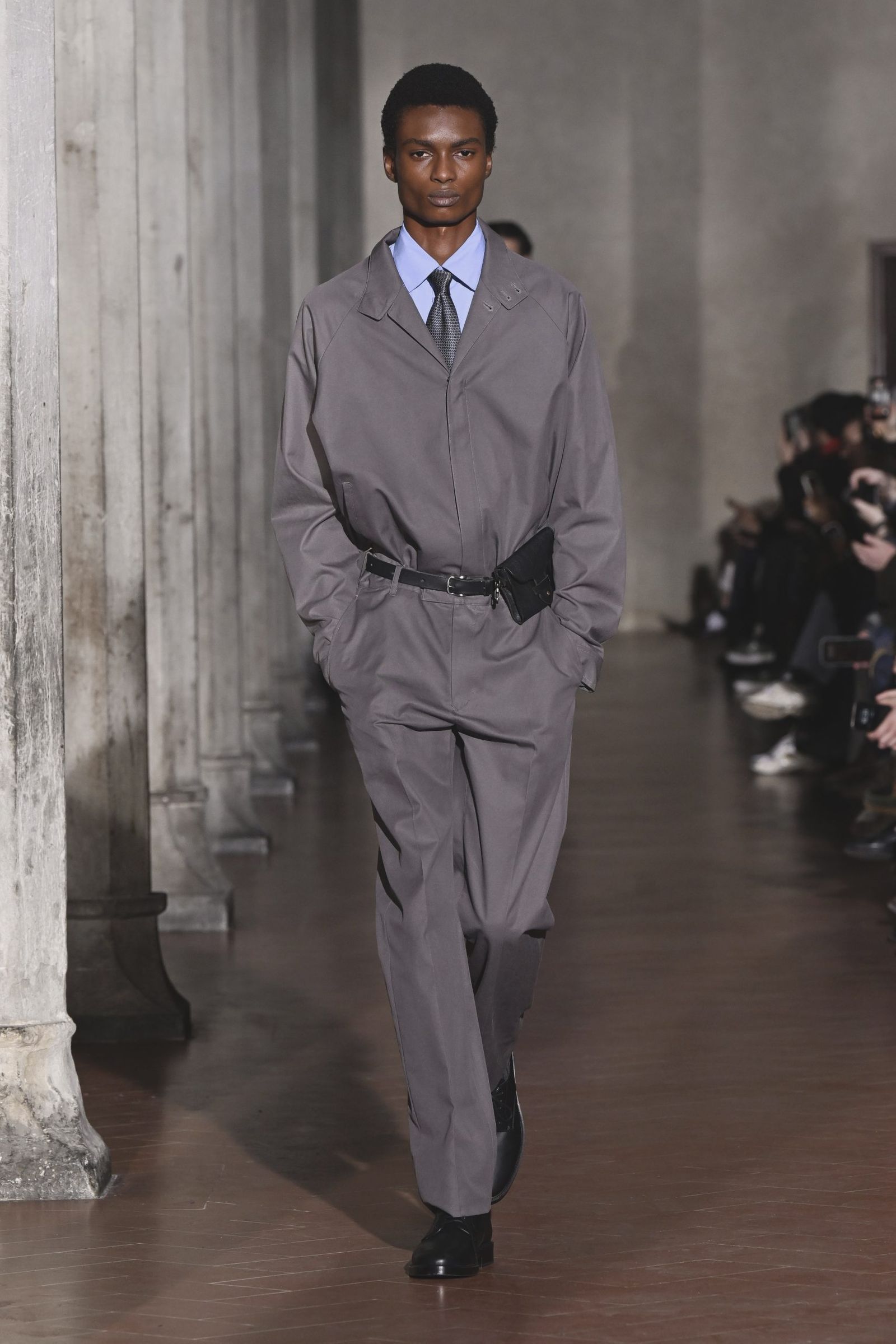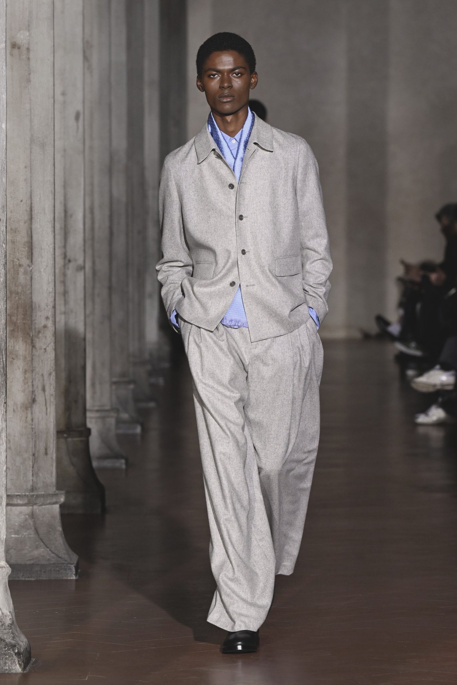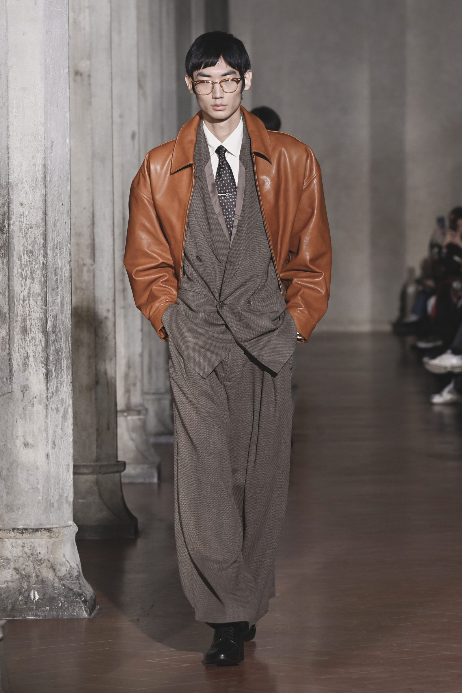 「極東の島国で育った自分が、テーラリングの聖地で何ができるか」。大月はテーラーで学んだわけでも、海外で専門教育を受けたわけでもない。実際には経験していないバブル期の情景や、当時のイタリア製スーツになぜ懐かしさを覚えるのか。今回は“本場”でショーを行うことで、その理由を彼なりに理解し、再解釈し直すという大月自身の進化のための試みでもあった。