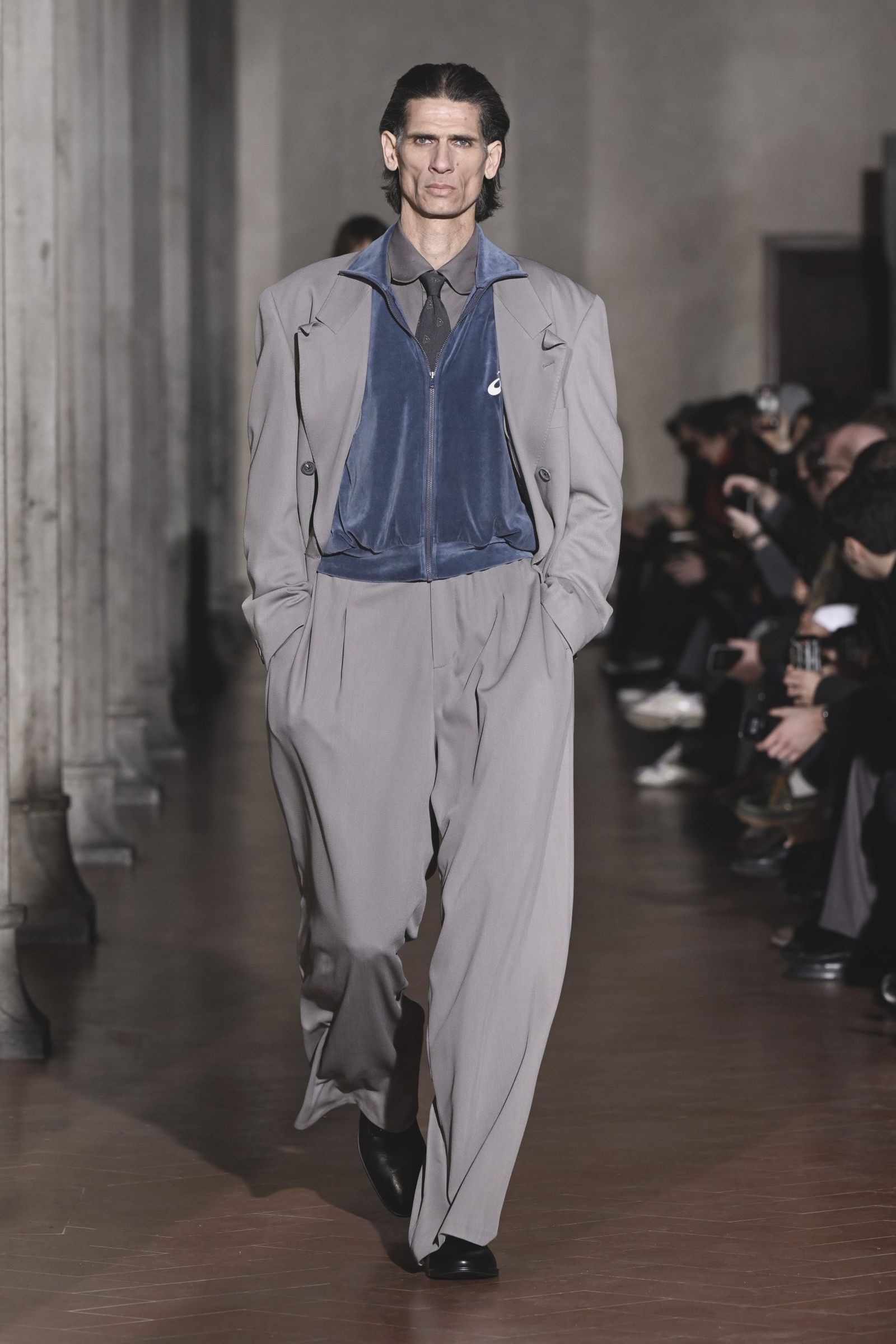 “実験”とも呼べるコラボレーションも登場。「プロレタ リ アート(PROLETA RE ART)」や「アシックス スポーツスタイル(ASICS Sportstyle)」との協業によって、端正なスーツ地とコントラストのあるボロやべロア調のテクスチャーを衝突させた。