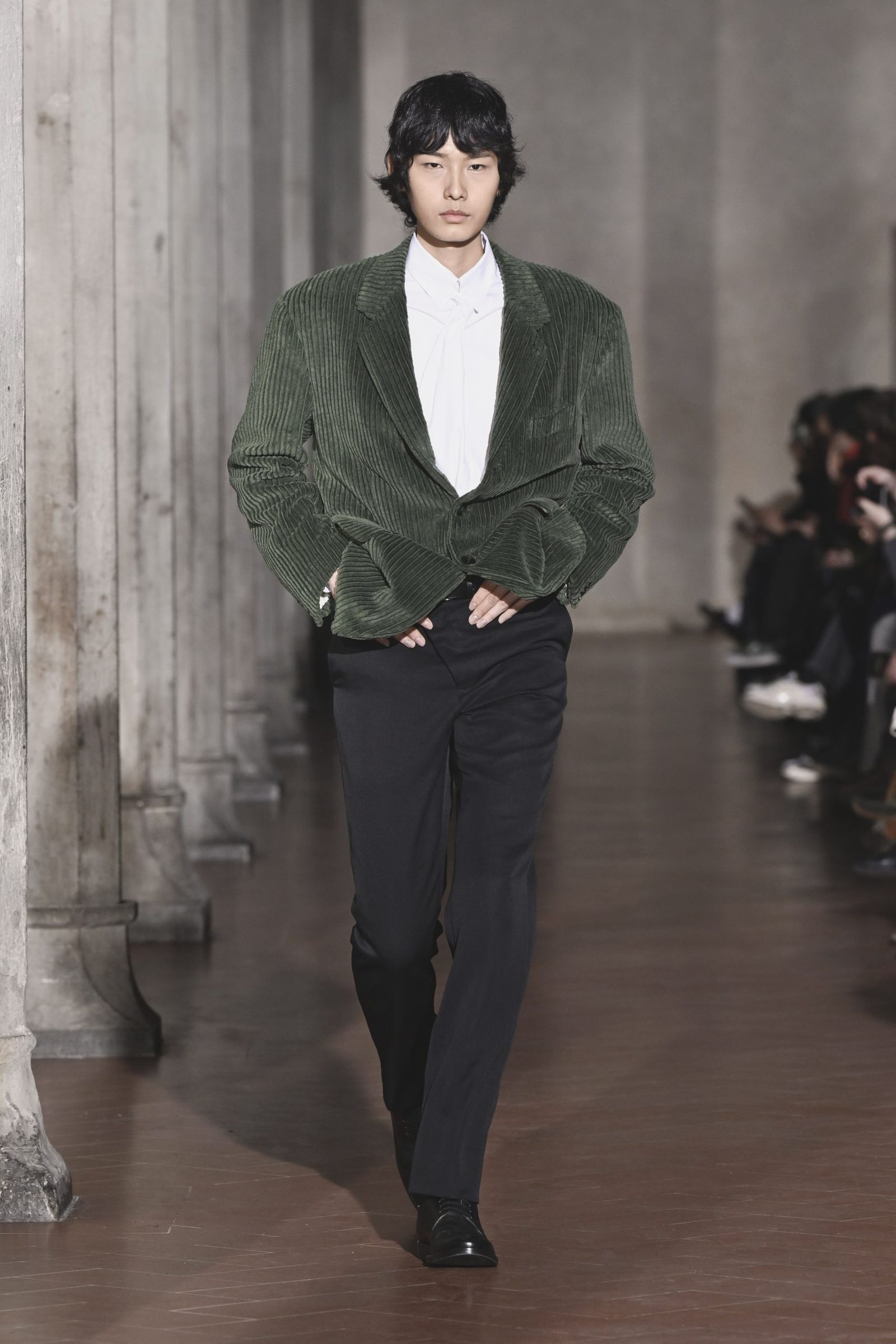 終盤、タバコを片手に気崩したスーツで歩くモデルたちの姿は、映画「BROTHER」のアウトローと重なる。ドカジャンを思わせる襟ボアのブルゾンや、哀愁漂うコーデュロイのセットアップも、大月にとっては日本的な“正装“の範疇にあるに違いない。