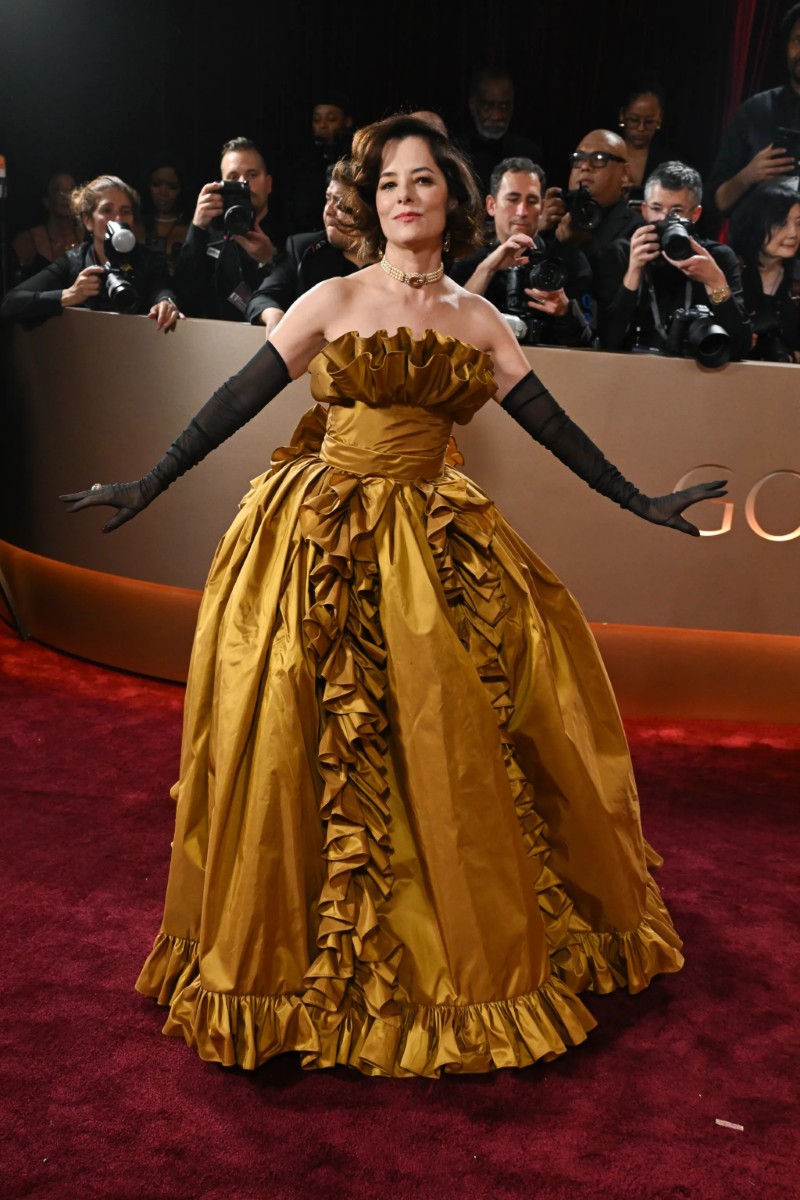 今年の「ゴールデン・グローブ賞」では2026年春夏のランウエイの影響も色濃く反映され、メタリックは単なる装飾ではなく、存在感を放つ主役として扱われた。特に、特殊な加工やコーティングを施した質感、彫刻的なボリューム、流れるようなドレープを特徴としたデザインが主流となり、動きやインパクトを意識したルックが多く見られた。