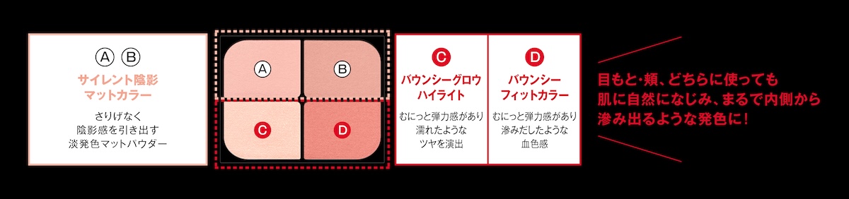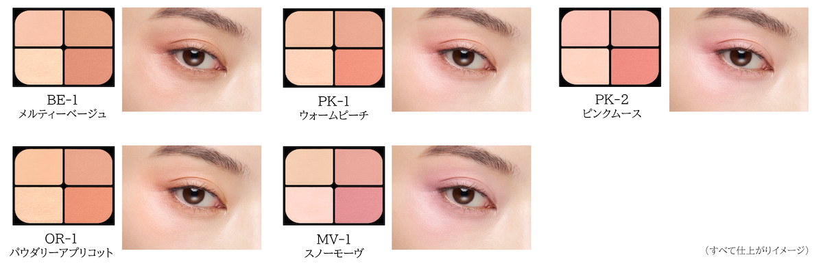 “バウンシー チーク シャドウ”は、頬まで広く色を乗せて目元の印象を拡大するチークシャドウパレット。滲み出るような発色で立体感と血色感を同時にかなえる。カラーは、ベージュブラウンと赤みのある血色感カラーの“BE-1 メルティーベージュ”と肌馴染みの良い温かみのあるピーチカラー“PK-1 ウォームピーチ”、アプリコットカラーにミルキーな柔らかさをプラスした“OR-1 パウダリーアプリコット”、クールなモーヴ系カラーの“MV-1 スノーモーヴ”をラインアップする。