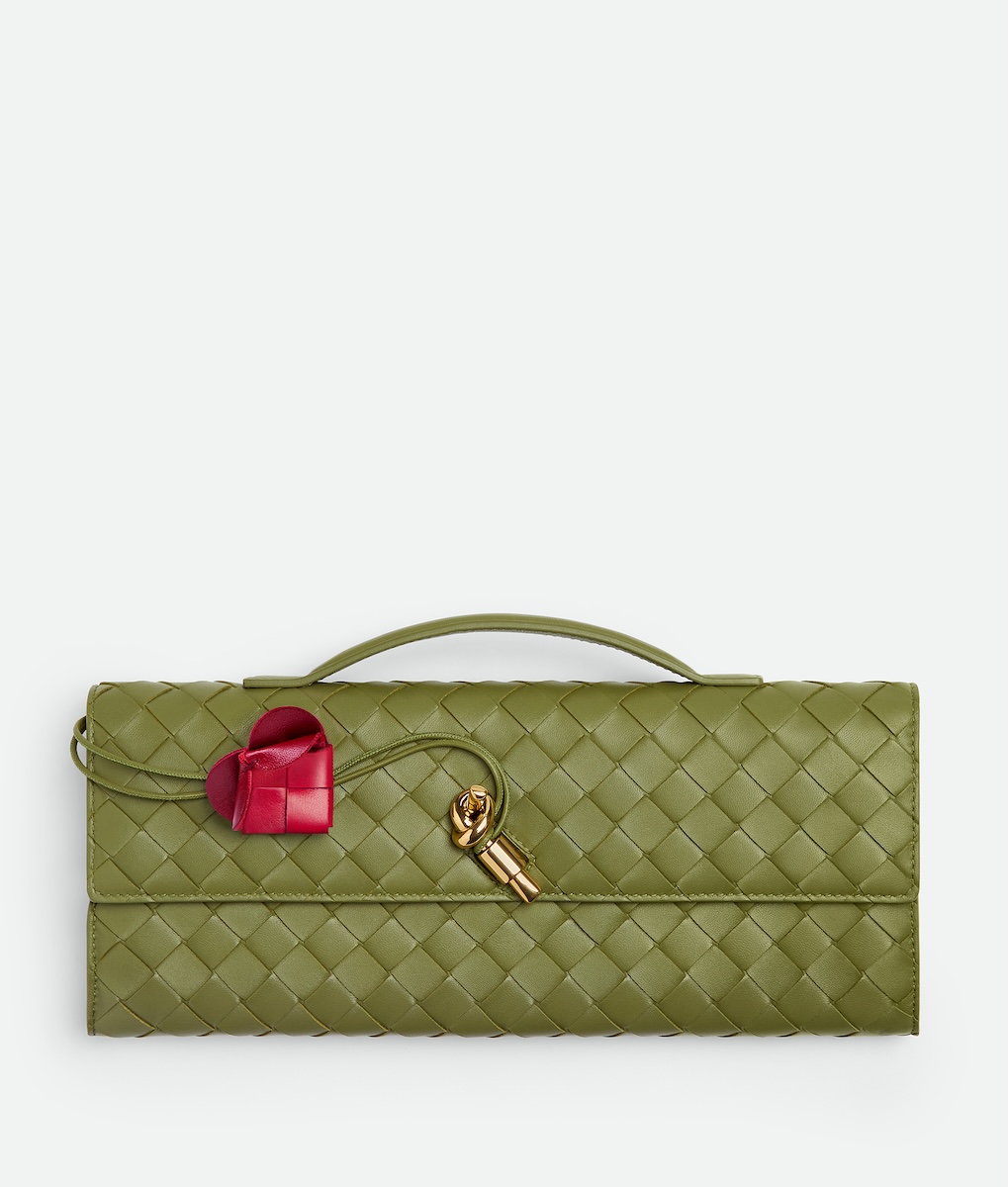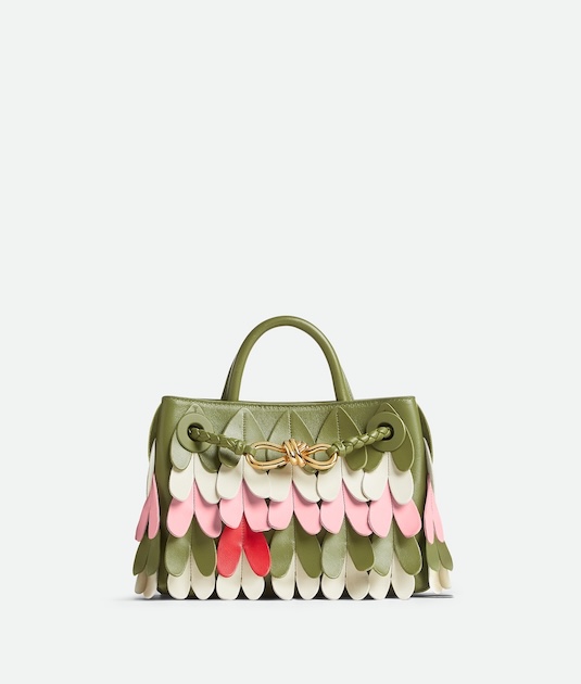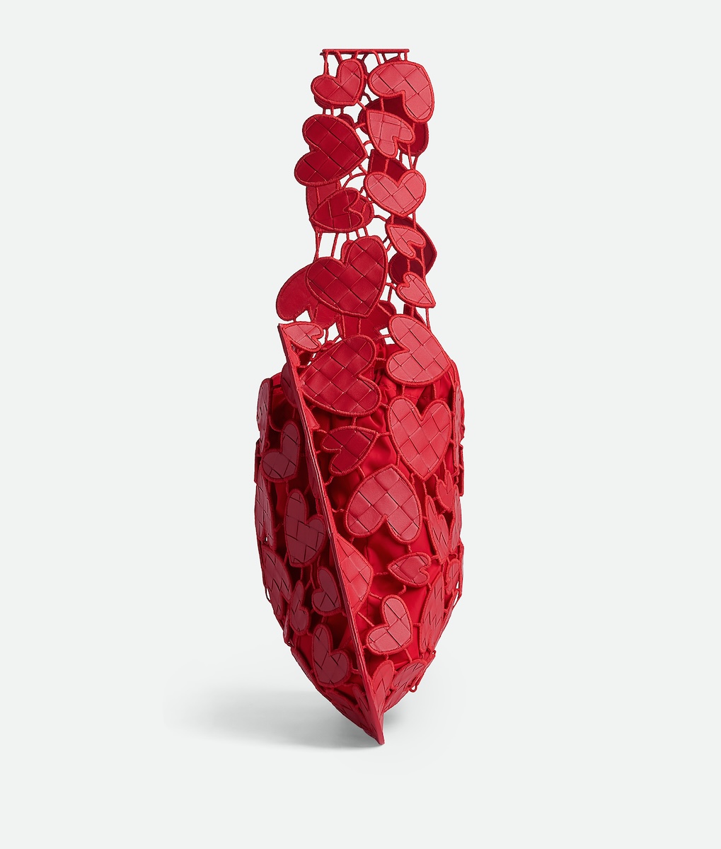 バッグからは、優しげな戻りが象徴的な“ミニアンディーモ”(110万円)、“アンディーモクラッチ”(53万9000円)や、鮮やかなピンクやレッドが彩る“ジョディ”(48万9500円)、“ハートトート”(90万7500円)が登場する。“ミニアンディアーモ”にはグラフィカルに配置された帯状のレザーハートモチーフを採用し、“ハートトート”には、ベースになる革に切り込みを入れて、短冊切りに入れた皮を差し込んでいくイントレチャート技法で丁寧に編み上げた。