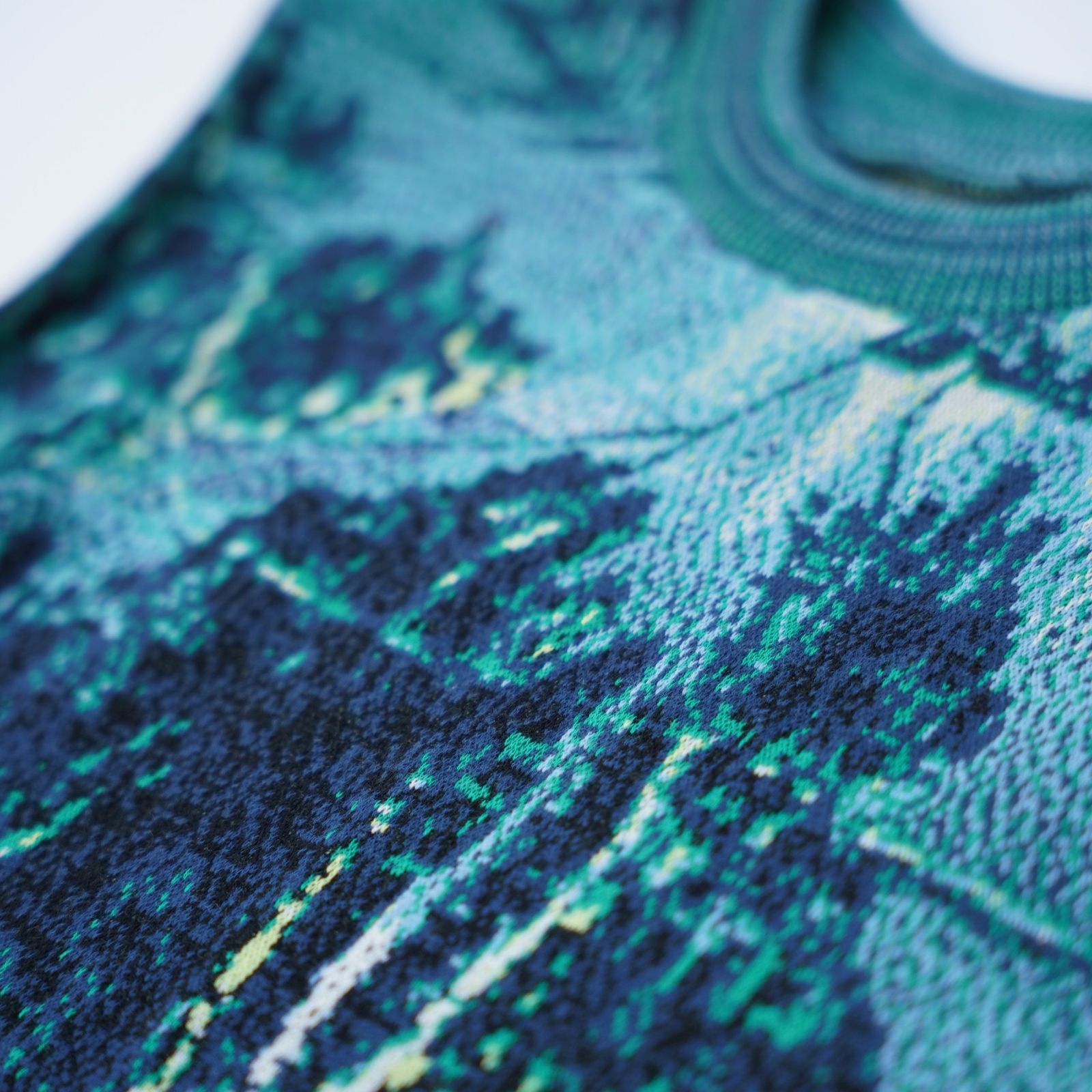 ラインアップは、キービジュアルを色分解し、織組織で再構成したタペストリー(6万6000円)や、「アルバトロ デザイン(ALBATRO DESIGN)」によってデザインされたタイトルロゴをフロントに配したTシャツ(1万5400円)とフーディー(4万6200円)をそろえる。さらに、本作品の背景原画をニットで表現したニットセーター(4万1800円)とドレス(5万5000円)もラインアップする。