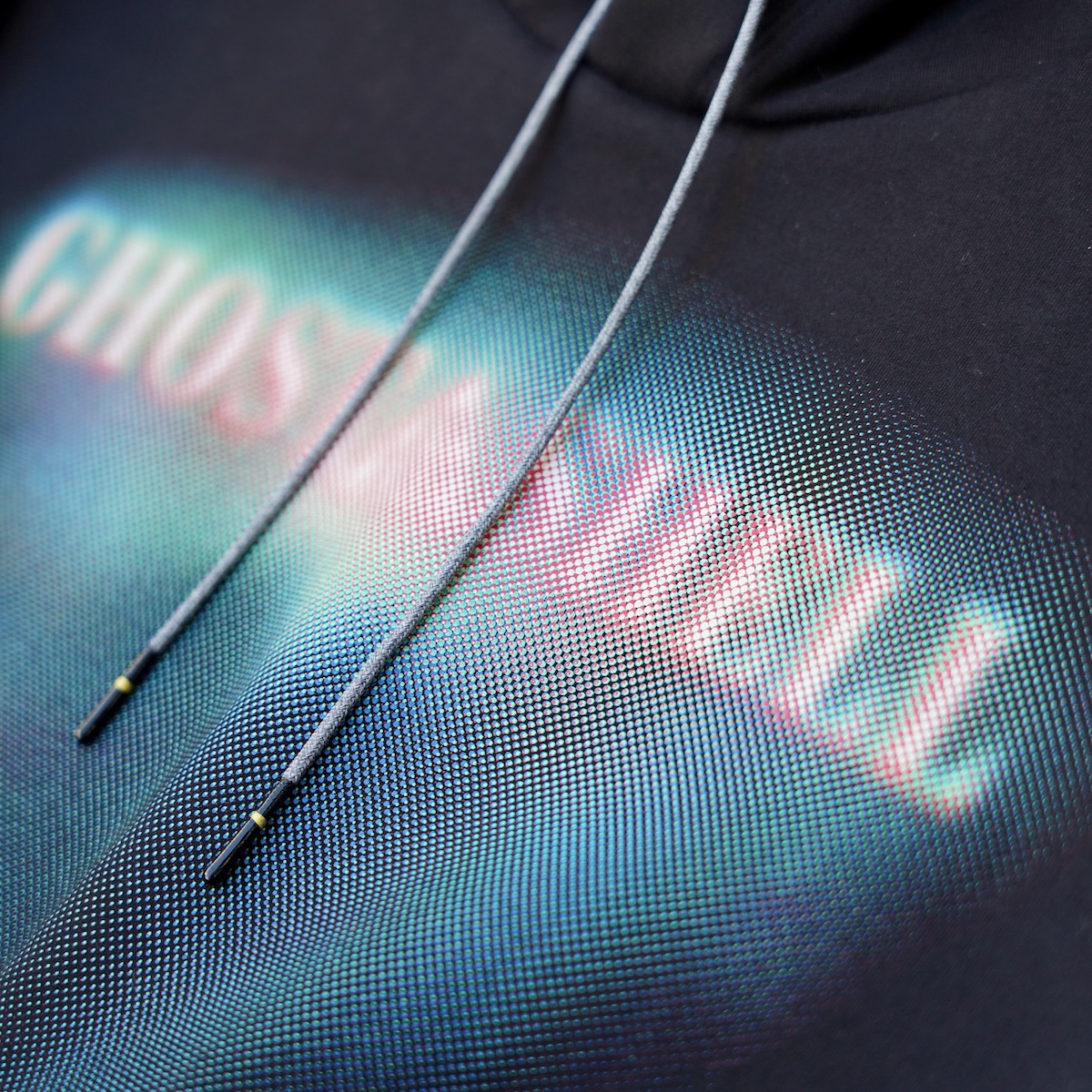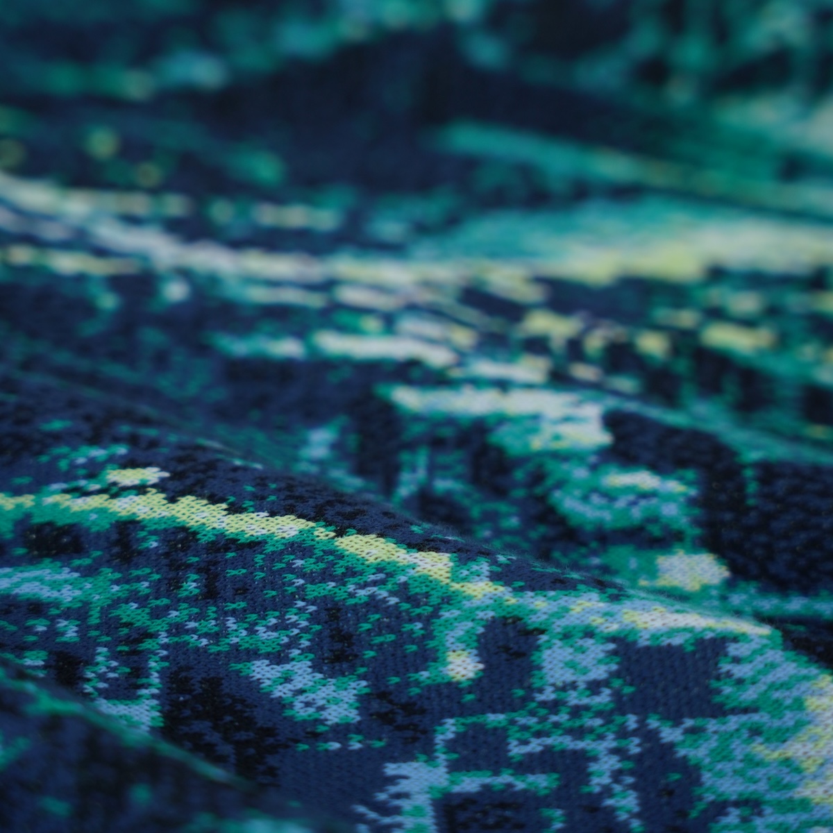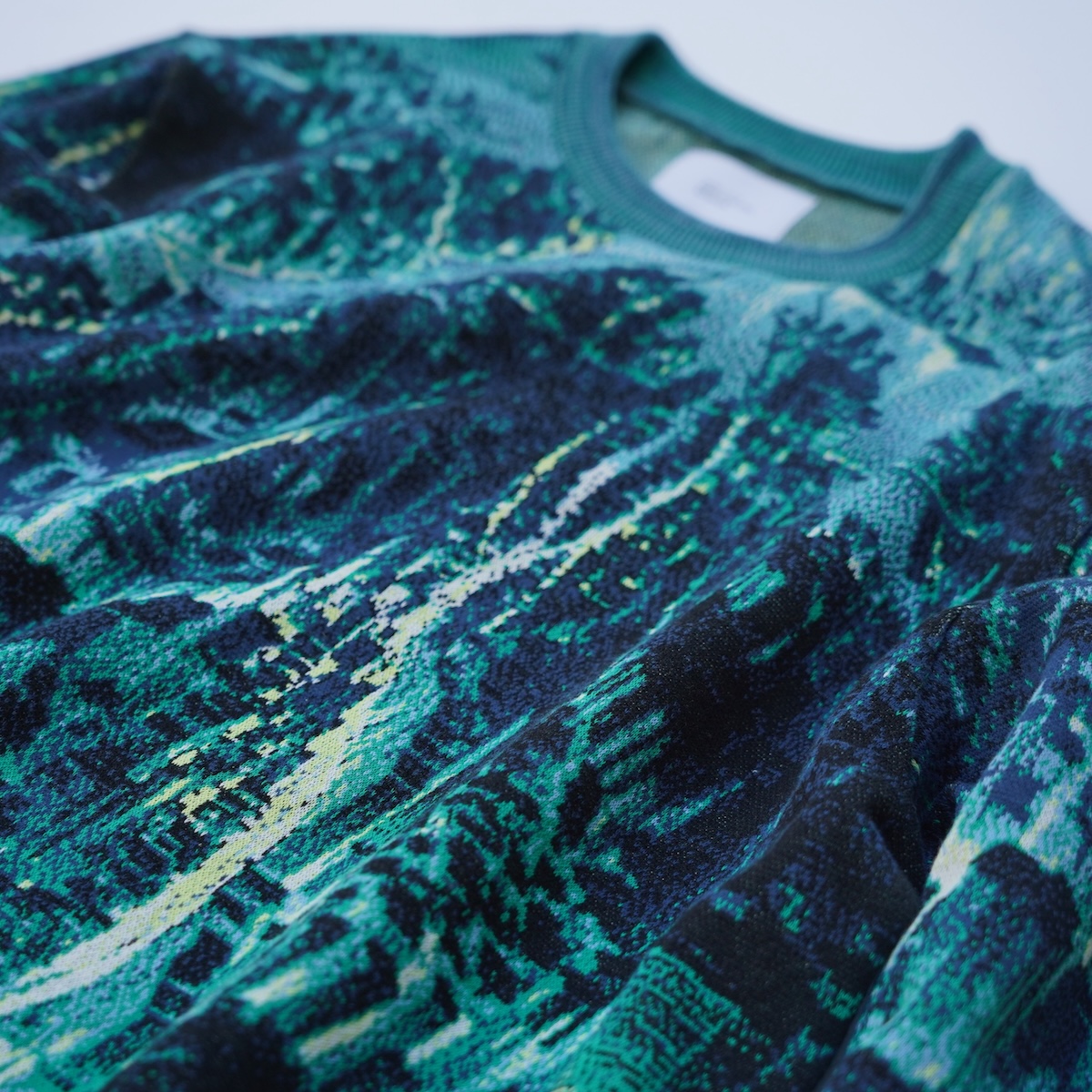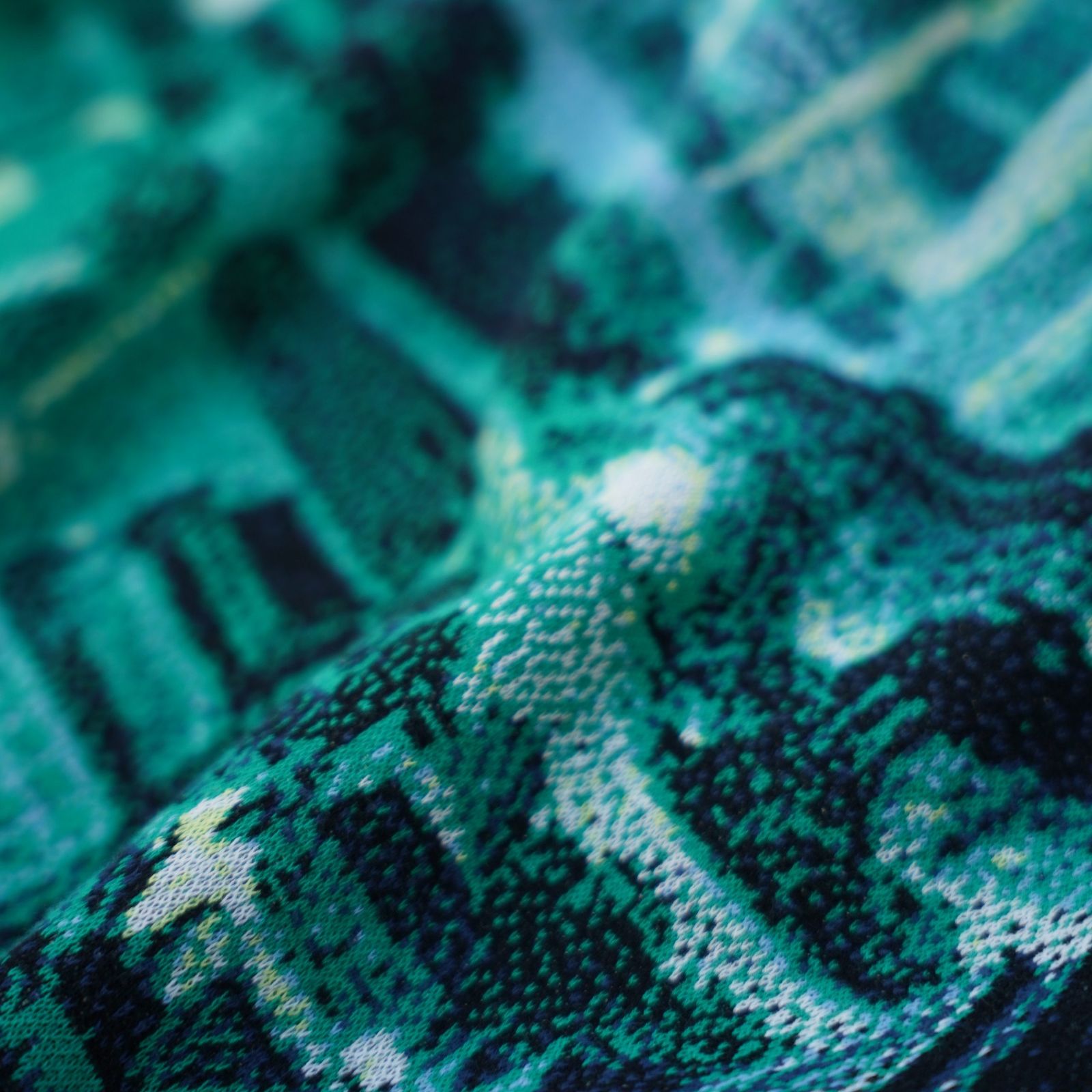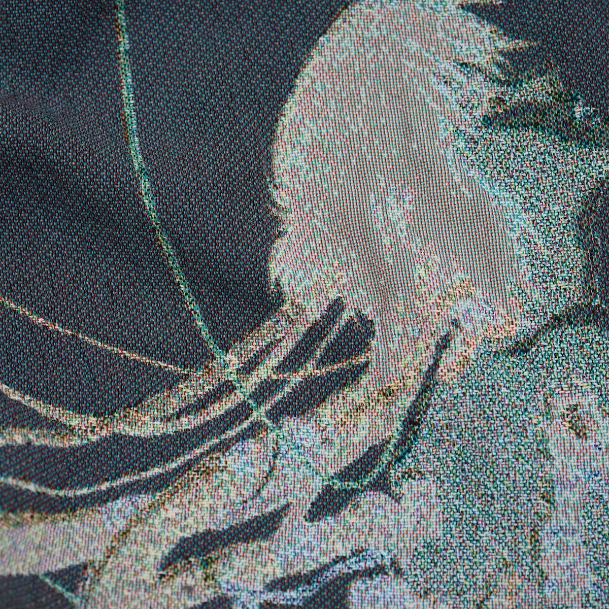 本アイテムは、デザイナーの長見圭佑がブランド設立以前から深く影響を受けてきた「GHOST IN THE SHELL/攻殻機動隊」について、“粒子”をキーワードに表現したカプセルコレクション第1弾だ。「ハトラ」は近年、糸の組織で布の柄を表現する手法であるジャカードをコレクションの中心に展開してきた。インターネット以降の意識やアイデンティティへの予言的なヴィジョンを世界中に浸透させてきたとされる「GHOST IN THE SHELL/攻殻機動隊」をジャカードで織り込むことで、本作品の新たな一面を照らすことを試みた。
