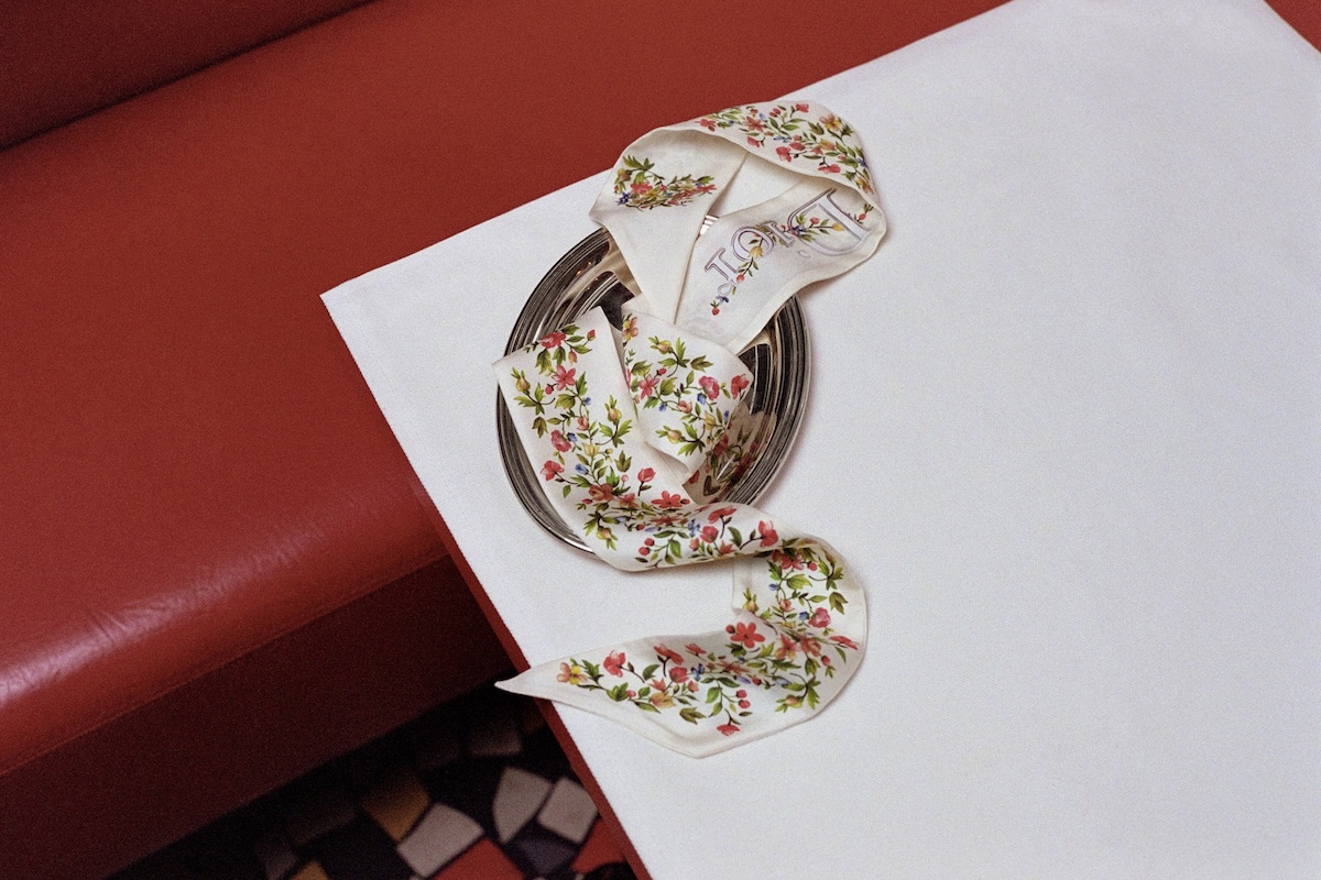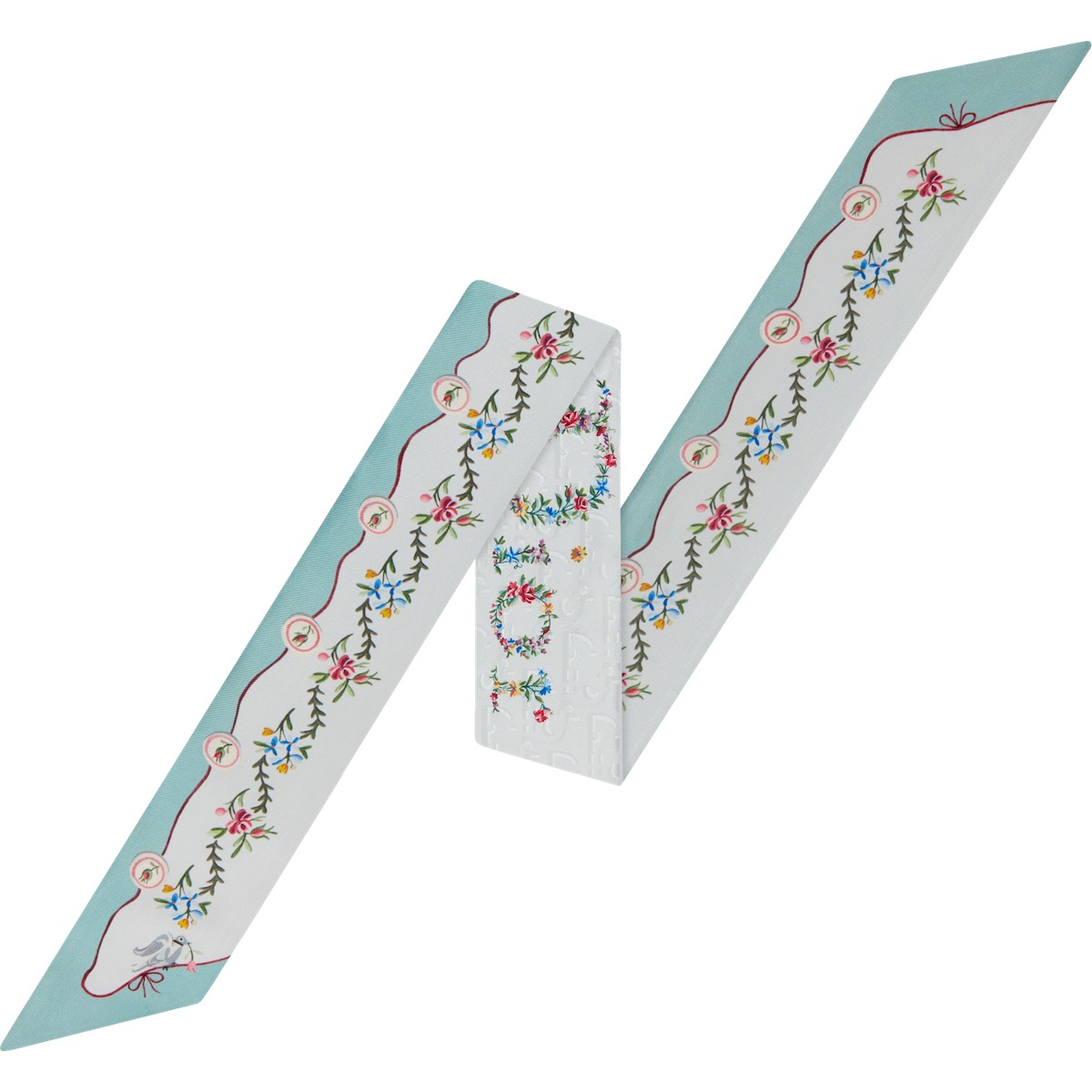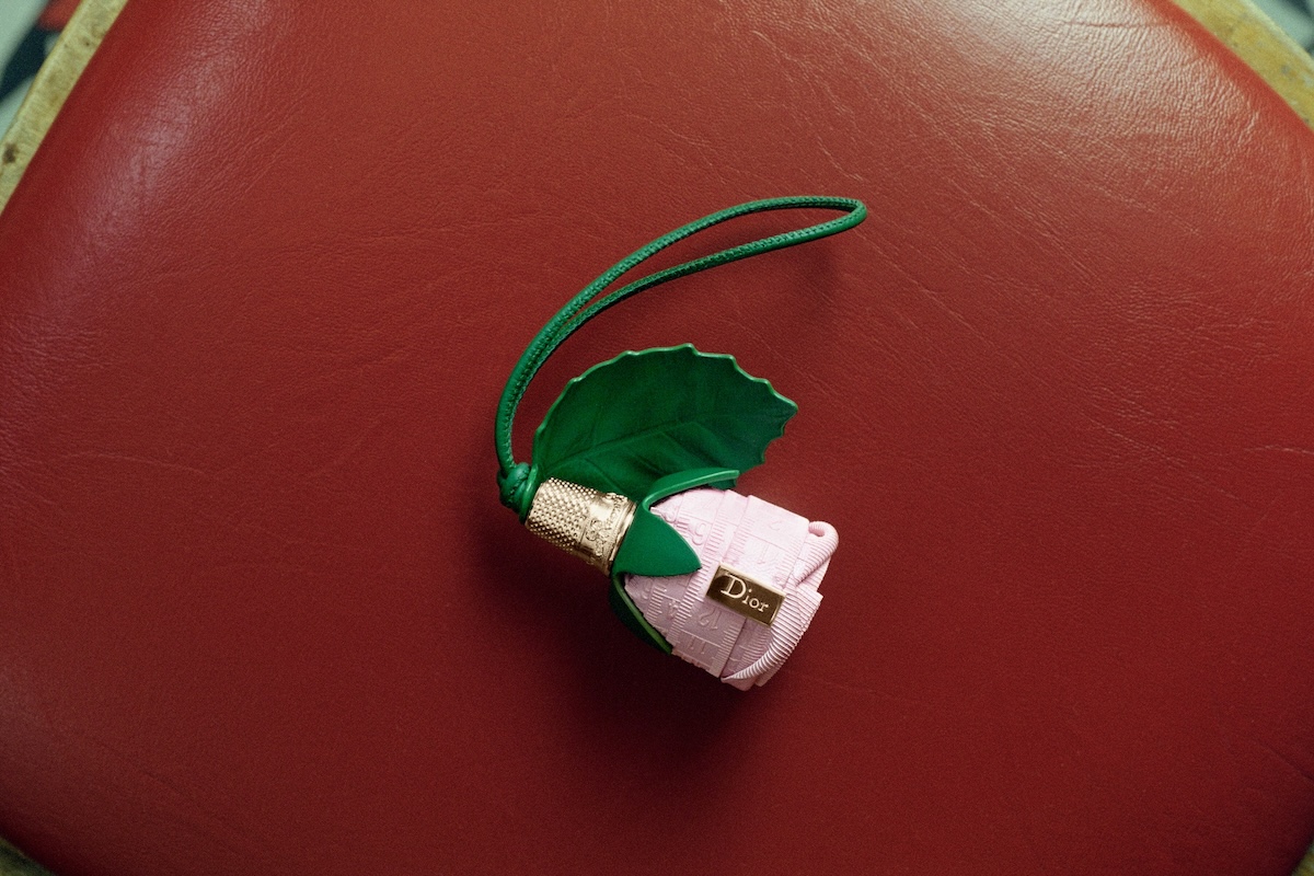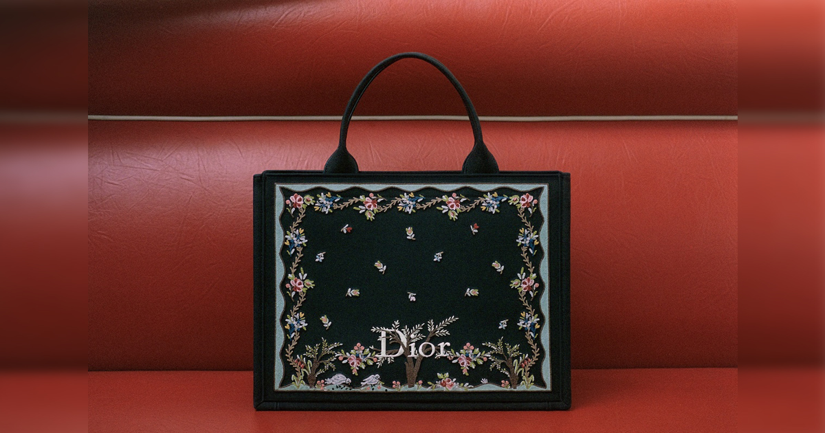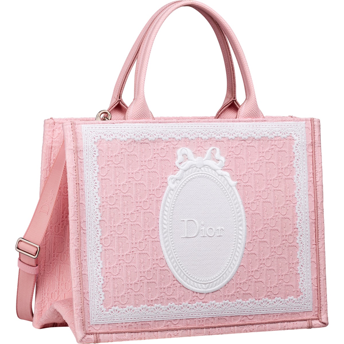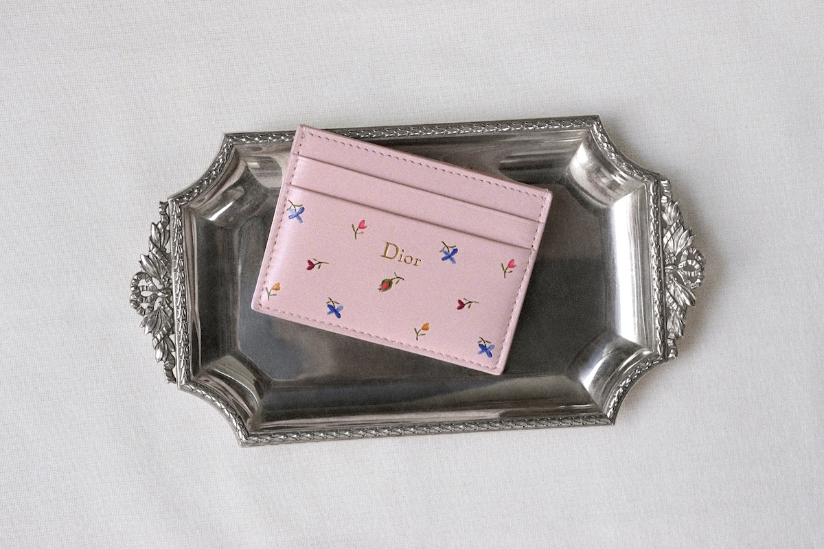 ほか、1956年の“パストラル”ドレスに敬意を示したロマンティックな“ダヴ&ローズ”モチーフは、バラと鳩の形をしたプラメティスを表現し、ホワイトの“レディ ディオール”やライトブルーの“レディ Dジョイ”に施した。ポエティックな庭園を思わせる“フローラル ハート”モチーフは、シルクスカーフに浮かび上がり、象徴的なメダリオンは“ディオール ブックトート”に、ボウは“サドル”バッグにあしらい、ほのかなバラ色をまとう。