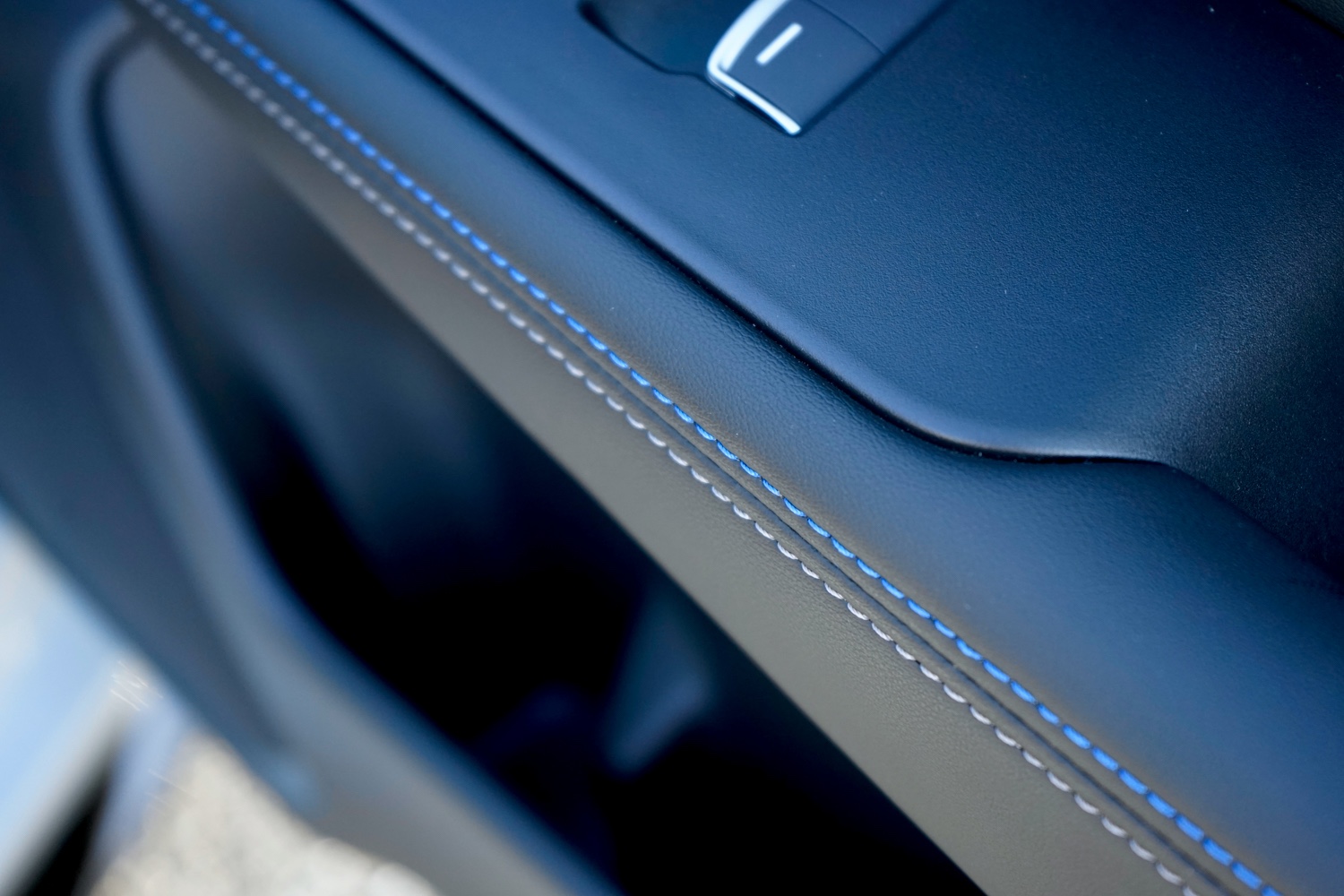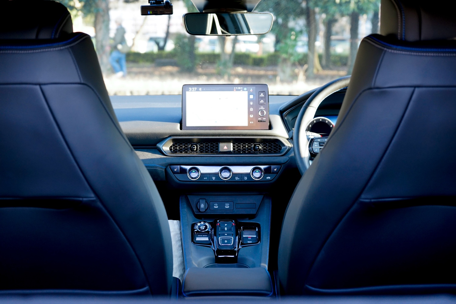 シートレイアウトは2+2。ヘッドクリアランスは必要十分で、ボディータイプから想像するほど狭く感じない。試乗車の内装色は“ブルー&ブラック”で、和紙を思わせる柄のライニングに施した、刺しゅうロゴがまず目に入る。ブルーとホワイトの2色を巧みに使い分けたステッチワークも上品だ。インパネ周りは水平基調で、運転席からはステアリングやモニターの上部がフロントガラスの下端と一直線にそろっており、前方視界は凹凸もなくクリーン。D形ステアリングやセンターマーカー、金属製のパドルシフトなど、走りへの期待感をあおる要素も、絶妙なバランスで散りばめている。シンプルながらも小洒落た印象だ。