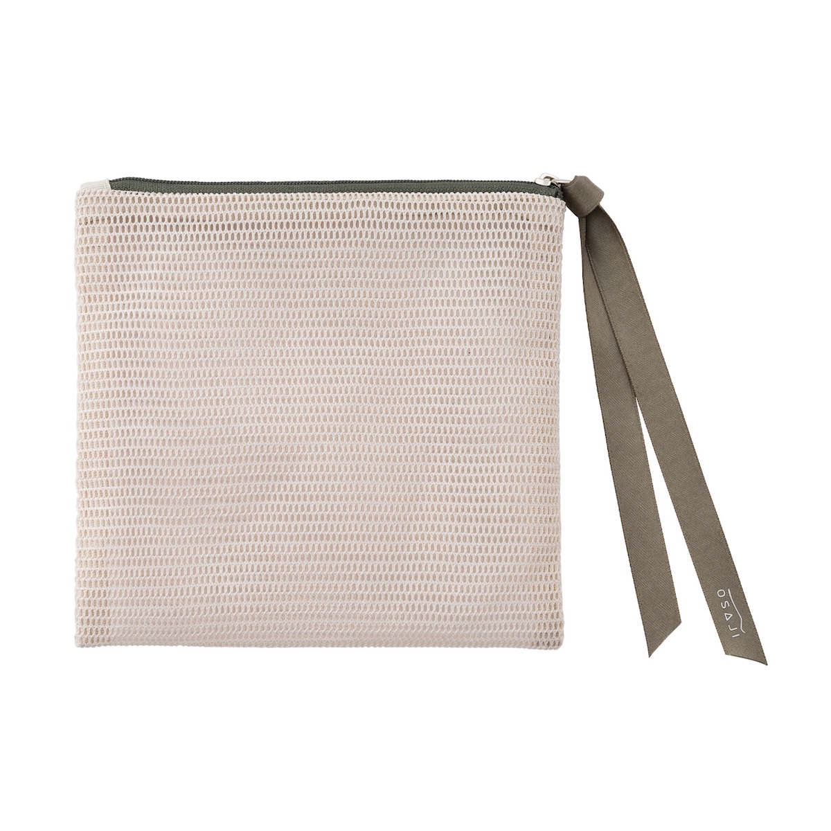 軽やかな透け感のあるメッシュ素材を使用し、「オサジ」ロゴをあしらったリボンを添えたポーチは、中身が一目で確認でき、スキンケアやメイクアップアイテムの整理に便利。日常使いはもちろん旅行や外出時の持ち運びにも使用できるサイズ感が特徴だ。