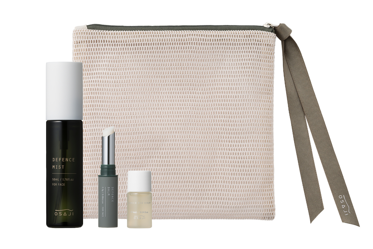 オサジ(OSAJI)」は1月28日、花粉や大気汚染物質から肌を守る“ディフェンスフェイスミスト”(50mL)と“ディフェンスバーム”(2.3g)、ベストセラー美容液の“エンリッチバイオセラム”(4mL)をオリジナルのメッシュポーチに詰め込んだ“ディフェンス シリーズ セット2026”(限定、5500円)を数量限定で発売する。