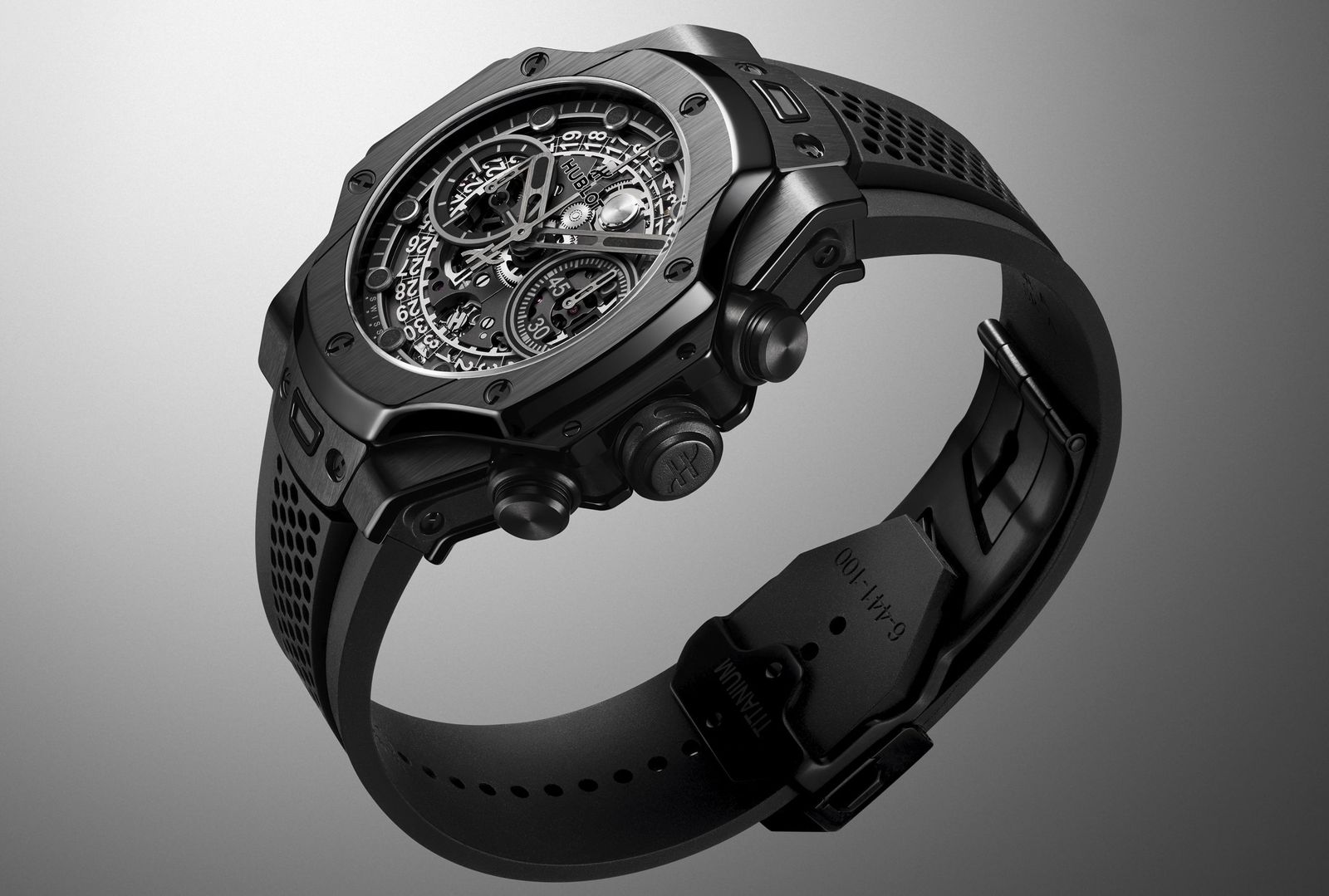 サテン&ポリッシュ仕上げのブラックセラミック製42mmケースに、自社製クロノグラフムーブメント”ウニコ(HUB1280)”を搭載。マットブラックのスケルトンダイアルやハニカム構造のラバーストラップが、サミュエル・ロスのインダストリアルな美学を際立たせる。世界限定200本。価格は402万6000円