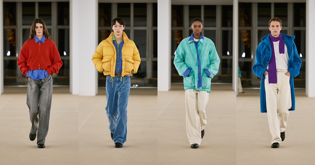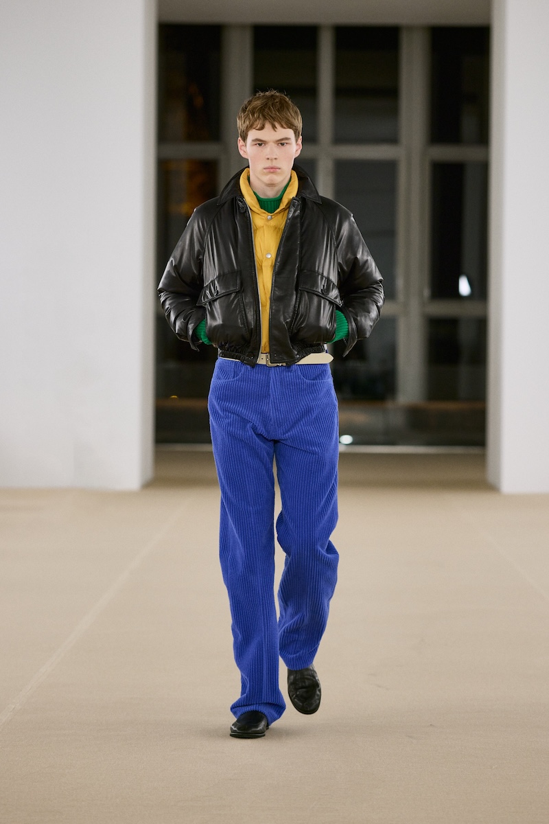 日常に根差したベーシックアイテムという構造自体は、「オーラリー」らしい一貫性を保っている。それでもコレクションに鮮烈な新しさをもたらしたのは、ビビッドカラーが放つ鮮やかなアクセントだった。イエローのダウンジャケット、コバルトブルーのダッフルコート、タイドアップスタイルに合わせたレッドのニットポロ。さらに、明るい色彩のベルトやスカーフがスタイリングの要として機能し、全体にリズムを与えていた。レザーパンツやバッグも、その艶やかな光沢によって視覚的なダイナミズムを高め、もともと優雅なワードローブに潜んでいた官能性をいっそう際立たせる。淡いベージュから穏やかなグリーン、意表を突くポップカラーの組み合わせは、やがてブラックを基調としたイブニングウエアへと移ろい、最後は再びビビッドなカラーパレットへと帰結する。これまで以上に軽く、薄い素材使いも相まって、秋冬でありながら全体の印象は驚くほど軽快だ。