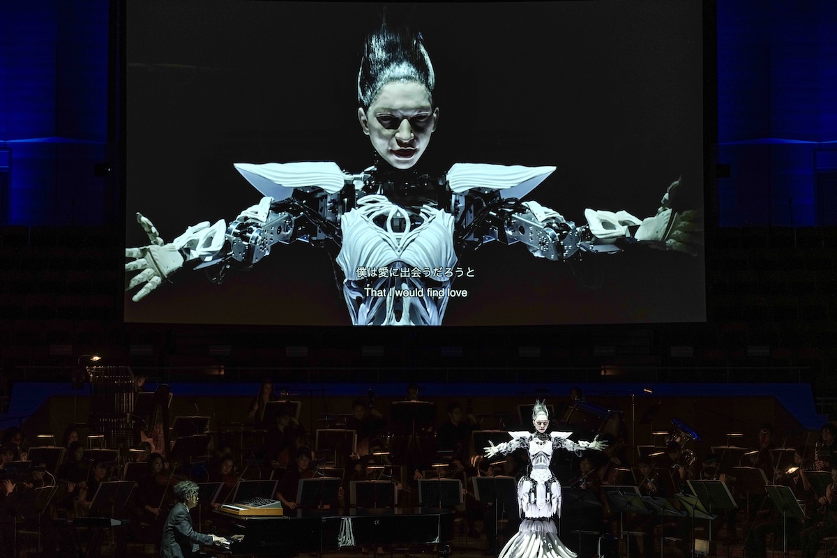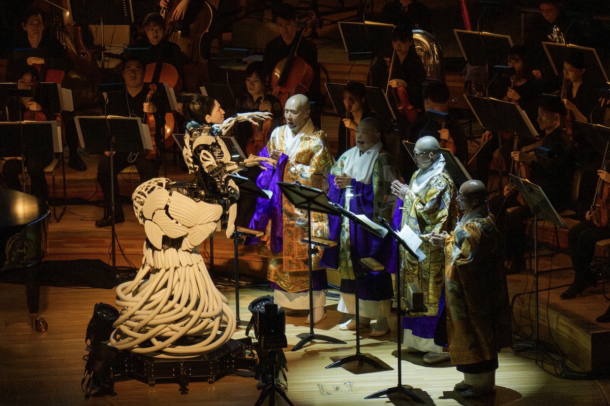 同公演は、AI搭載のアンドロイドが歌い、生のオーケストラやピアノ、電子音、映像、1200年の歴史をもつ仏教音楽・声明を融合し、2022年にはドバイ万博で、23年には、フランス・パリのシャトレ座でも上演したオペラ作品。人間とテクノロジー、東洋と西洋、伝統と革新、生と死など境界や対立を溶かし、新たな希望と調和のモデルを提示する。