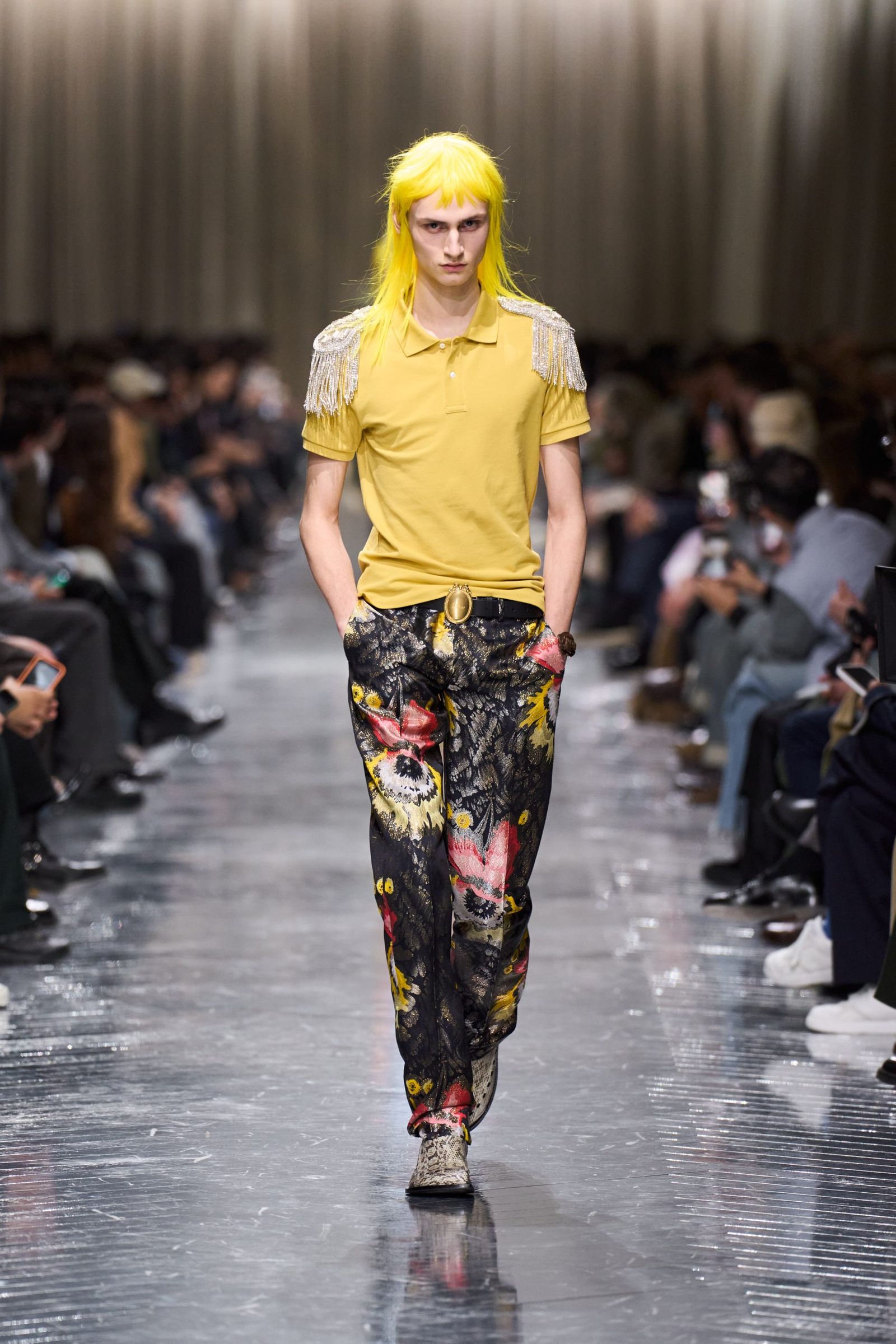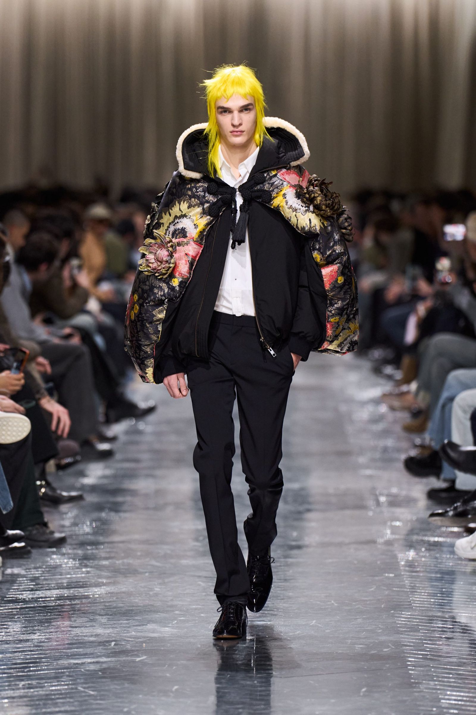 ショーにはスパイクヘアにスパンコールをまとったモデルが登場し、パンクな空気感を漂わせながら幕を開けた。象徴的なのは、1948年のドレス“カプリス”に由来するラップスカートやオリエンタルなムードを帯びたスパンコール刺しゅうが施されたテキスタイルだ。ボリュームを強調したシルエットは身体を包み込むように構築され、同系のブロケードは、シアリングスリーブを備えたロングコートにマントのように重ねて装飾性を強調した。ファーのフィールドジャケットやパファーのロングコートによるコクーンシルエットも今季の鍵となる一方、クロップド丈の“バー”ジャケットはネルシャツと、テールコートはニットと合わせるなど、格式を軽やかに更新。ビジューで作られたエポーレットやメンズ用メダリオンモチーフのボタンなどの提案を通じ、性差や伝統の境界を鮮やかに横断してみせた。
