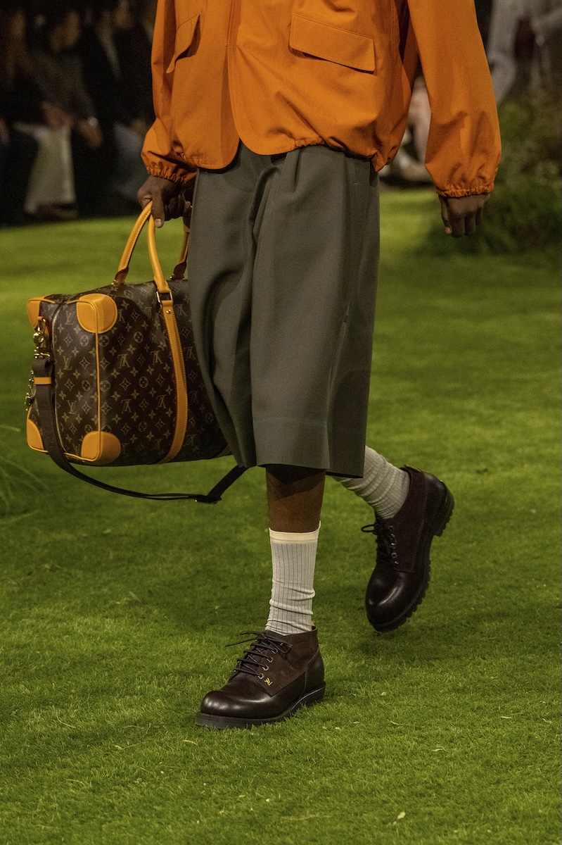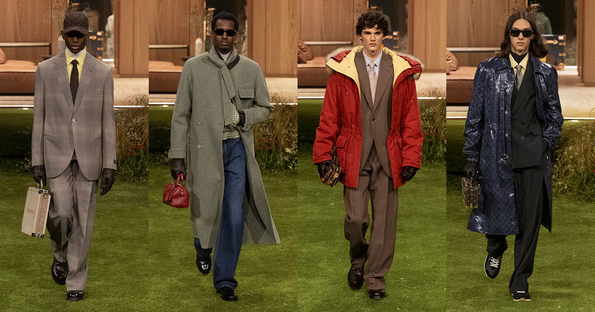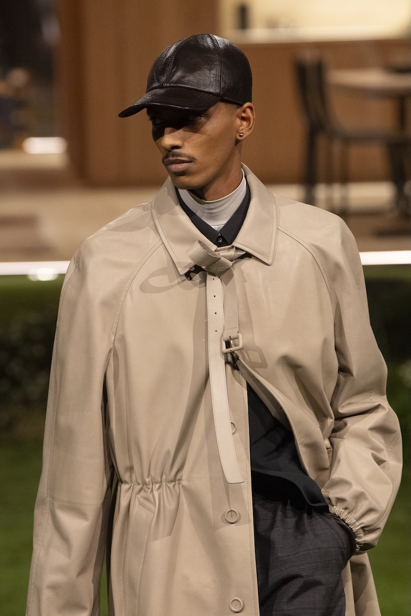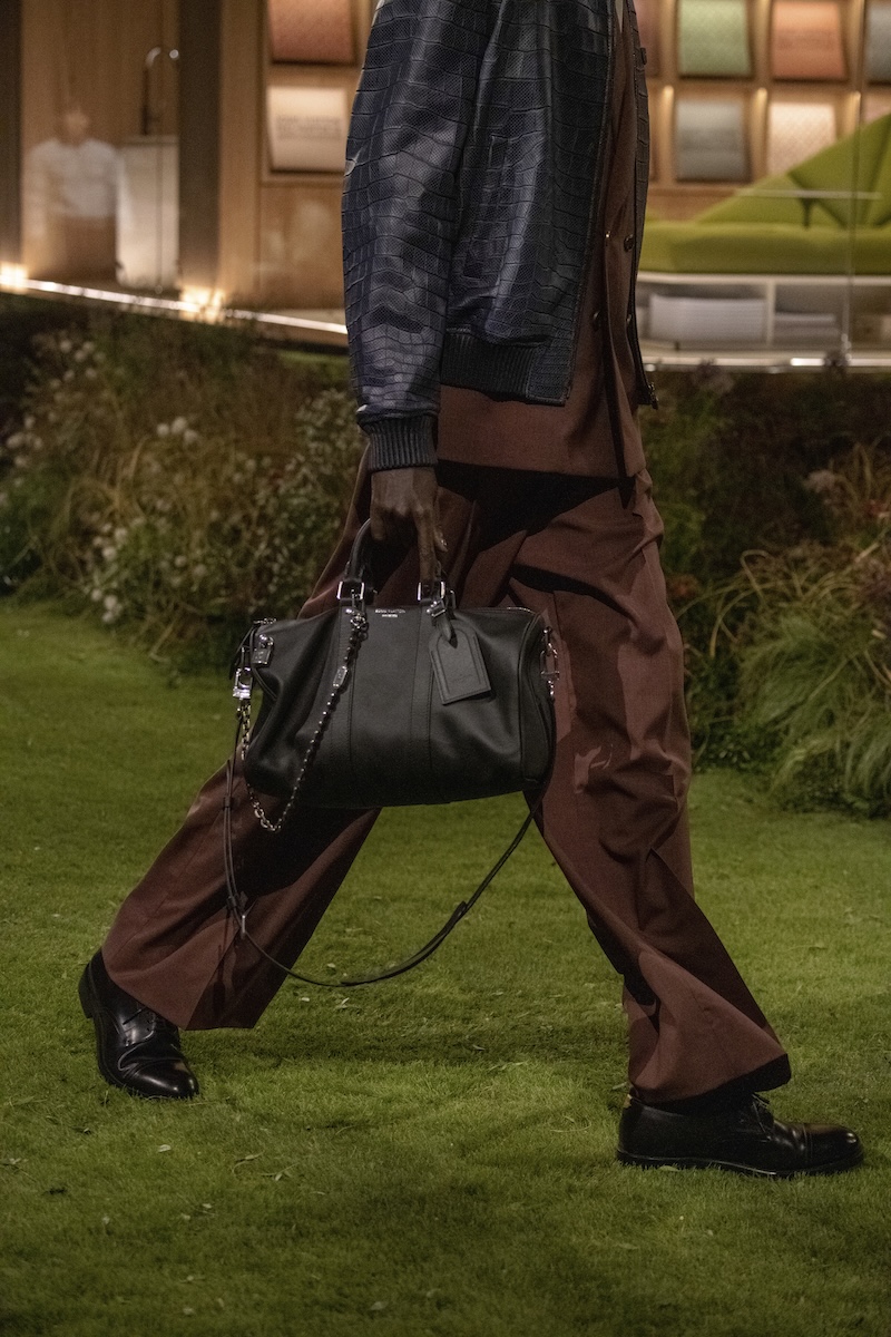 スタイルのアクセントとなったのは、コートやブルゾンの首元にあしらった長いベルトを結んだディテールと、大半のルックに用いたモックネックのアンダーレイヤー。カジュアルなテーラードジャケットの裾を絞ることで生み出した丸みのあるシルエットも印象的だ。ショーの定番となっているトランクには、フランス・アニエールのルイ・ヴィトン邸に見られるアールヌーヴォー様式の花をモチーフにしたステンドグラス窓を再現。メゾンのヘリテージとのリンクを示すとともに、そこに「未来への窓」という意味を込めた。