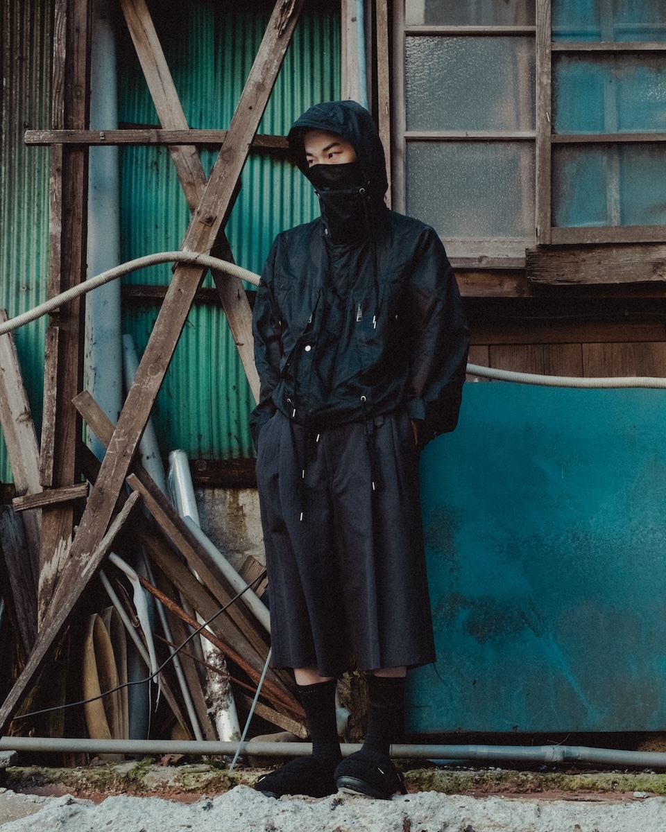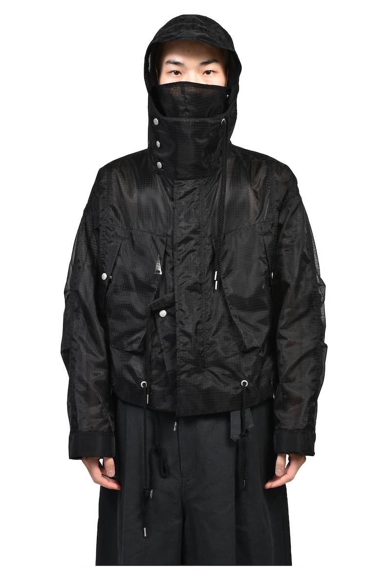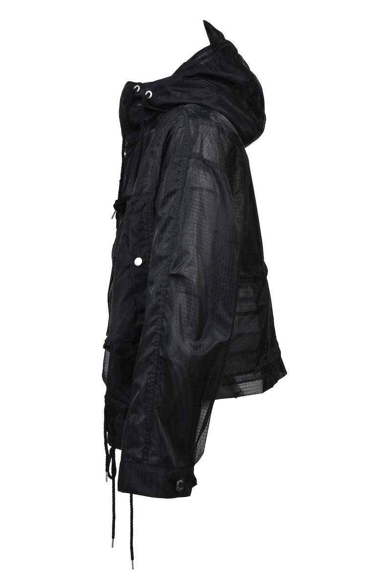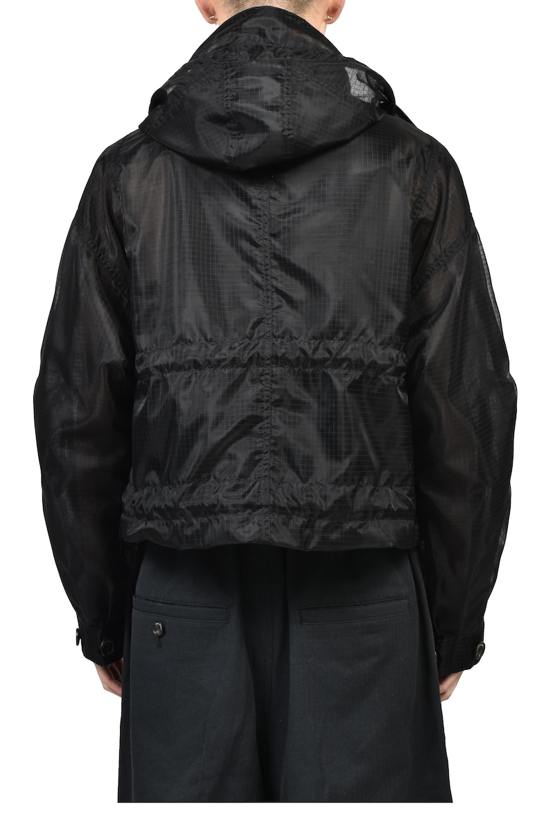 シアーリップストップはシルクのような軽やかさが特徴のナイロン分繊糸を使用する。ハリ感を表現するジッガー染色機で染め上げ、シワのない綺麗な表情に仕上げた。0、1、2の3サイズを用意する。