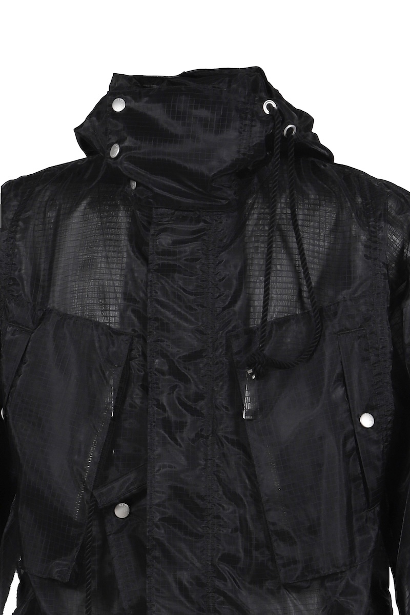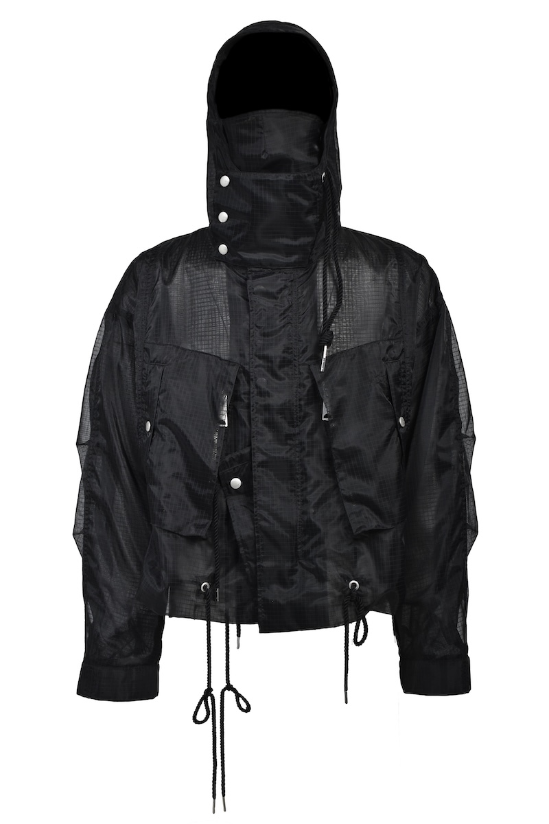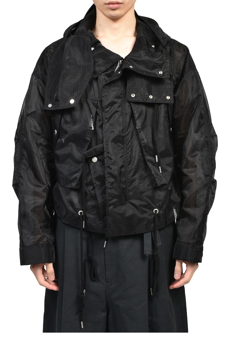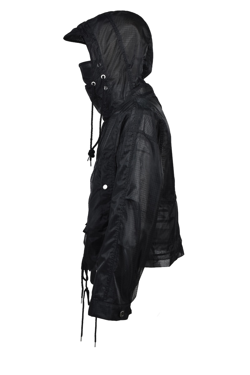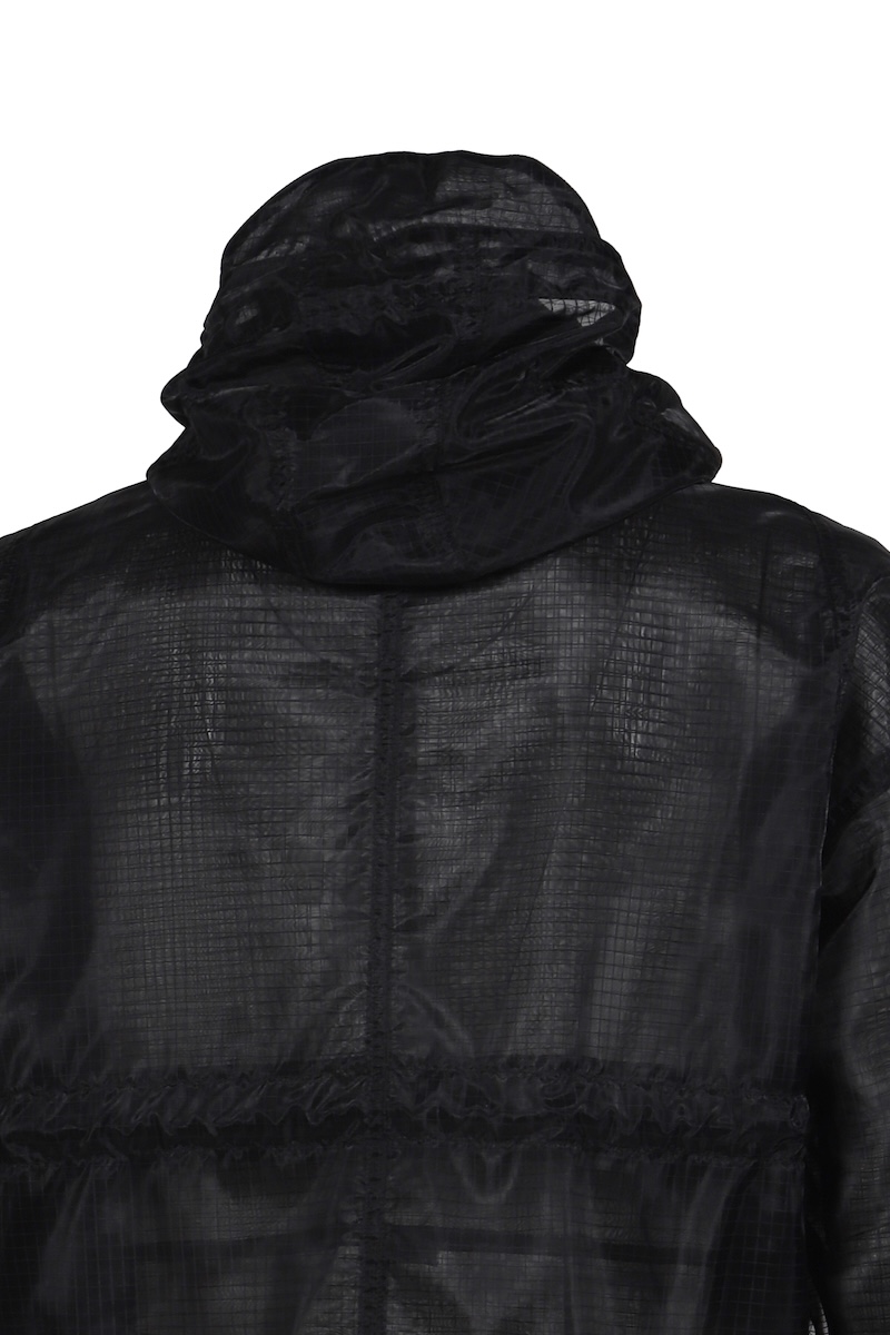 シアーリップストップはシルクのような軽やかさが特徴のナイロン分繊糸を使用する。ハリ感を表現するジッガー染色機で染め上げ、シワのない綺麗な表情に仕上げた。0、1、2の3サイズを用意する。