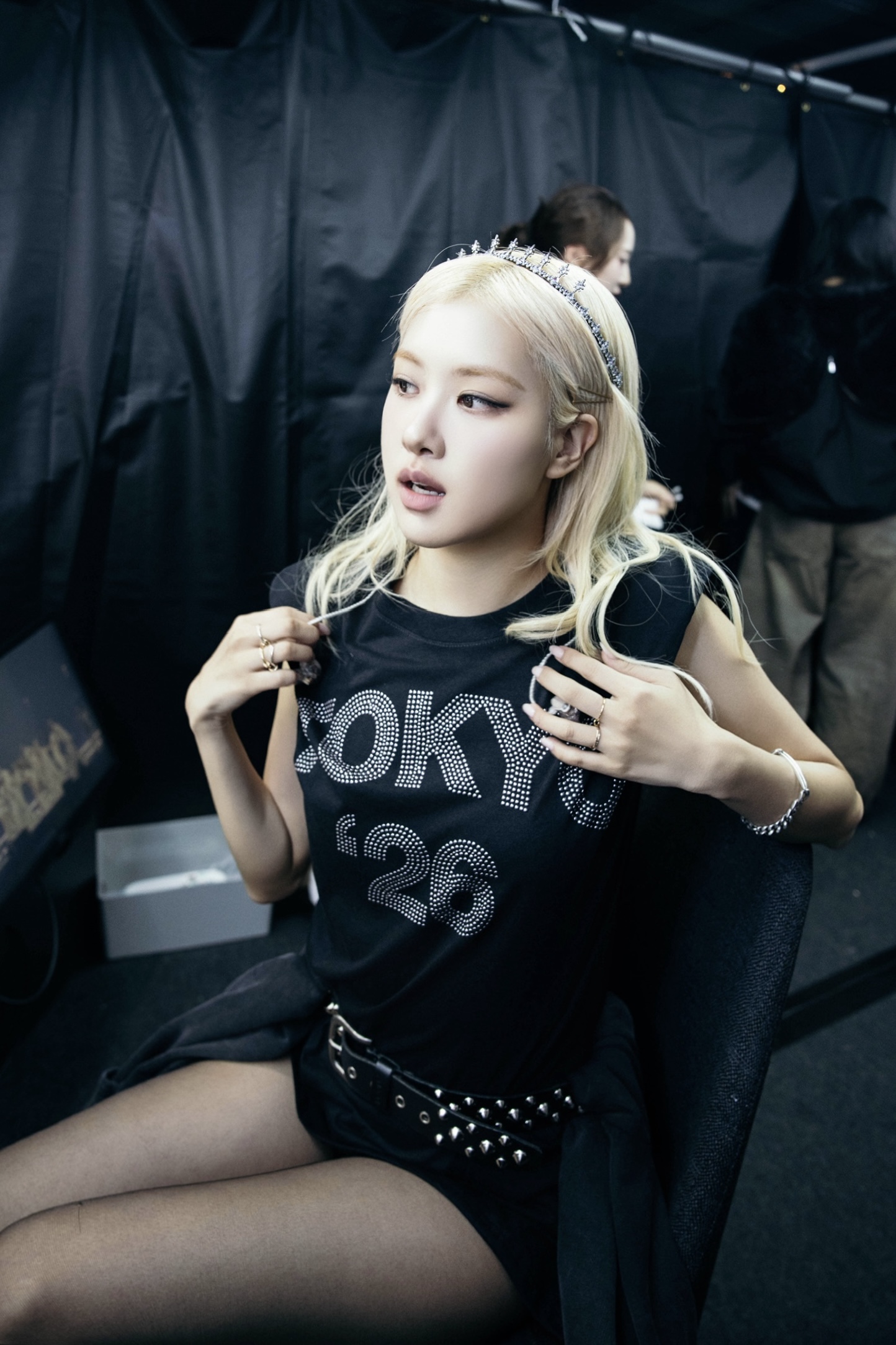 最終日は、ビンテージの「リーバイス」イーグルグラフィックTシャツをチューブトップにリメイクしたトップスに、手作業で“TOKYO 26”の文字をスタッズ配置したベルトをアクセントとしてプラス。ボトムスには、エレクトリックブルーとシルバーのストライプが印象的なレザーのミニスカートを合わせた。さらに、2日目も着用していた特注のウォッシュドブラックデニムトラッカージャケットを再び羽織る場面も。ロゼらしいエッジィなルックを完成させた。