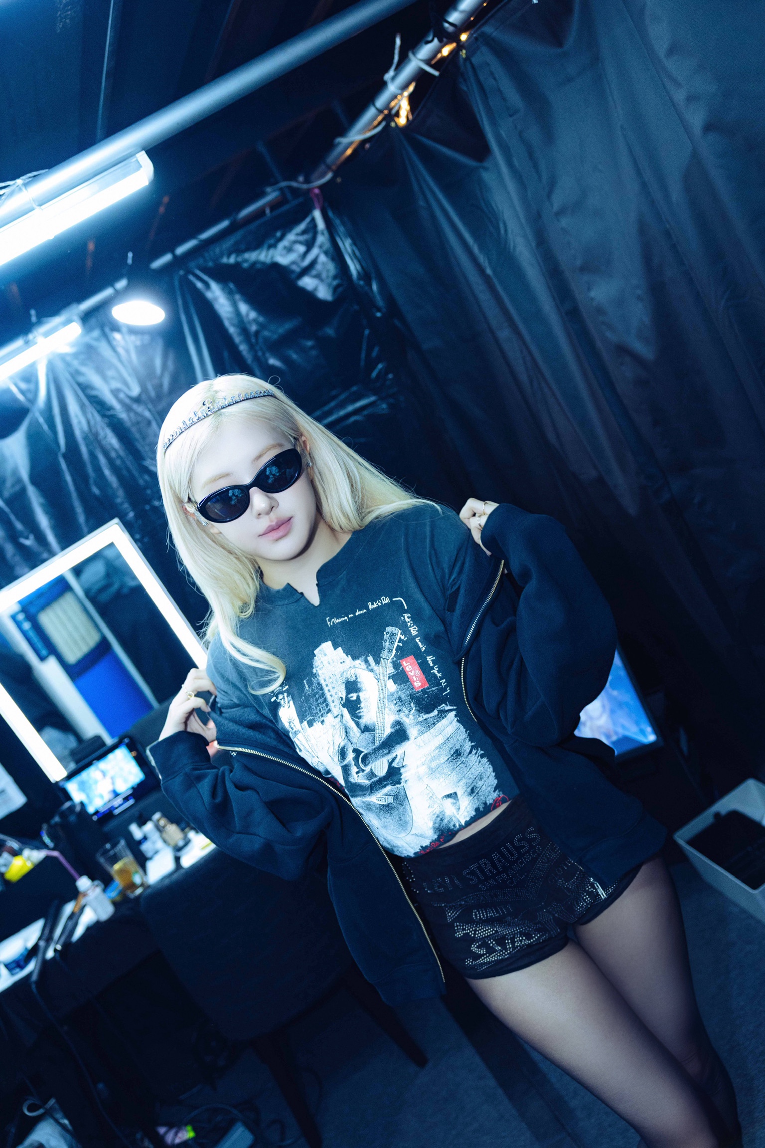2日目は、「リーバイス」のビンテージTシャツをチョイス。ボトムスには、ブランドのアイコニックな“ツーホースマーク”を大胆にスタッズで表現したヌバックレザーショーツを合わせた。このスタイルをベースに、初日に着用したフーディーをレイヤードしたり、テーラーが手作業でスタッズを施したウォッシュ加工のブラックデニムトラッカージャケットを羽織ったりと、曲ごとにスタイリングをチェンジ。ヘッドには小ぶりの上品なティアラを合わせ、ロックな装いに華やかさを添えた。