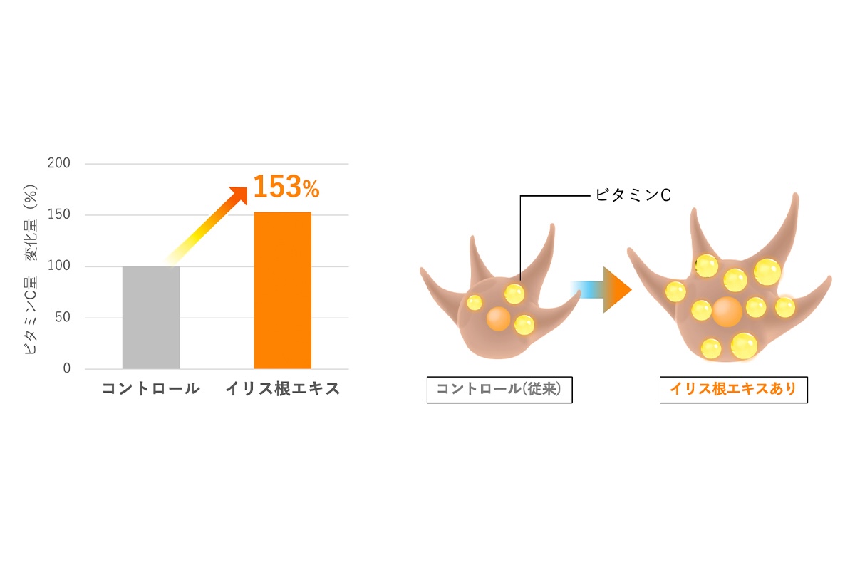 「周囲にたくさんビタミンCが存在しても、細胞がお腹いっぱいで取り込めないイメージです。細胞にはビタミンCを取り込むチャンネルと排出するチャンネルがあり、常に細胞内のビタミンC濃度を一定に保っているためです」。この研究から生じたのが、いかに細胞内のビタミンC濃度を“高止まりさせるか”という新たな課題だ。細胞内ビタミンC濃度に寄与する300以上の素材をスクリーニングしたところ、イリス根エキスにたどり着いたという。