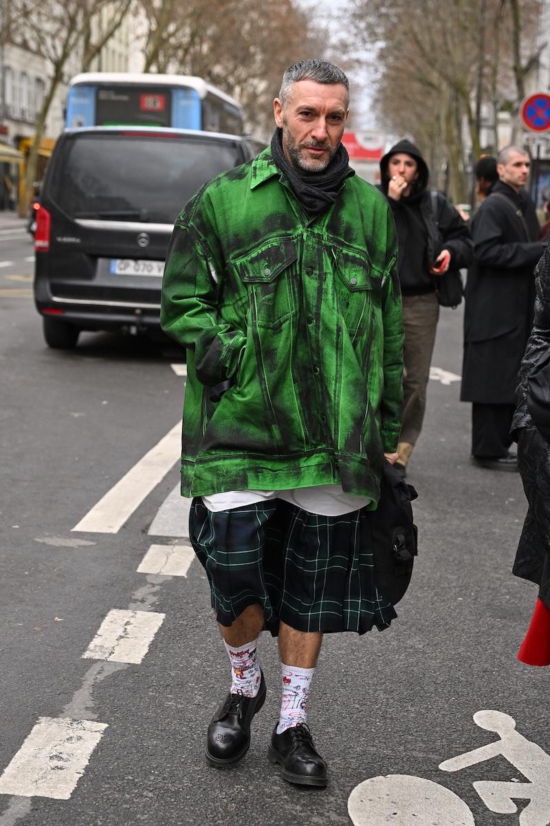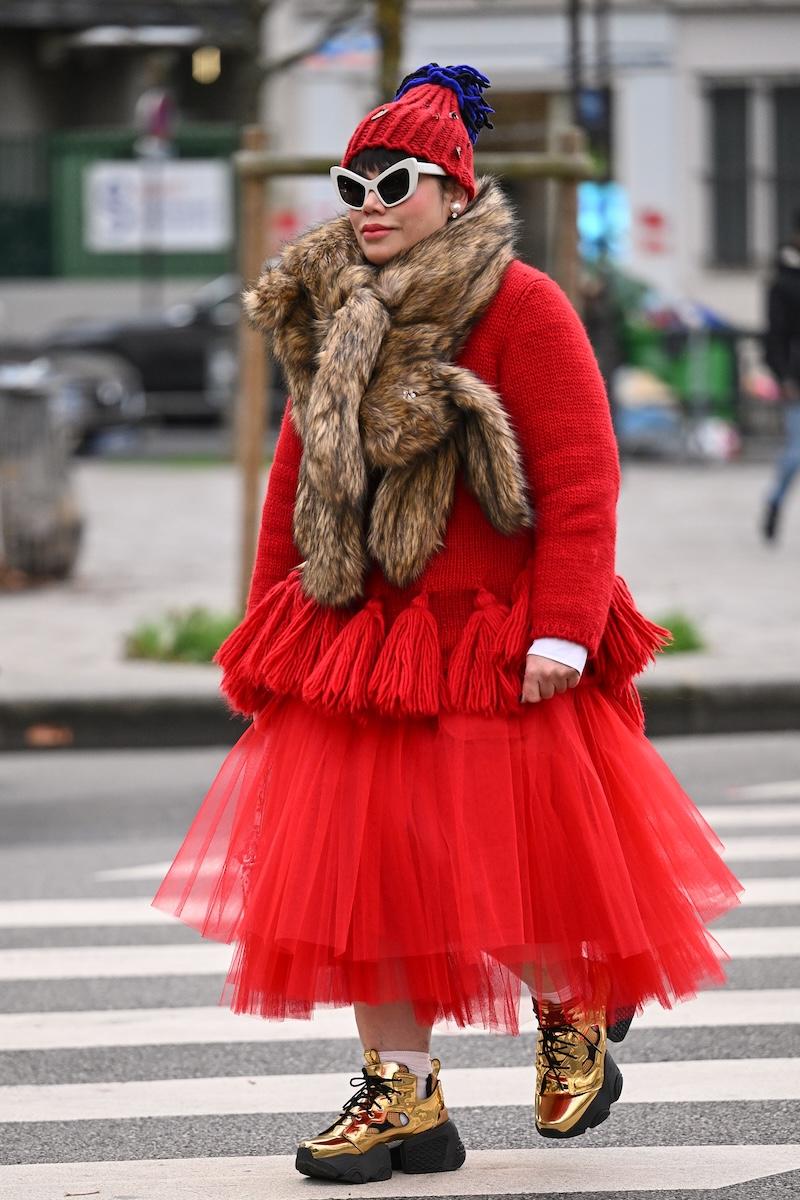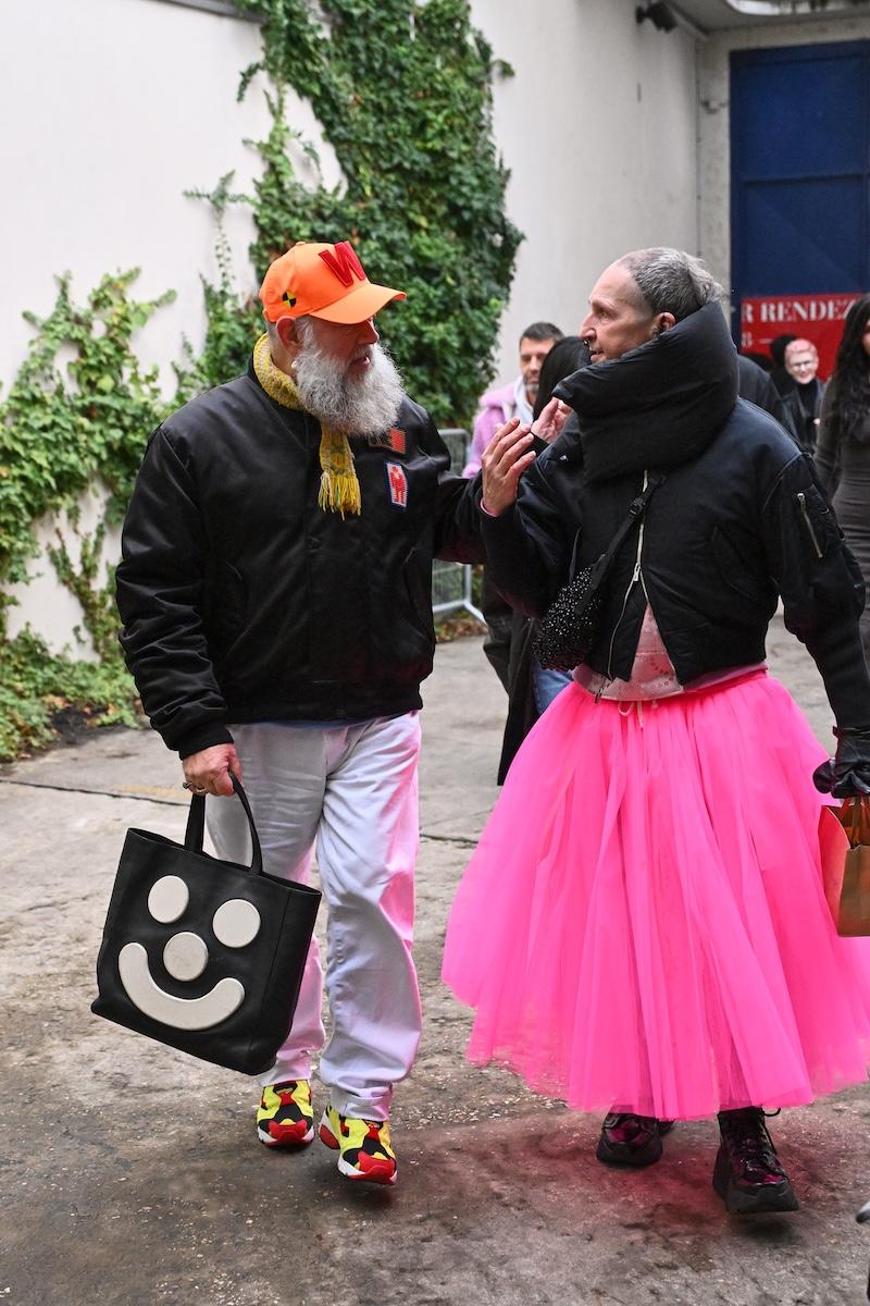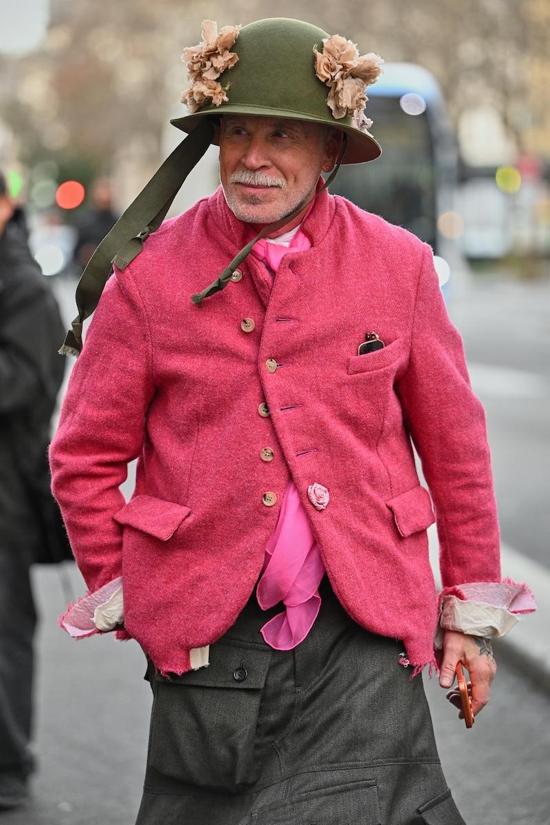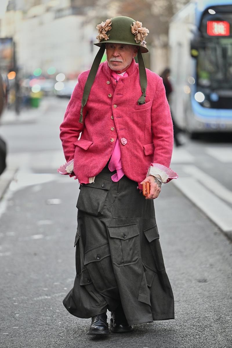 「コム デ ギャルソン・オム プリュス(COMME DES GARCONS HOMME PLUS)」は、2026-27年秋冬メンズ・コレクションをパリで現地時間1月23日に発表した。ブラックやグレーに覆われがちだった今季のパリメンズの会場周辺で、一際鮮やかな存在感を放っていたのが同ブランドのオフランウエイだ。ピンクやレッド、蛍光カラーを取り入れた来場者のスタイリングが、冬のパリに強いコントラストを生み出していた。“希望”や“祈り”を色に託してきた川久保玲デザイナーの思想を体現するかのように、そこには今季のパリでもっとも平和的で、愛に溢れた光景が広がっていた。