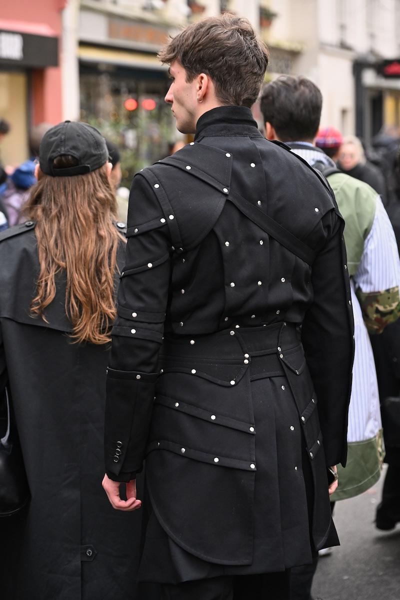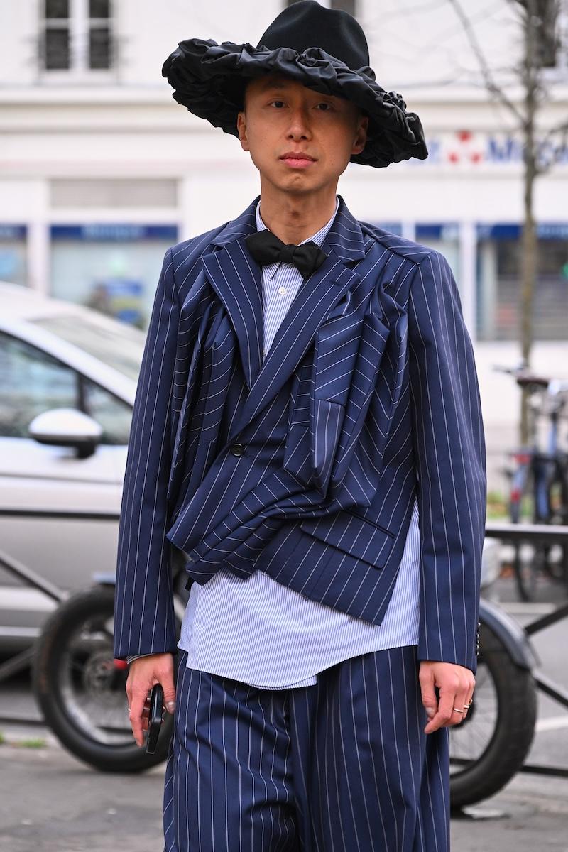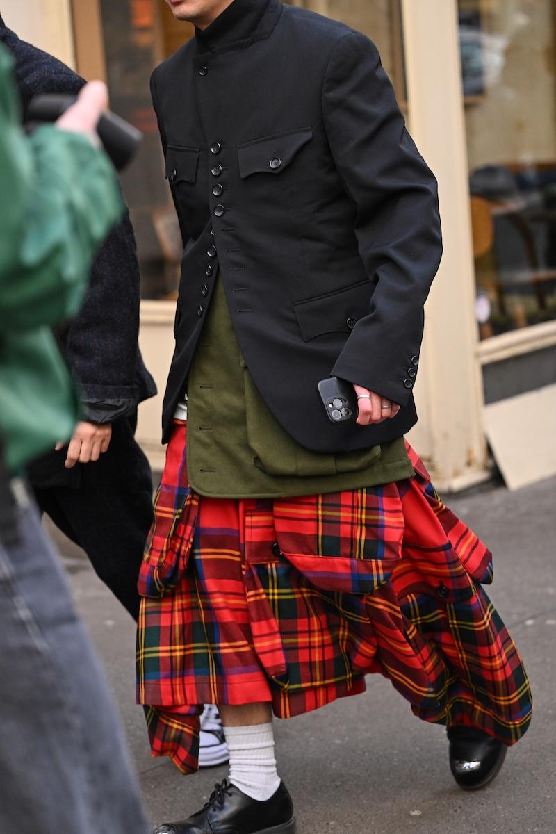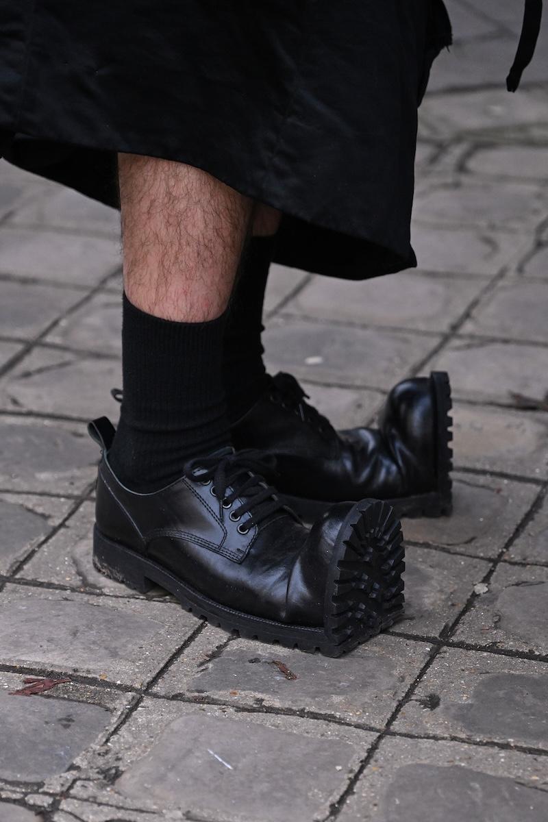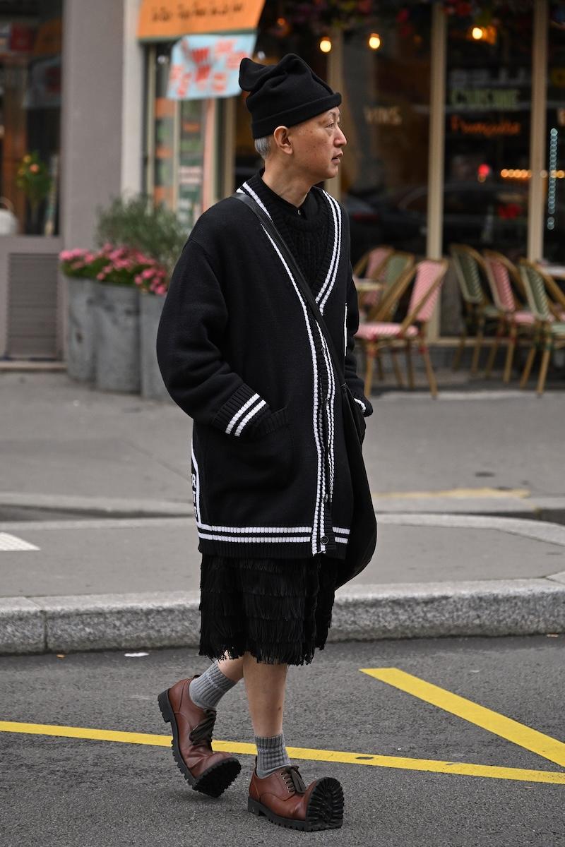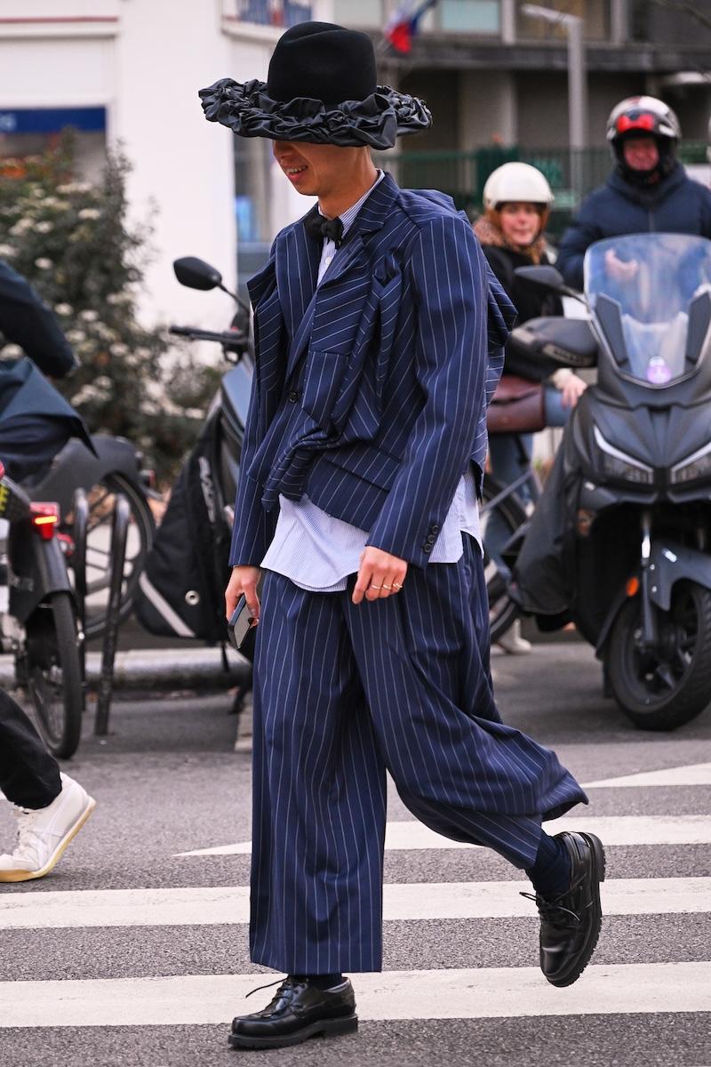 最新シーズンのアイテムに過去のコレクションをミックスし、同日にショーを行った「ジュンヤワタナベ(JUNYA WATANABE)」を交差させる装いも多く見られた。足元では、「キッズ ラブ ゲイト(KIDS LOVE GAITE)」との前衛的なコラボレーションシューズが存在感を発揮。さらに加えて、同ブランドのショーでも帽子を手掛ける、パリ拠点の日本人デザイナーによる「ヒヅメ(HIZUME)」のヘッドピースでスタイリングを完成させている。